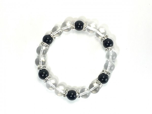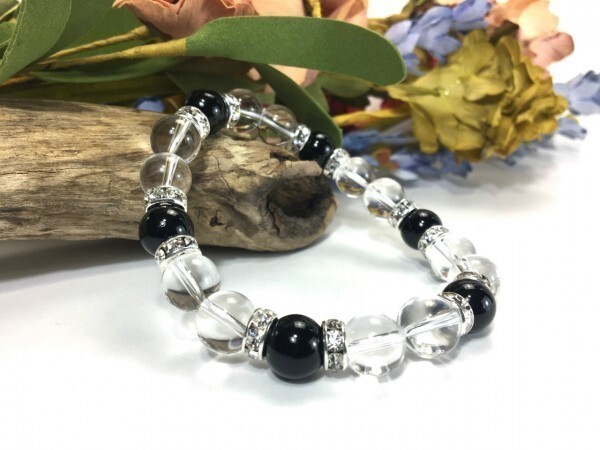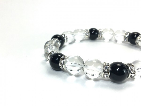 こちらは、水晶とオニキスを組み合わせたブレスレットです。間にはロンデルを挟み高級感あるデザインに仕上がっています。石大きさは腕にも馴染みやすいように10mm玉で内径約18cm(伸可能)です。数に限りがございますので気になる方はお早めにどうぞ。サイズ調節も可能ですのでサイズ調節の場合は取引ナビにてご一報くださいませ。(サイズ調節無料です)