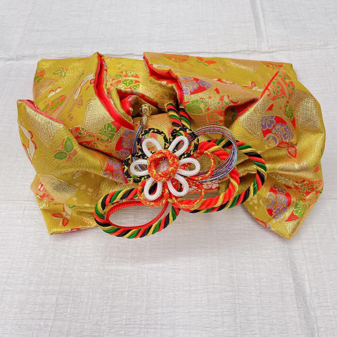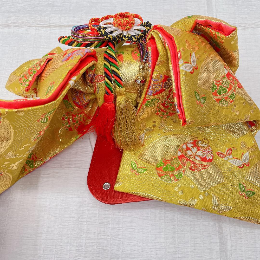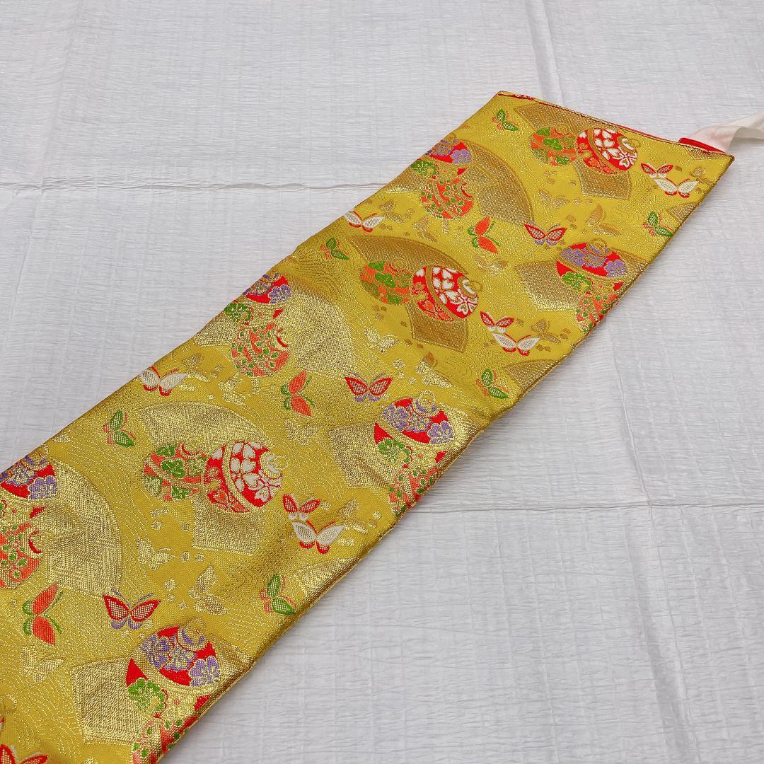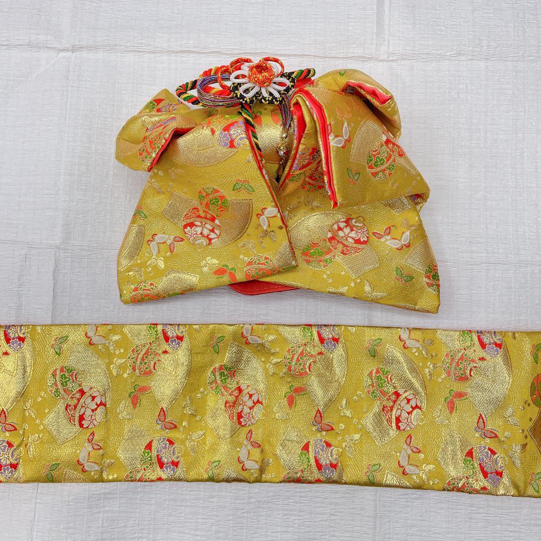 少し暗めの黄色の地色にゴールドの糸で、キラキラします。チョウや手毬の柄です。