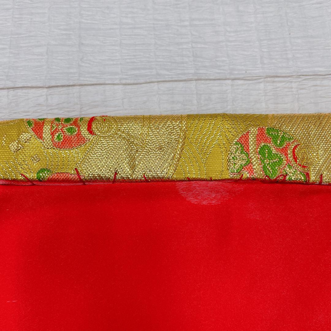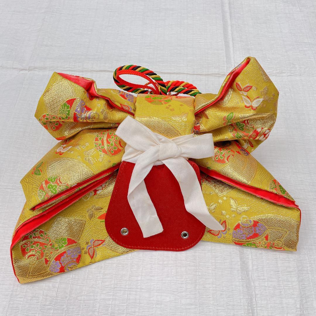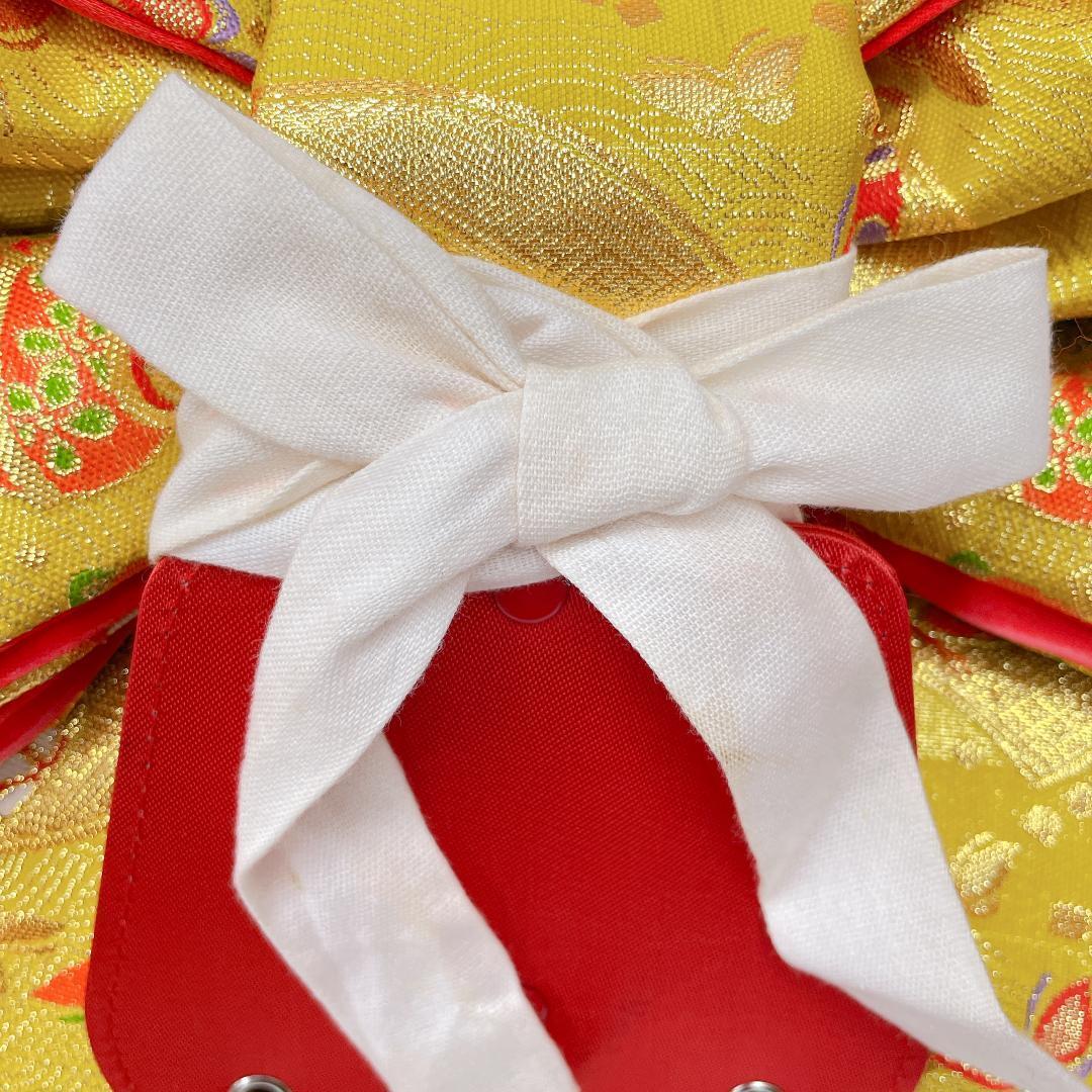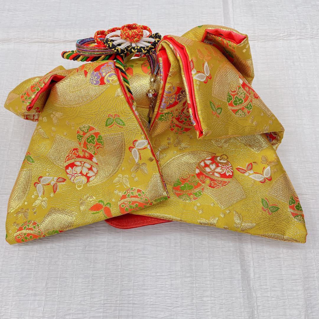少し暗めの黄色の地色にゴールドの糸で、キラキラします。チョウや手毬の柄です。