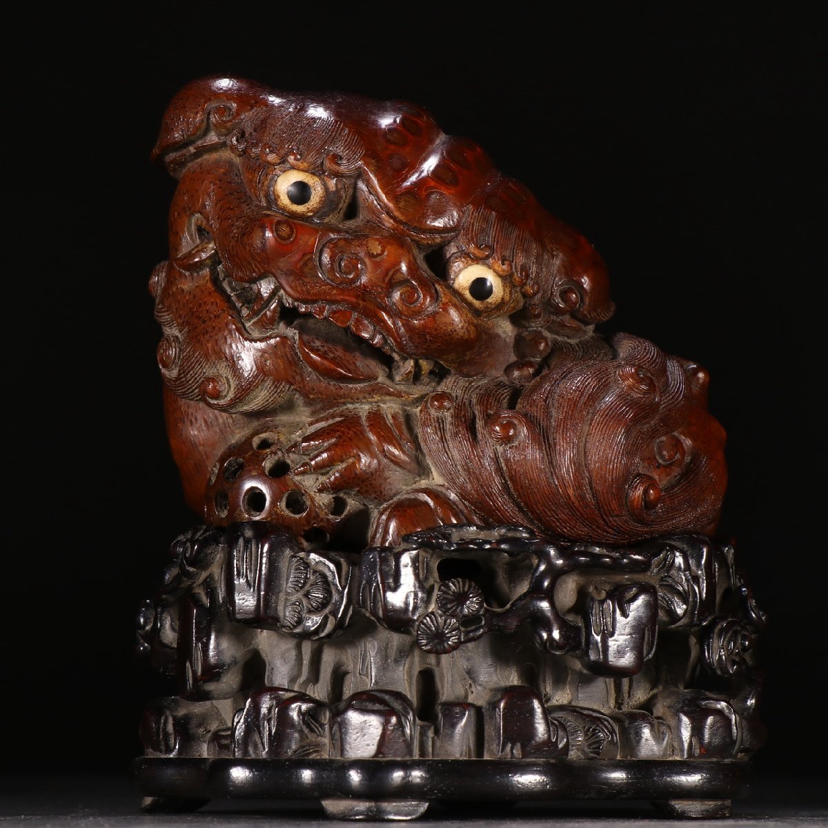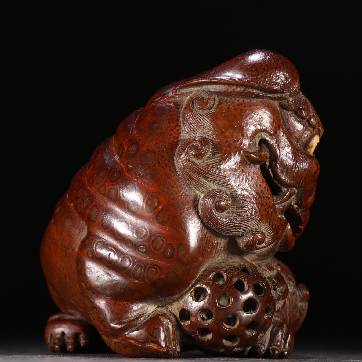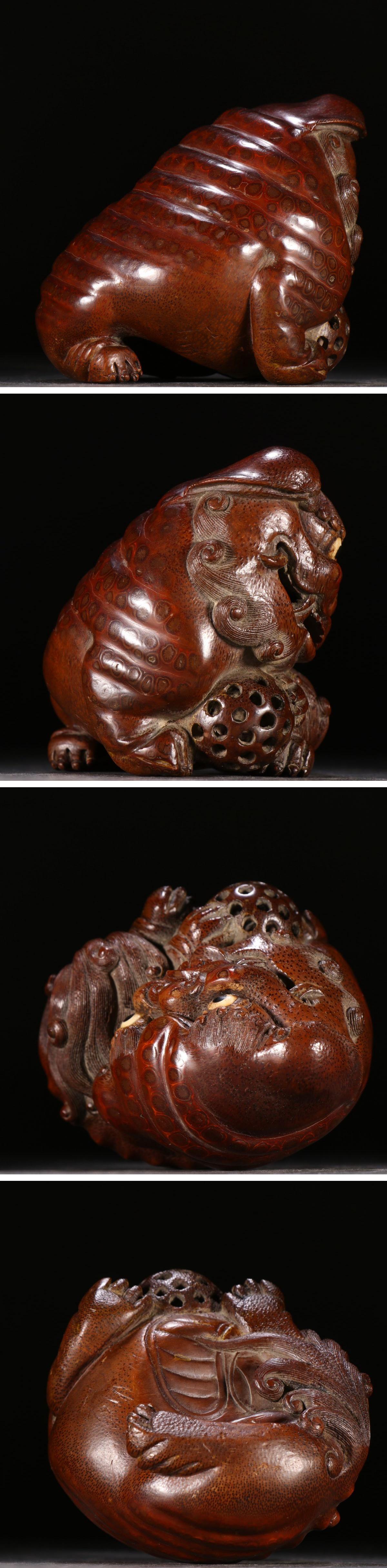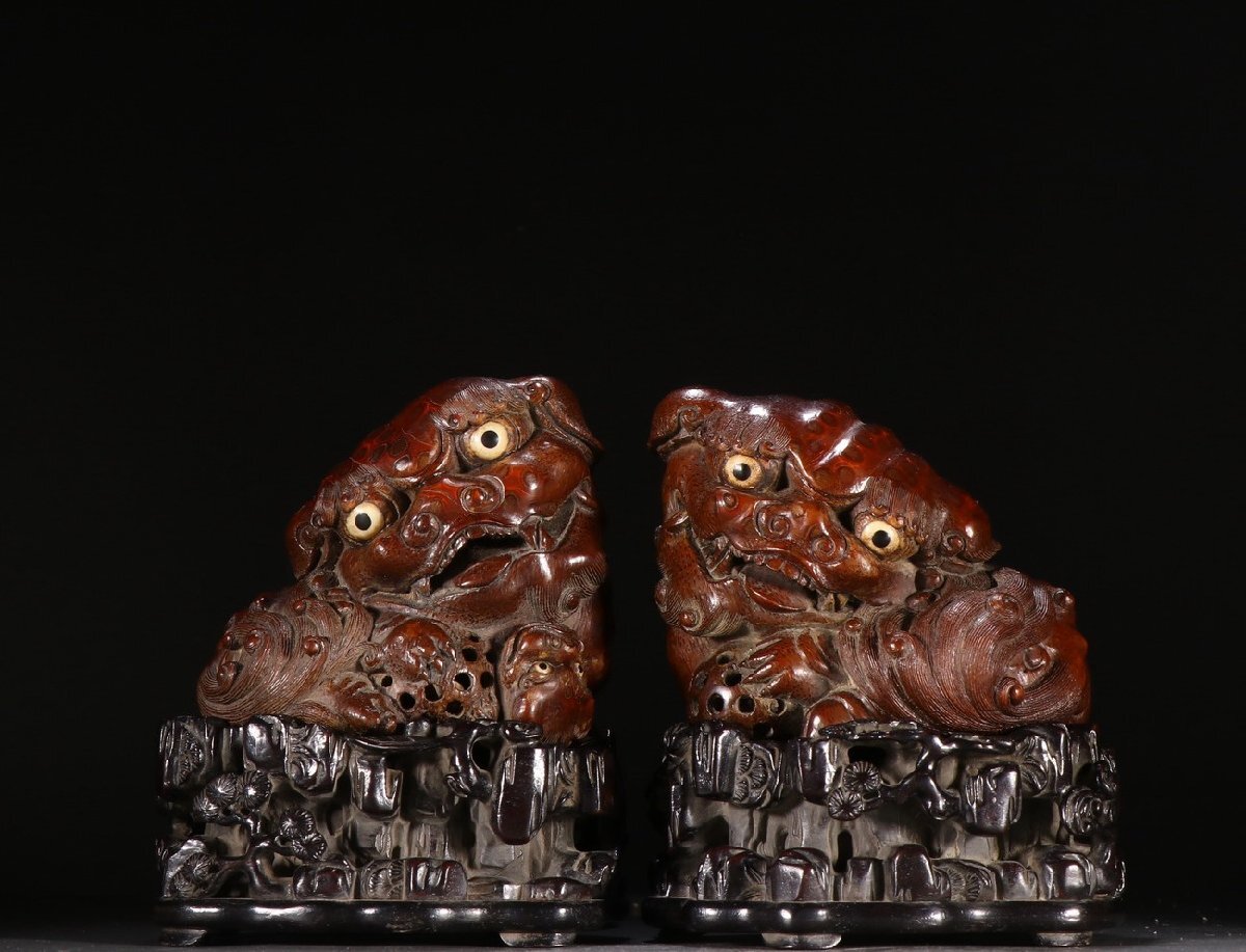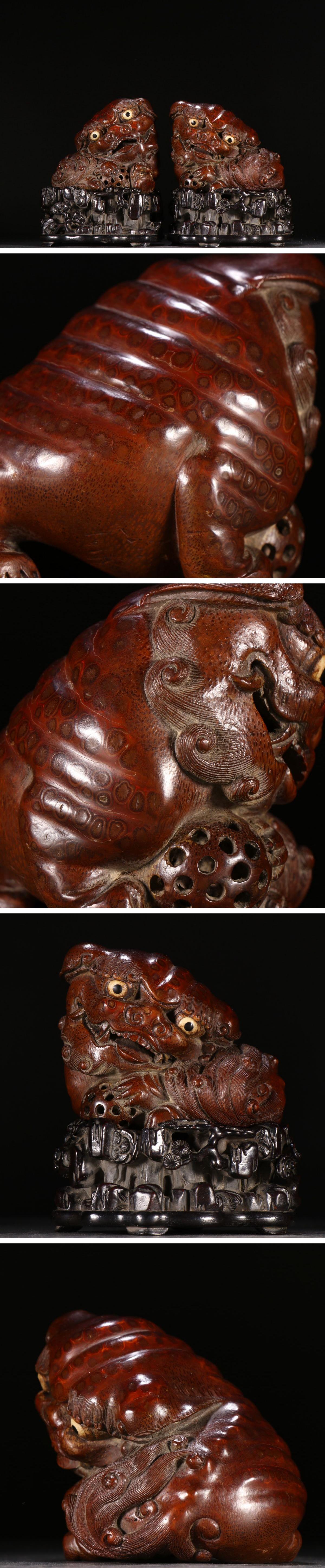【清】某有名オークション購入 清時代 古竹彫 唐獅子紋置物一双 材質保証 当時物保証 古置物 古擺件 古美術 時代コレクション7L9-BB2
