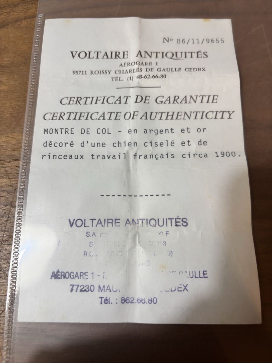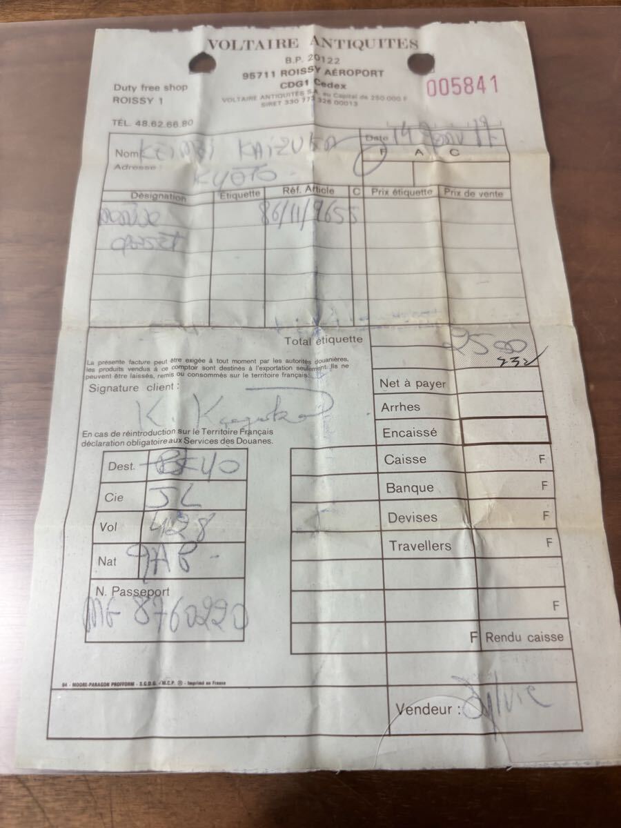 また、1980年代にパリ・シャルルドゴール空港の VOLTAIRE ANTIQUITS にて購入された際の保証書・領収書が残っており、由緒の裏付けとなる資料も揃っています。