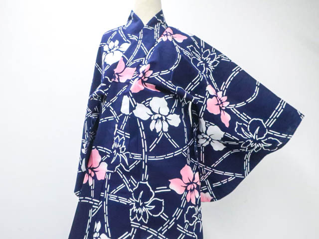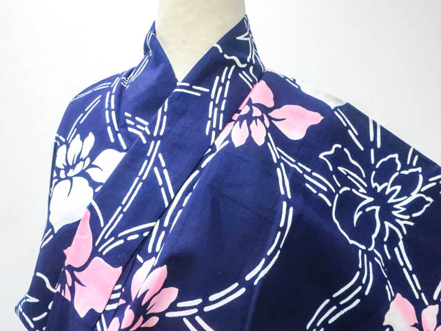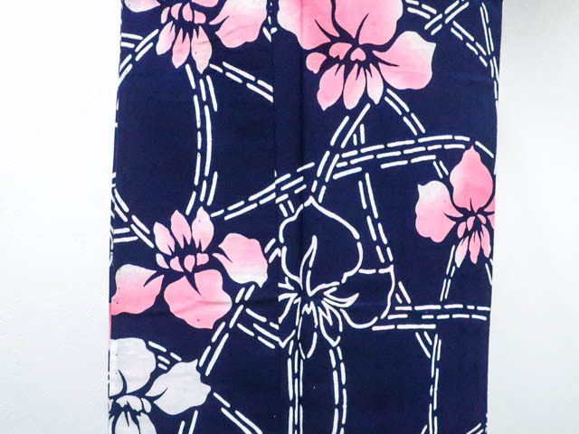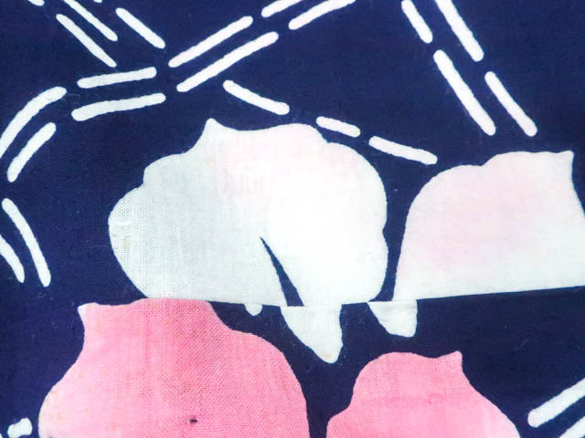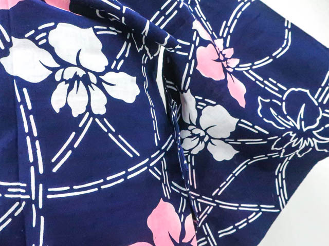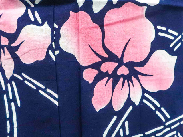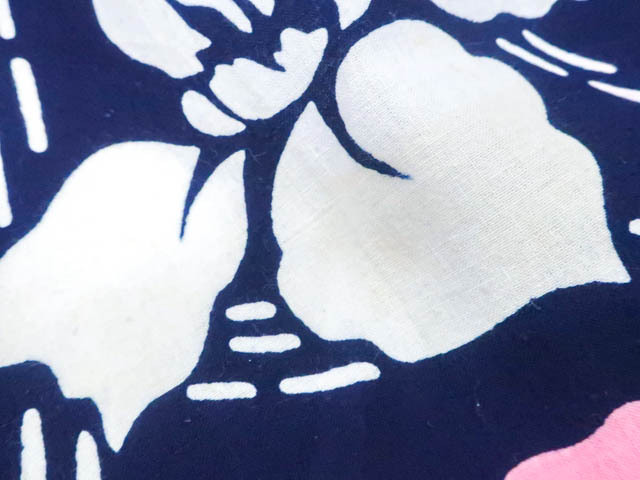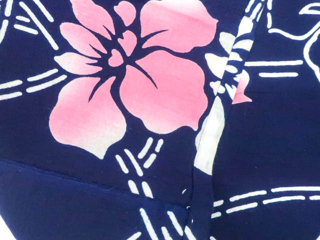 リサイクル商品のため、所々花柄にしみがございます。 左背付近に染色うつりがございますが着用可能なお品です。 肩当付でございます。 地色は 紺です。 1枚目の画像が近いお色かと思われます。 素材は綿です。 |