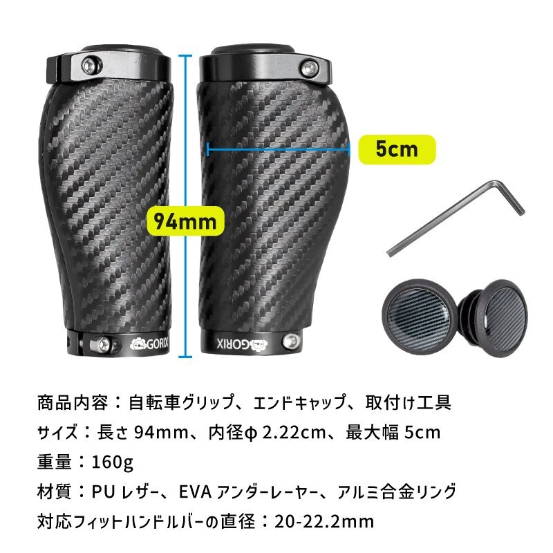 カーボン調柄が落ち着いた印象をあたえる自転車用グリップ。 両方長さ94mmとショートサイズの短いショートグリップになります。 ハンドルにシフトがありハンドル部分が短いタイプの自転車の方におすすめです。 このグリップの特徴は長時間握っても疲れにくいエルゴデザイン。 滑らかな曲線が力を分散して手首をサポートします。 また手の平に接し体重が掛かる部分にシリコンクッションパッドを配置する事で地面からの衝撃を吸収し負担を軽減します。 表面はまるで本革のようなPUレザーを採用。軽量で弾力性もありソフトな握り心地。 クロスバイクやミニベロ、mtb、電動自転車やままちゃりなどの様々なフラットハンドルに最適。 [エルゴデザイン] 長時間ハンドルを握り続ける手の平、また手首の負担やストレス軽減。 手の平をグリップにベタっと乗せる事により体の重みが手の平に分散し、痛みと疲れは大幅軽減。 [軽量で衝撃に強い] 衝撃吸収向上高弾力EVAアンダーレーヤーはクッション性と通気性が高い [ダブルロックオン] 両サイドをネジ止めする事でしっかりと固定されてズレる事もない。 またグリップの交換や装着作業がスムーズに行えます。 ネジを固定する六角工具は付属していてすぐに作業できる。 [様々な自転車に] フラットハンドルバーの直径:22.2mm ほとんどのタイプの自転車用フラットハンドルに適しています。 商品内容自転車グリップ、エンドキャップ、取付け工具 サイズ長さ94mm、内径φ2.22cm、最大幅5cm 重量160g 材質PUレザー、EVAアンダーレーヤー、アルミ合金リング 対応フィットハンドルバーの直径20-22.2mm 商品は入荷によりキズがある場合があります。 傷や細かい汚れが気になる方や神経質な方は入札をお控え下さい。 入荷時期により予告無く一部仕様変更する場合が有ります。 カラーはディスプレイ種類環境等により実物と異なって見える場合がございます。 |