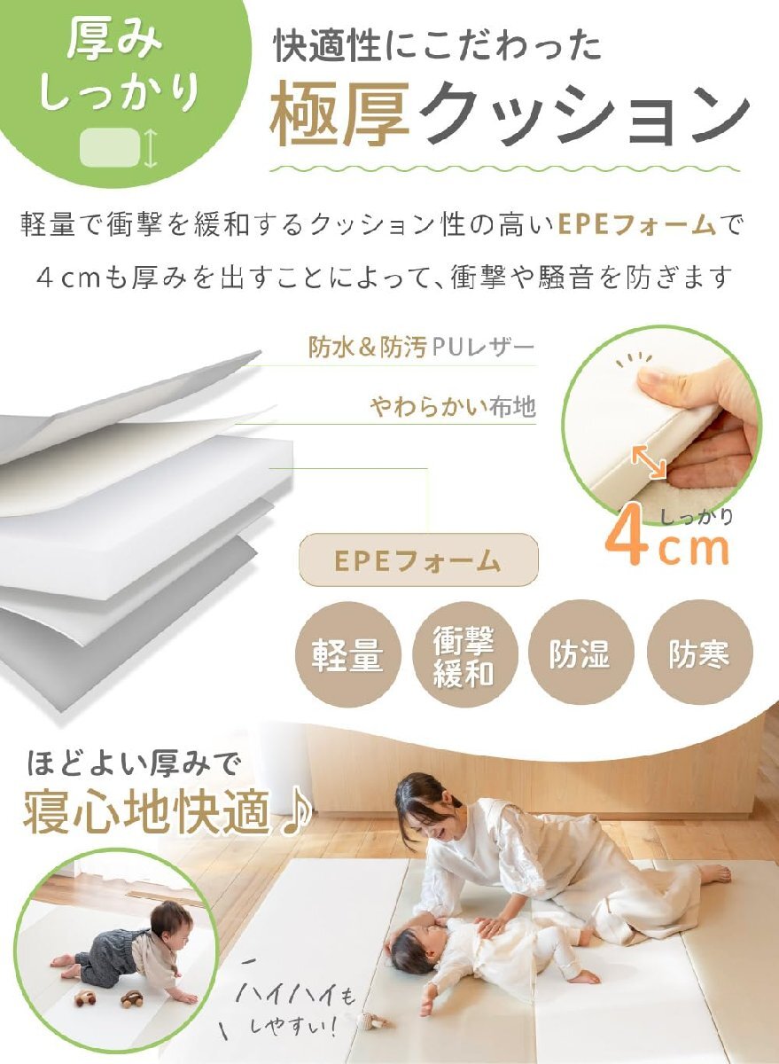 【EPE素材を採用】表面は水や汚れをはじくPU素材、プレイマットの中心部は、EPE素材を採用。EPE素材は、軽量で衝撃を緩和するクッション性に優れた素材。高密度素材なので、湿気や寒さを防ぐのにも効果的です。他製品によく使われている素材と比較しても、EPE素材は優れた効果を発揮!防水性・弾力性に優れ、軽量、においも気になりません。快適さと機能性を兼ね備えています。