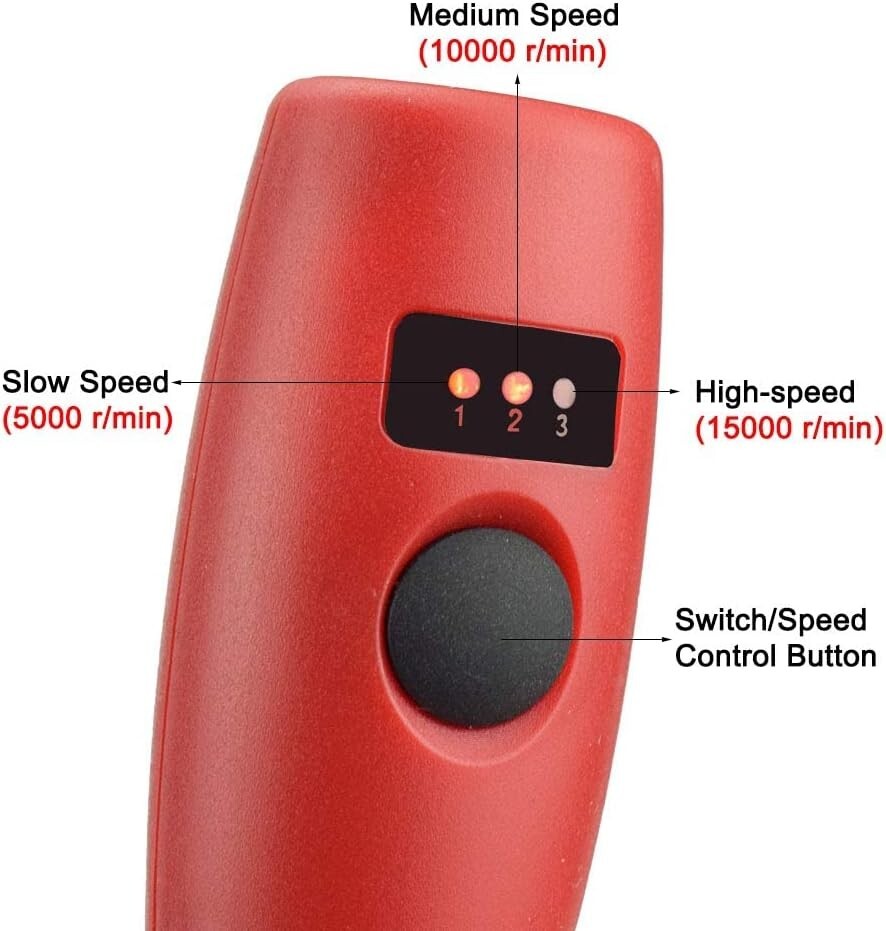 【3段変速可能】ミニルーター本体付属のボタンを押すだけで回転数を5000、10000、15000rpmmin-1の3段階に調整が可能で、作業内容や材料によって最適なトルクを設定できます。