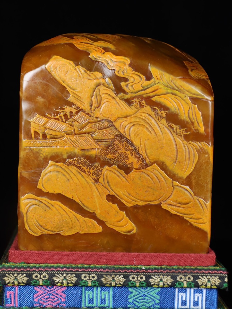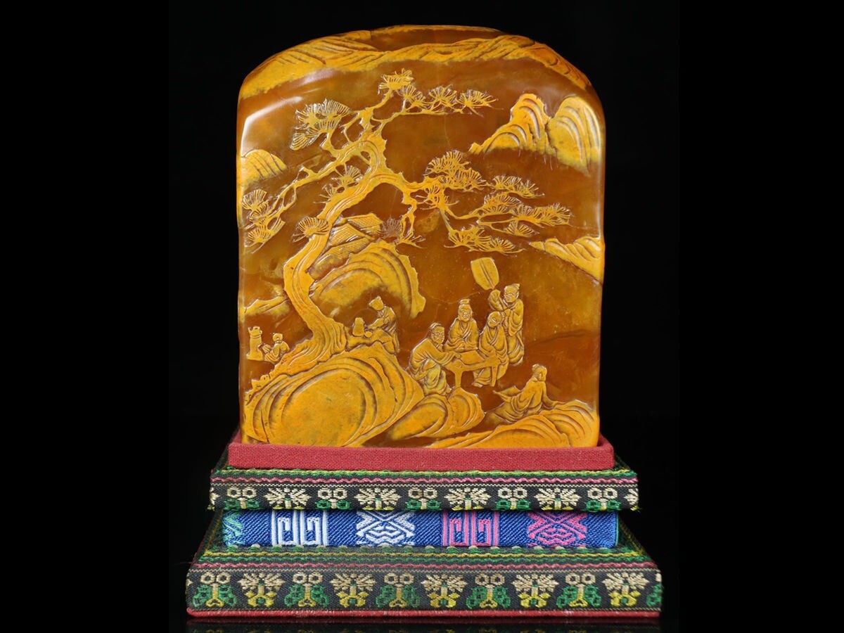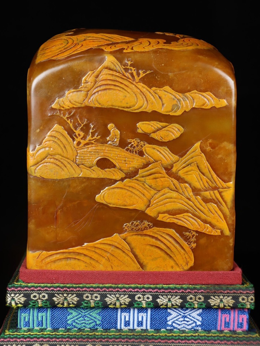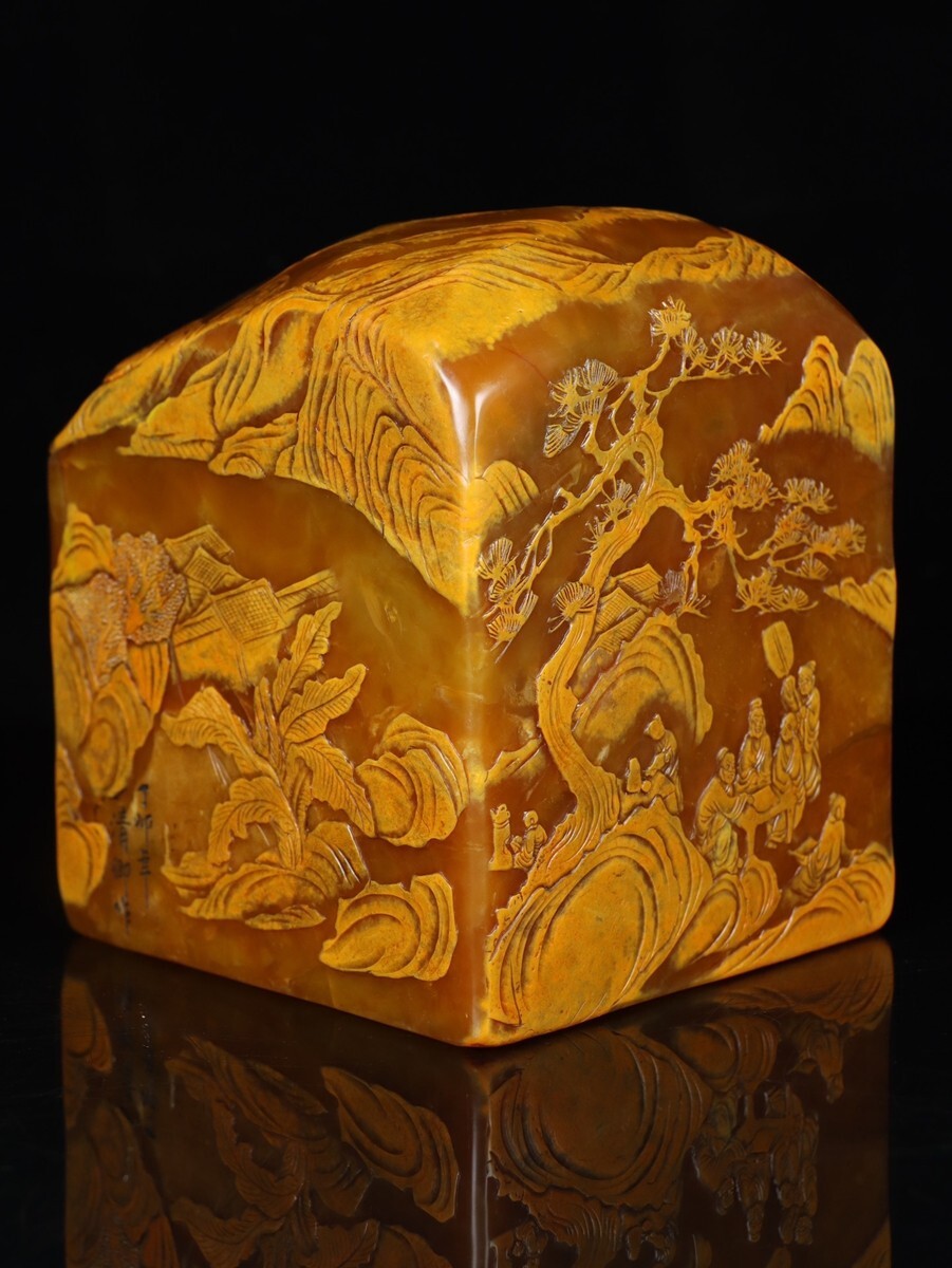 「清 清卿作 老寿山石 田黄石彫り 薄意印章」極細工 擺件 古賞物 中国古美術 旧蔵出