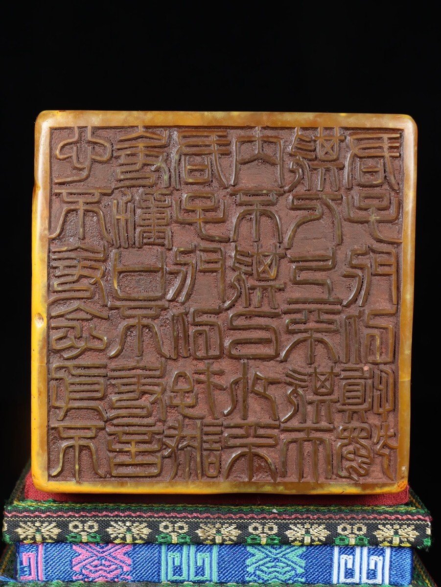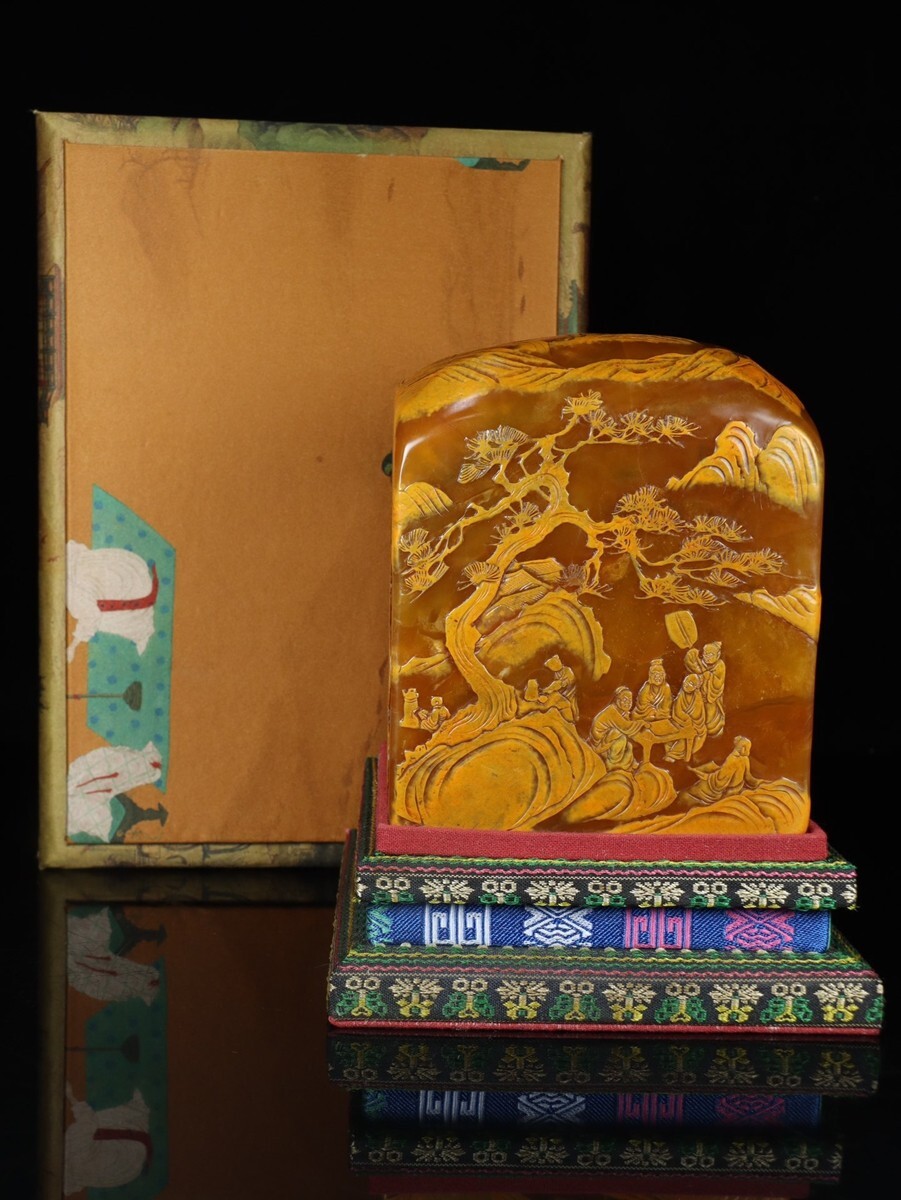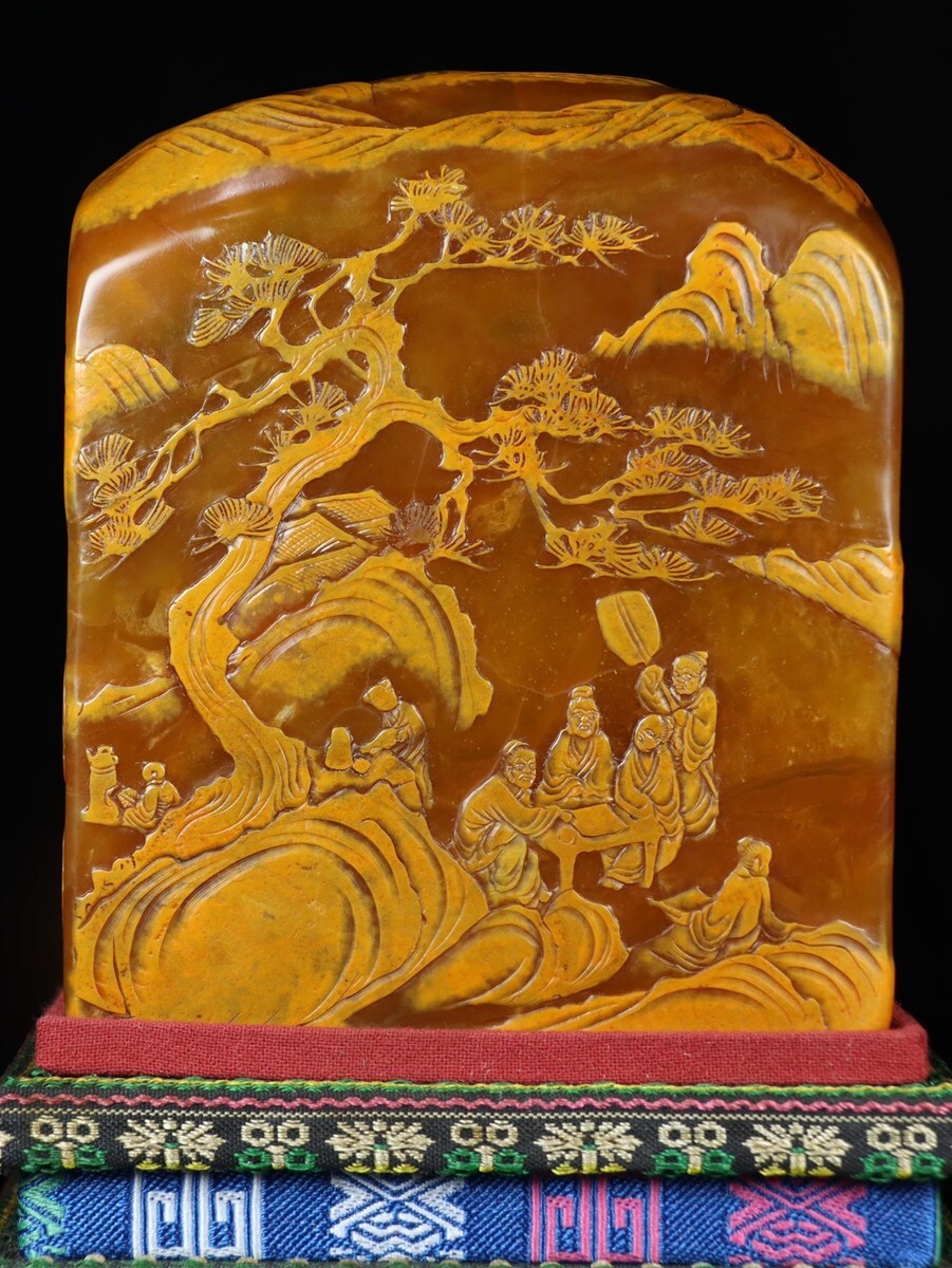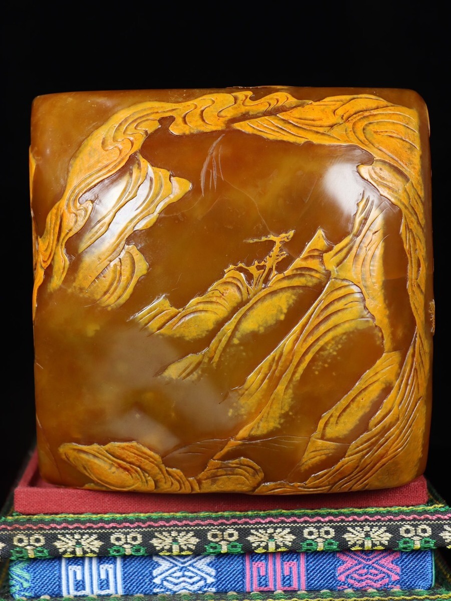 「清 清卿作 老寿山石 田黄石彫り 薄意印章」極細工 擺件 古賞物 中国古美術 旧蔵出