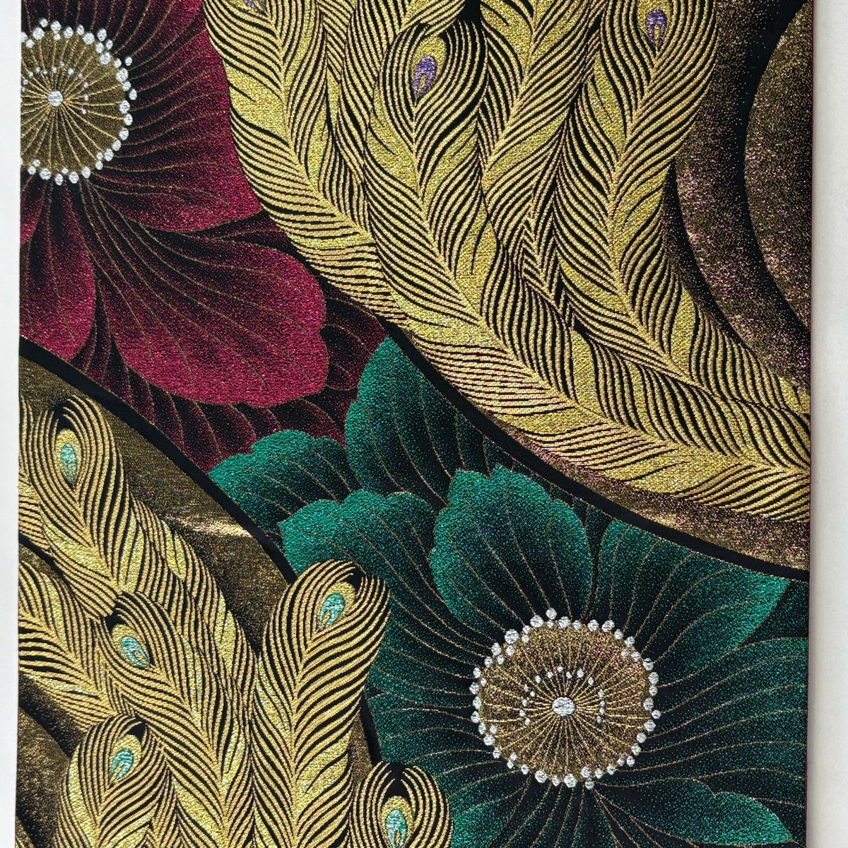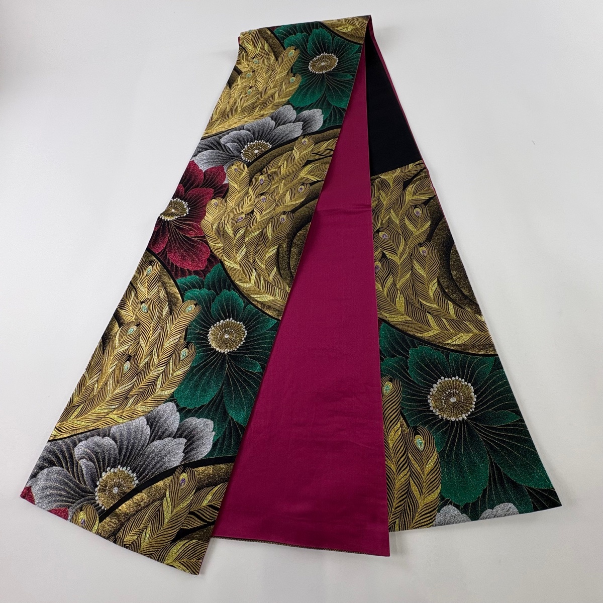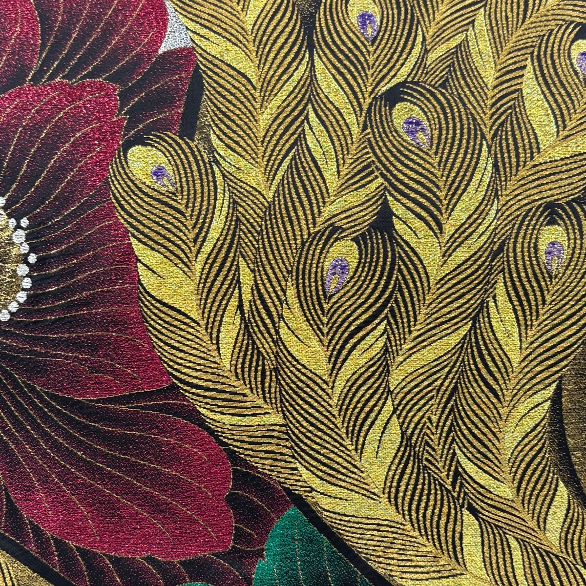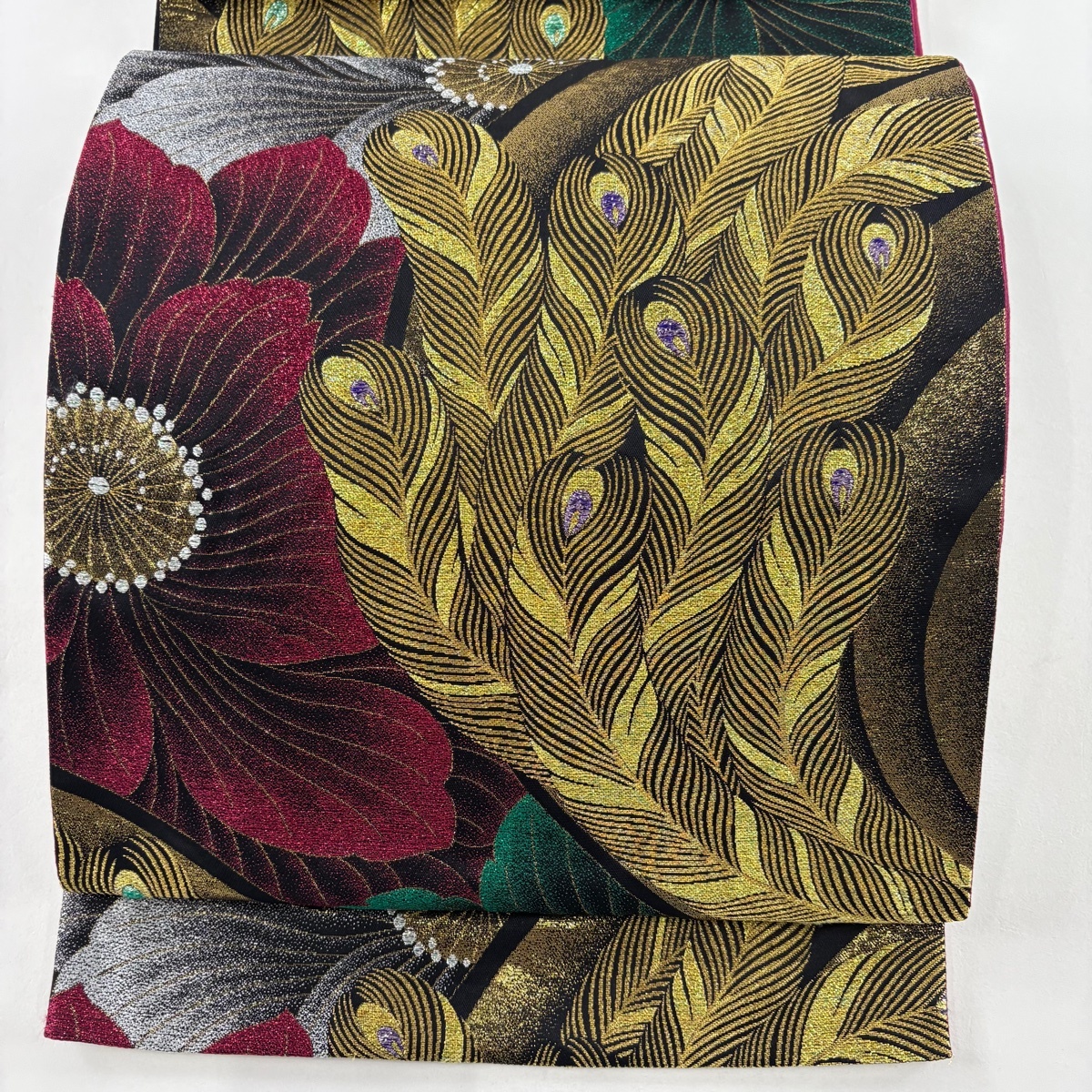 | 袋帯 美品 秀品 孔雀の羽 花 金銀糸 箔 黒 六通 正絹 【中古】 |