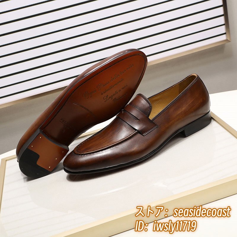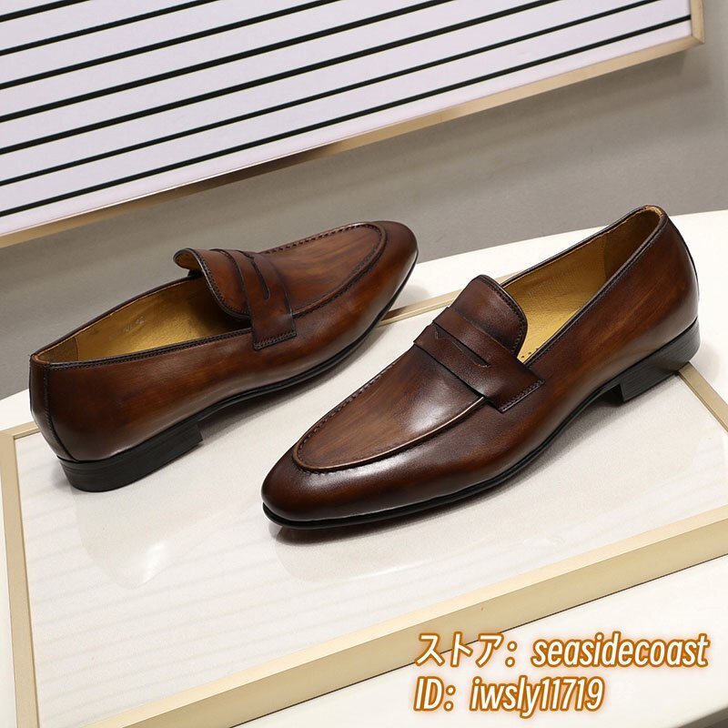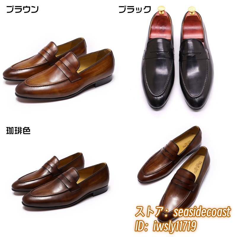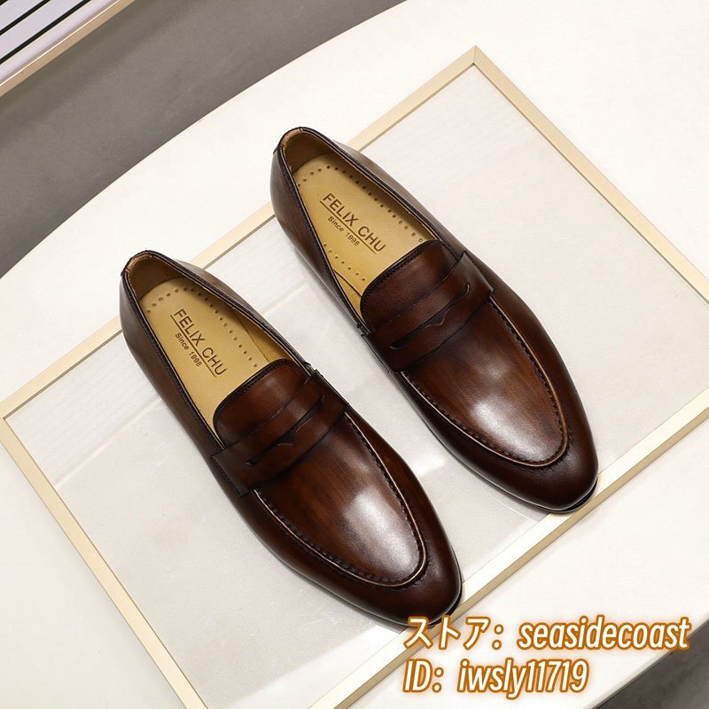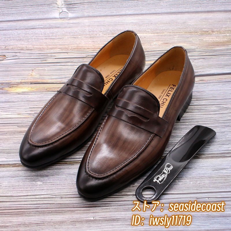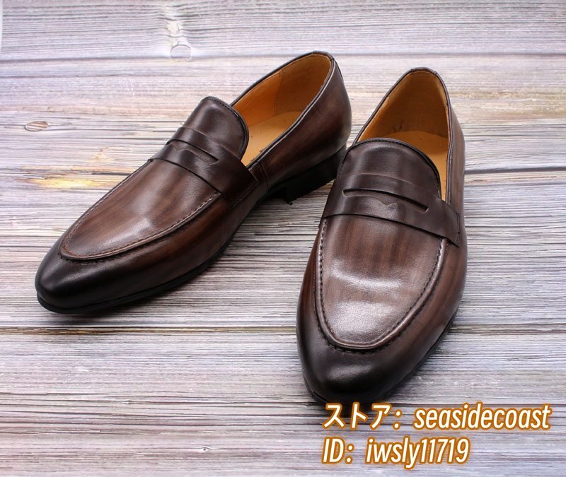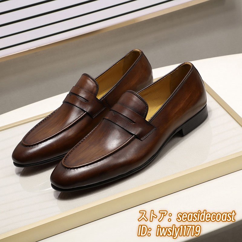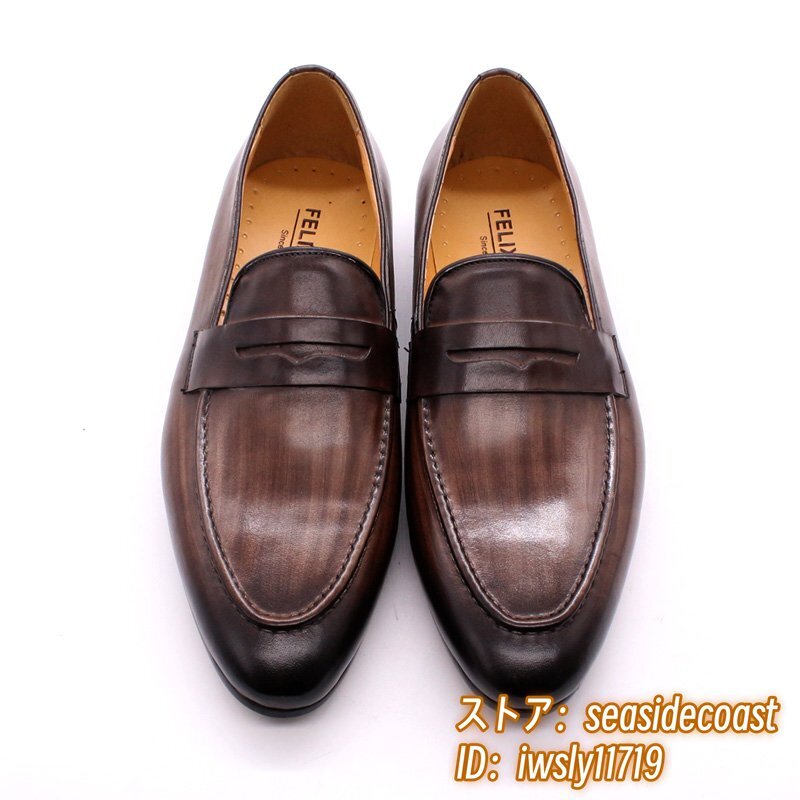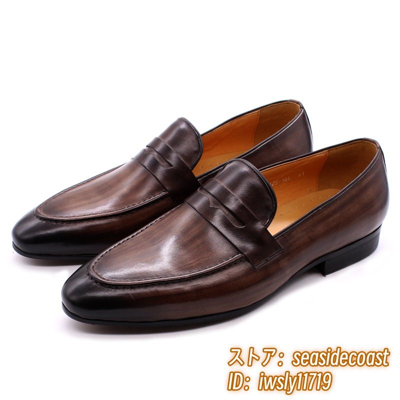 極美品◆本革 レザーシューズ メンズ ビジネスシューズ 職人手塗り上げ ローファー 高級牛革 紳士靴 革靴 スリッポン 通勤 珈琲色 26.0cm
