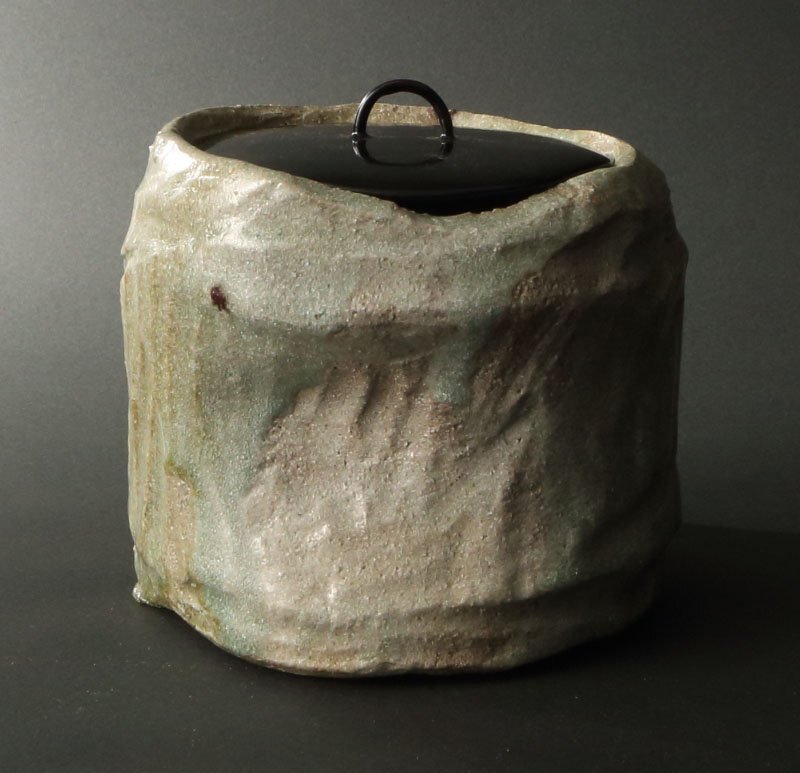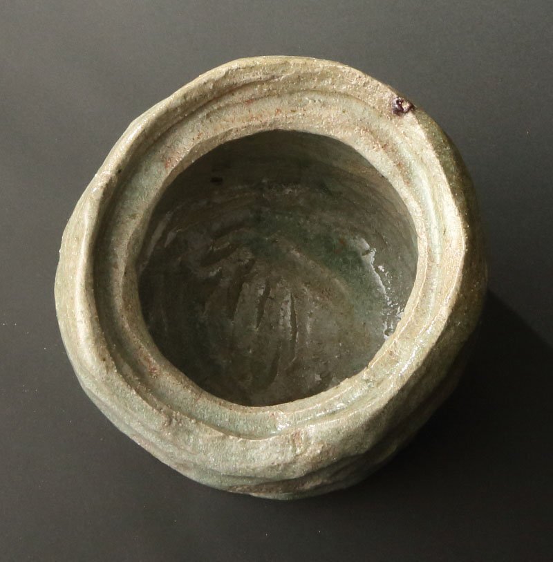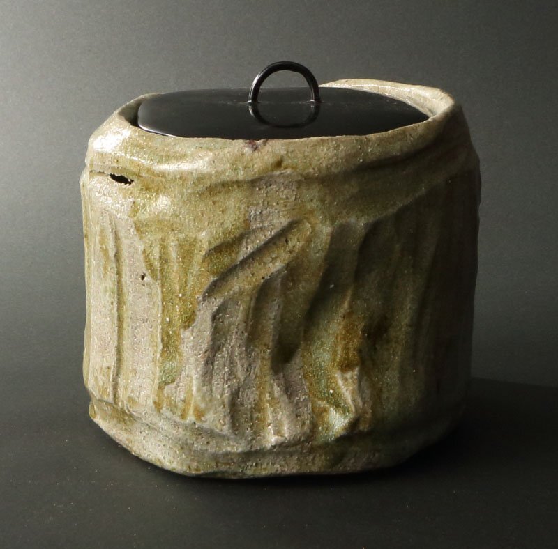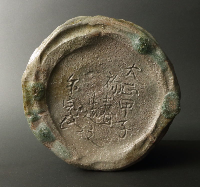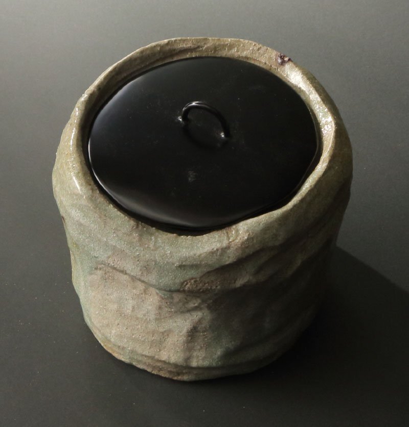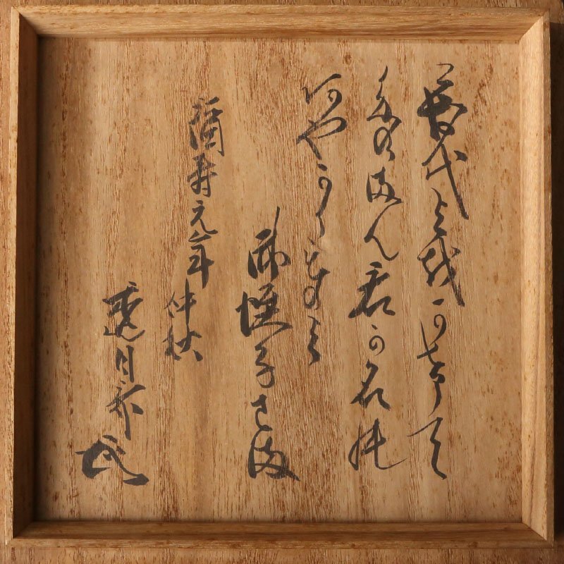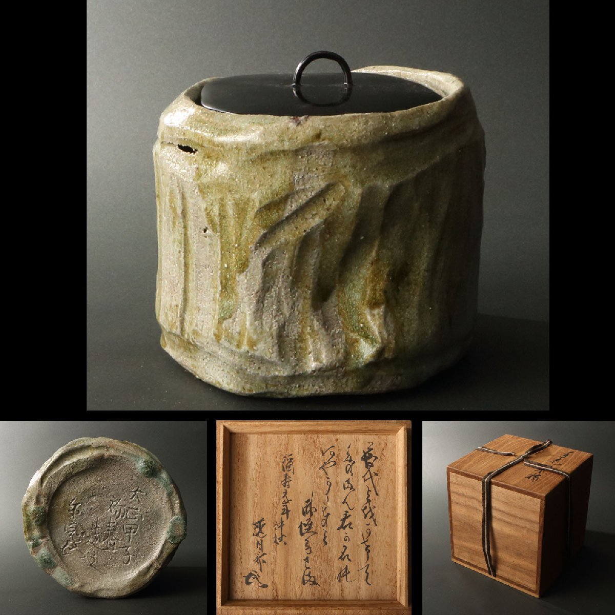 藪内透月斎の手造水指です。 総体に藪内釉が掛けられた手びねりの矢筈口水指で、「幾代よをかけてたのまん君が名の あやかりもの之臥蛭子さま」の一首を詠んでおります。 大正十三(1924)年、60歳の作であり、その年の仲秋(8月)に門人に贈られ箱書が認められたようです。還暦を迎え、闊達な作陶活動が知られる逸品です。 ◆透月斎 茶道藪内流十一世家元。九世宝林斎の長男。名は宗梁、字は世純、輝翁。透月斎・竹窓は号。岡山曹源寺の沈流軒老師に参禅し、森寛斎に絵を学ぶ。昭和17(1942)年没、78歳。 〔箱蓋裏〕 幾代よをかけて たのまん君の名の あやかりもの之 臥蛭子さま 福寿元年仲秋 透月斎(花押) 〔底銘〕 大正甲子 初春 造之 竹窓(花押) 付属:共箱が付属します。 寸法:高さ14.5cm、幅16.5cm(最大幅。若干の誤差はご了承下さい) 状態:経年感、複数カマキズがございます。 |
