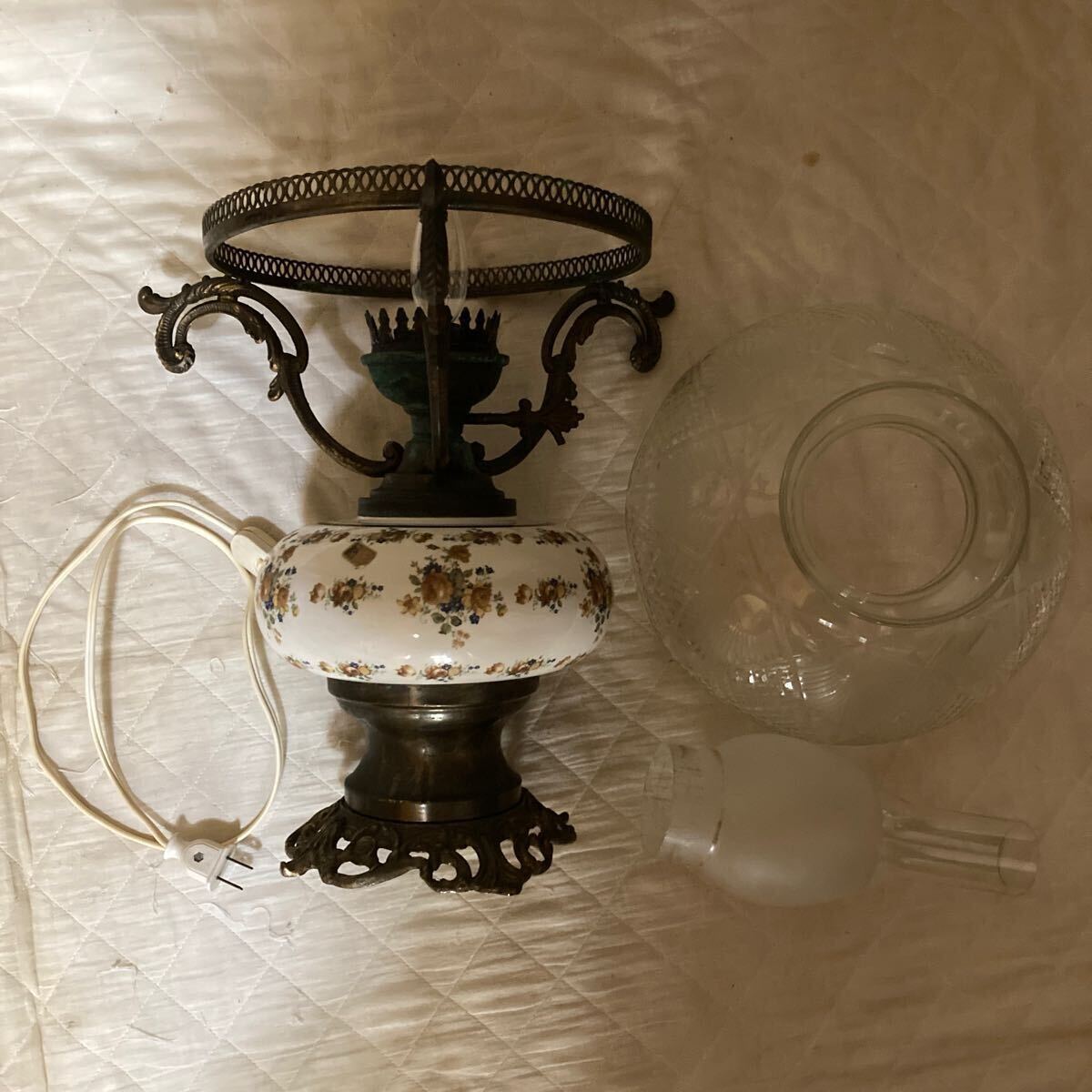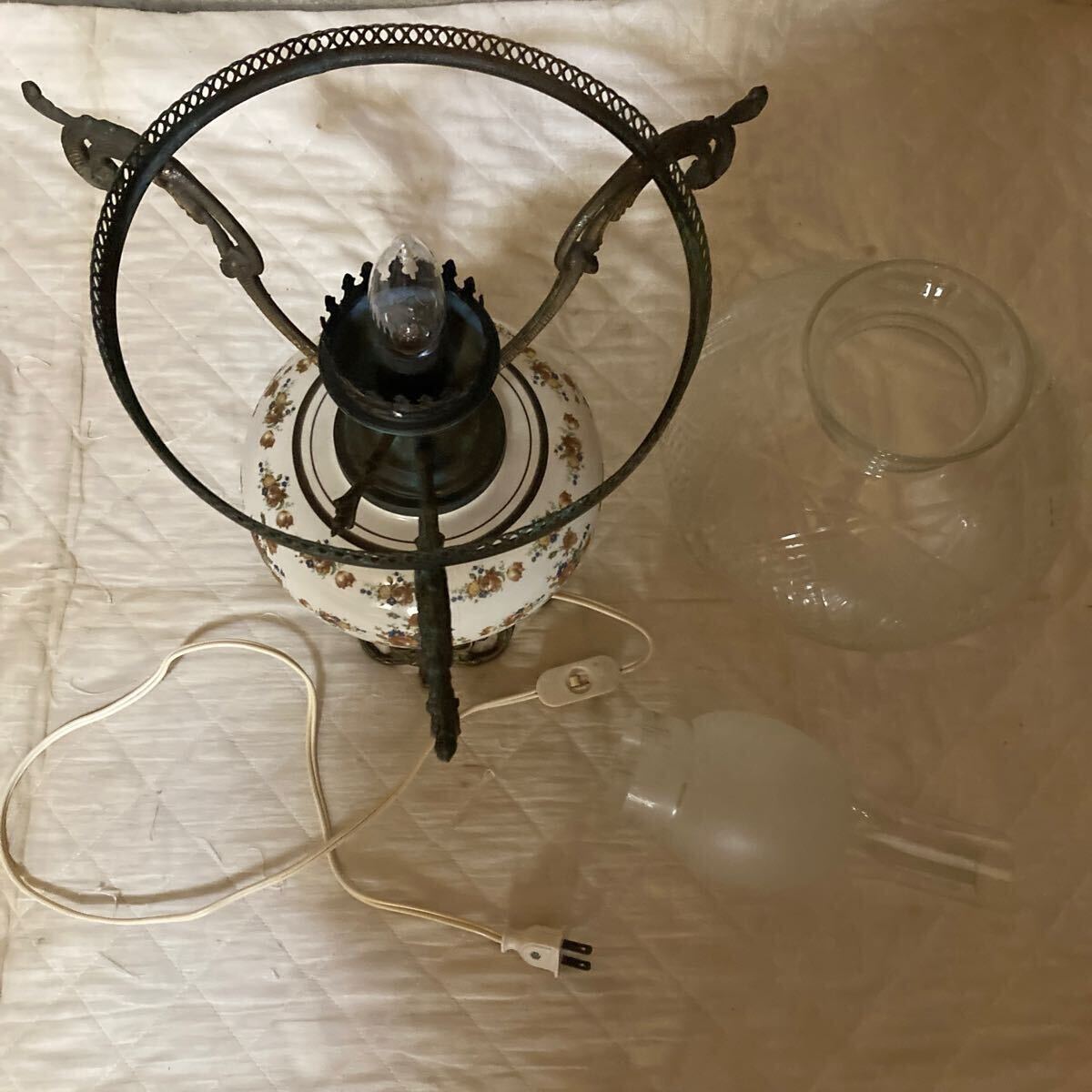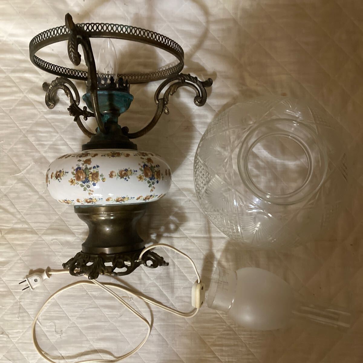 私の土佐.高知.田舎.近所.古い友人.コレクターさんの旧家屋敷の蔵に有った1900年代の古いイタリア製のスタンドランプ.台座.ホヤを置く台は象嵌要り銅.中のホヤを半分磨りガラス.外のホヤは切子.カット硝子です.中間.花柄の所は七宝焼です.電球付き.稼働品.全て