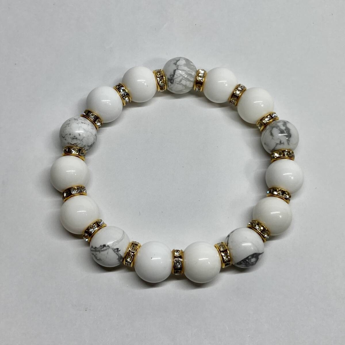 こちらは、ホワイトオニキスとハウライトを組み合わせたパワーストーンブレスレットです。間にはロンデルを挟み高級感あるデザインに仕上げております。程よくインパクトがある12mm玉を使用して内周約18cmです。(サイズ変更の場合は取引ナビにてご連絡をお願いします。) 数に限りがございますので気になる方はお早めにどうぞ。