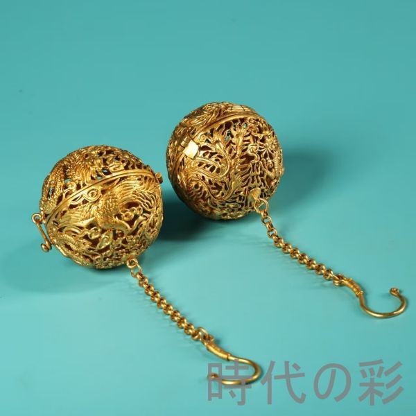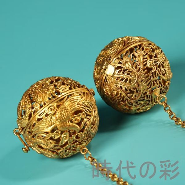 本品は純銅製の高浮彫?金?球香?香箱球で、一対セットです。精緻な工芸と独特の造形が特徴で、鑑賞や収蔵、装飾に適しています。