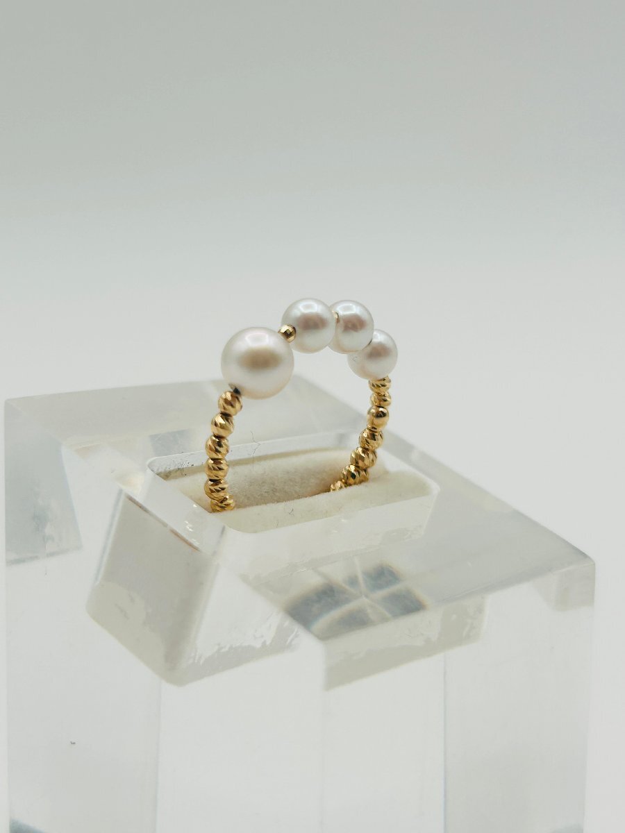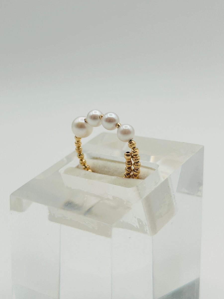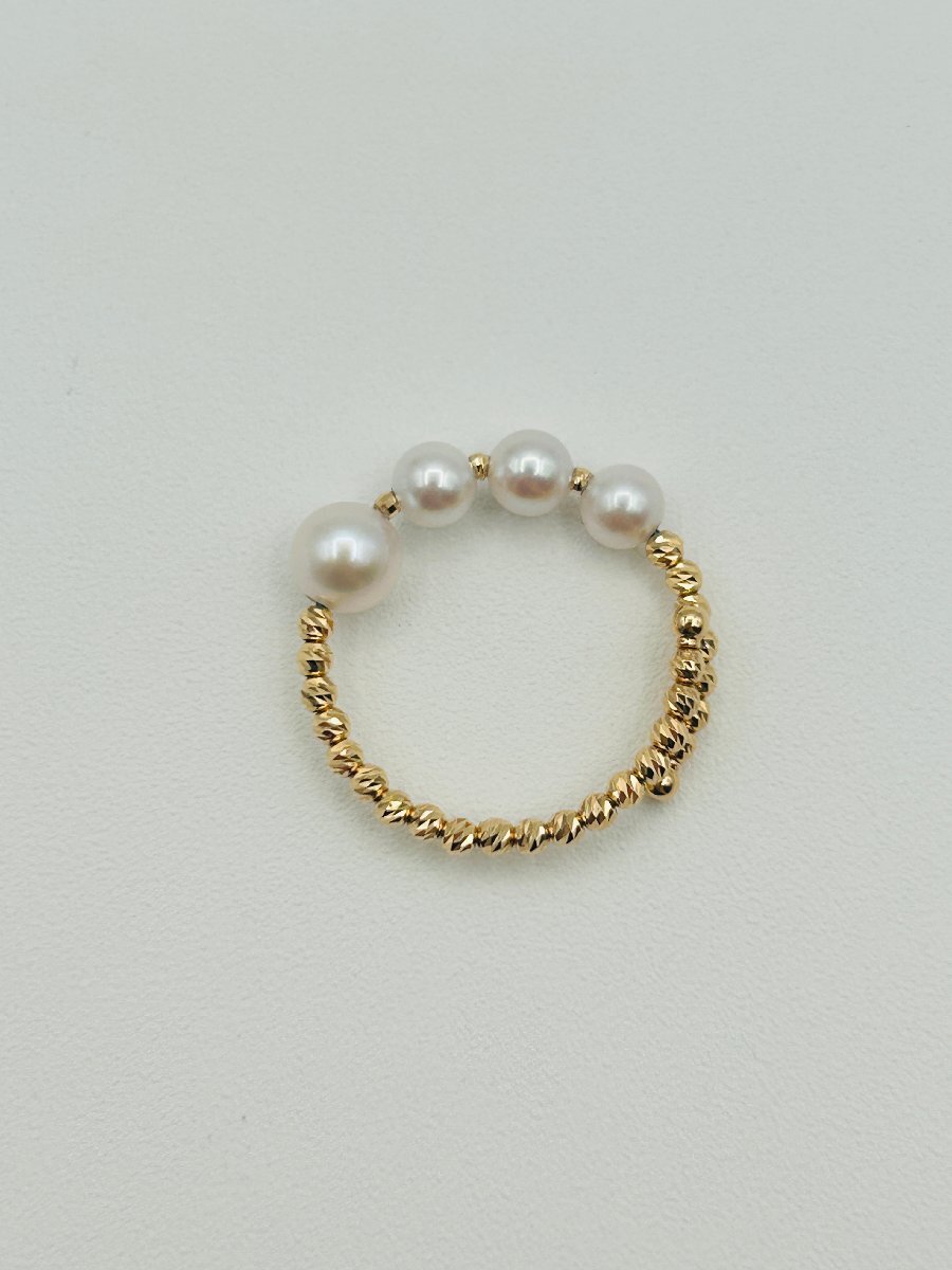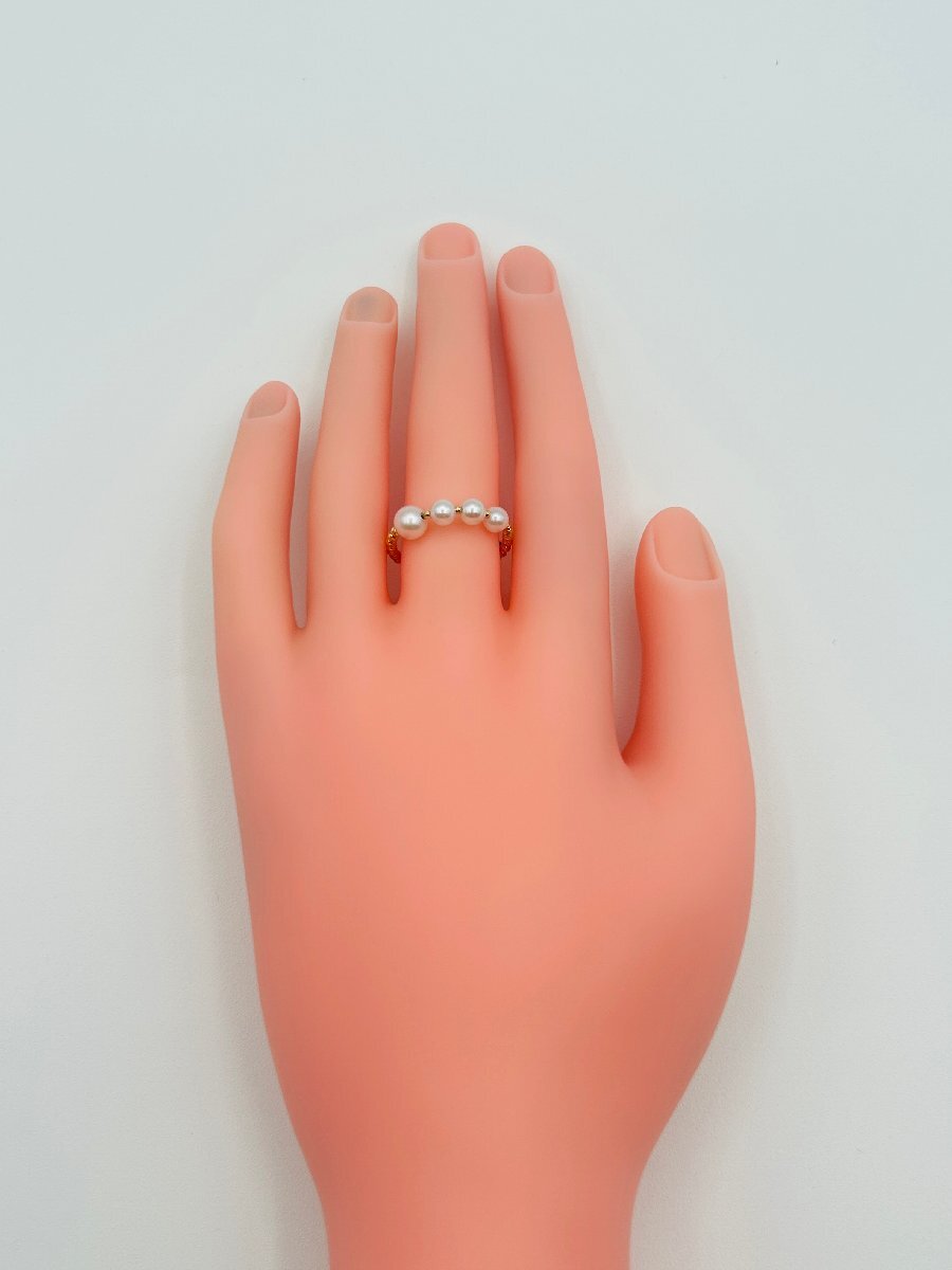 アコヤパールを4ピース使用したお洒落なファッションリングです。 形状記憶タイプでフリーサイズなので、お好きな指に自由自在に着用出来ます。 枠は18金イエローゴールドを使用、真珠との組み合わせが抜群です! カジュアル~オフィスシーンまで様々なシュチュエーションでお使いいただけます。 お値打ち価格でご提案致します! |