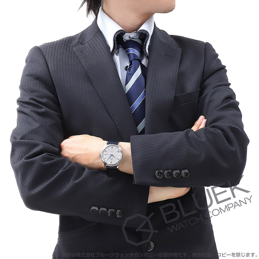 | 艶ありのシルバーステンレスケース・艶ありのシルバーステンレスベゼル・シルバー文字盤・ブルーの指針・ローマンとドットインデックス・12時位置にブランドロゴ・3時位置に日付表示・ブルーの革ベルト・穴留め式バックル・腕周り調整は約5mm幅の間隔で7段階可能・バックル部分、裏蓋にブランドロゴ・裏蓋にシリアルナンバー |