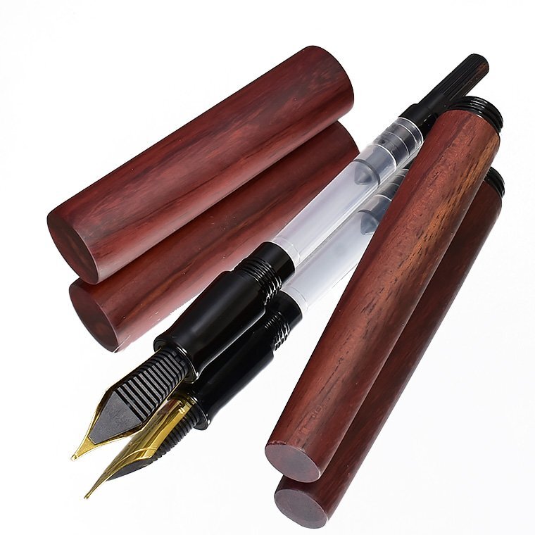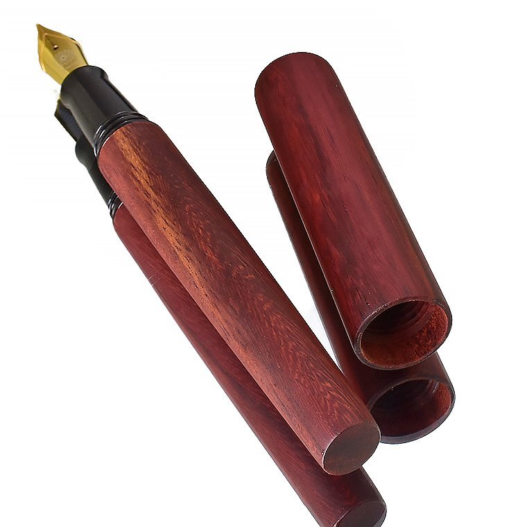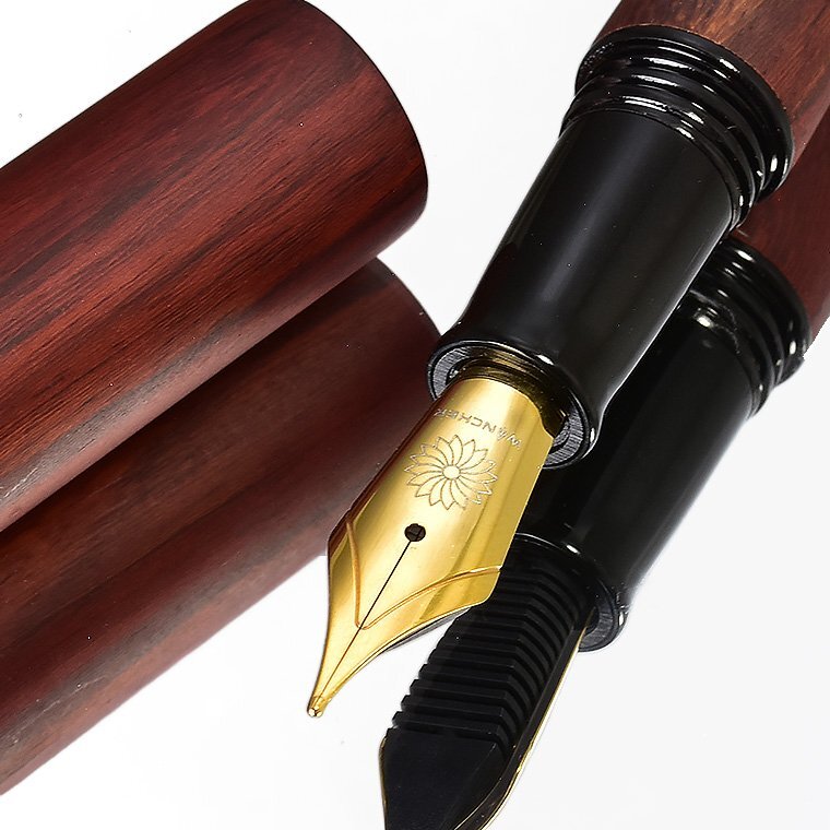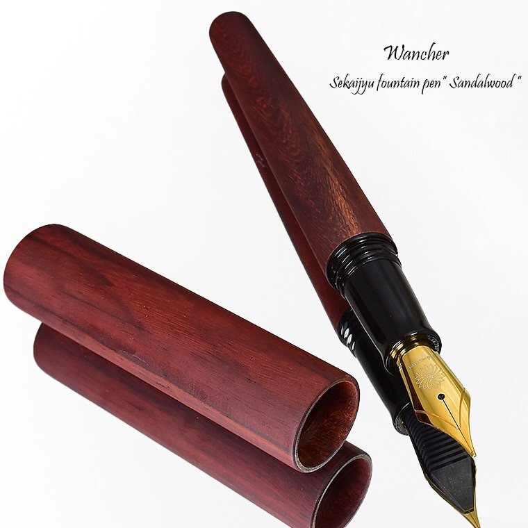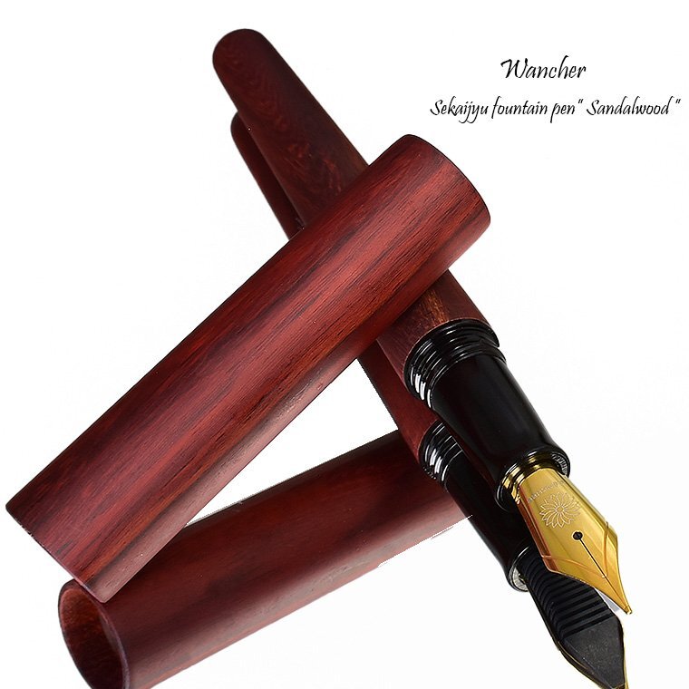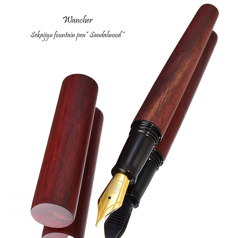 【Wancher/ワンチャー】 世界樹万年筆 サンダルウッド M 中字 新品未使用 ・天然木を使用しておりますので色の出方に 若干のムラがございますが天然木の特性と してご理解の上、入札ください。 お買得な1円~今回出品させていただきます ![]() 世界樹(せかいじゅ)とは、インド・ヨーロッパ、シベリア、ネイティブアメリカンなど あちこちの国々で語られるの神話の中に登場する木のことです。 世界中が、一本の大きな木で繋がっているというもので世界樹は天を支え、 天界と地上、さらに根や幹を通して地下世界もしくは冥界に通じているという神話です。 世界中に同様の神話が存在します。世界が一つにつながり平和でありたいという思いは、 遠い昔から世界共通なのだと感じます。 WANCHERは、世界中が垣根なくつながり、平和になることを願って世界樹という、 世界の木々を材料とした、万年筆を作りました。 ![]() この、「世界樹万年筆」を生み出したのは、台湾の山の中にこもって、 木の彫刻を作り続けている洪明華氏の協力があってこそでした。 工業機械を使わず、原木から木製万年筆を縦に削り出すことにより 美しい形状の万年筆を作り出してきた、彫刻家洪明華氏の協力の元 この万年筆は生まれました。 もちろん、木を材料とし、NC旋盤を用い、同じ形状の万年筆を 複数作り出したいので手伝ってほしいとの申し入れを、 彼は簡単に受け入れてはくれませんでした。 一本一本自然の木の形状を見ながら、木を削り、世界に一本しかない 木製万年筆を作ってきた彼には、工業旋盤で単一の製品を作ることには 大きな抵抗がありましたが、美しい木の万年筆を、アートではなく、 芸術性の加わった製品として、多くの人に触れて使ってもらうという 全く新しい取り組みとして、受け入れてもらいました。 彼が作り出した形状を基に工業NC旋盤を用い、横回転転する、 木棒からの削り出しによる木製万年筆製作を試みました。 旋盤を用いることで、同様の形状のモデルを複数作り出すことが可能となります。 もちろんそれには、木工旋盤加工には、熟練した職人の技術が必要となります。 彫刻家、木材加工職人など、様々な方の協力のもと生まれたのが、この「世界樹万年筆」です。 ![]() キャップとボディの直径ロ長さ、エンドの絞り、手になじむ大きさとデザインのバランス、 今まで目にしてきた万年筆とは、ちょっと異なります。 均整とアンバランスが、自然の中の木々の枝のように存在します。 一本の木の棒なのに何故か惹きつけられるのは、そのためです。 木の質感と美しい形状を、指先から伝わる感触で楽しんでほしい。 そのために、一本の木の塊から、時には大胆に時には繊細に、丁寧に形状を削り出す 作業が、何度も繰り返されました。そして完成した、誰もがふと手に取りたくなる造形。 表面は細かなヤスリで徹底的に研磨され、 硬い木独特のシルクのような滑らかな感触に仕上げられます。 薄く墨を流したような木目の模様。自然が生み出す美です。 ![]() 今回出品させていただくのはのは「白檀/サンダルウッド」です。 サンダルウッドは日本では「白檀(ビャクダン)」の名で親しまれており、 扇子やお香の原料などに使われてきました。 高級な香木の心材から抽出されるエッセンシャルオイル(精油)も有名です。 ![]() 万年筆は、書くための道具です。 決して見た目のために使用感をおろそかにすることは許されません。 キャップは気持ちよくボディエンドに刺さり、ちょっと短め?と思われる軸は、 筆記するのに最適な長さとバランスになります。 (短めといっても、国産メーカーの万年筆の軸と同等サイズです) ちょっと書くときは、キャップを外してサラサラッと書き、じっくり書くときは、 エンドにキャップをつけて、ゆったり書かれると良いかと思います。 ![]() ペン先は6号サイズと呼ばれる大型のニブです。 素材はステンレスになりますが、 近年のステンレスペン先の書き心地は良好で筆圧の強めな方にもお薦めです。 また、大型ニブと相まって抜群の書き味を誇ります。 是非、使うほどに愛着が増していく木の万年筆を手にしてください。 ![]() ****************************************************** ≪商品詳細≫ 品名 【WANCHER/ワンチャー】世界樹万年筆 サンダルウッド 出品個数 :1個 素材 :サンダルウッド(白檀) ペン先 : スチール ドイツ製JOWO社 サイズ : M(中字) 機構 : カートリッジ/コンバーター両用式 *コンバーターは欧州規格 長さ : 約142mm 径 : 約16mm(最大径)/10.5mm(最小径) 重さ : 約22g キャップ:ねじ込み式 付属品 : WANCHER紙ケース・コンバーター内蔵・カートリッジ3本 参考価格 :10,000円(税込11,000円) 新品未使用 *天然木を使用しておりますので、素材の木目の出方や色味には個体差がございます。 また木材独特の僅かな凹凸や傷の様に見える木目などがある場合がございます。 製品の特性としてご理解下さい。 またキャップ開閉のねじ込み下側部分に開閉の際の僅かなスレがついて います