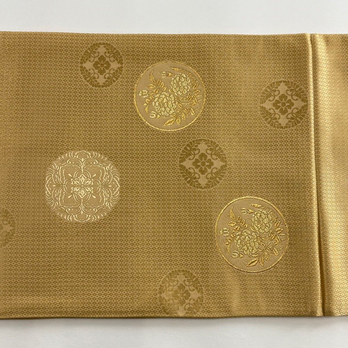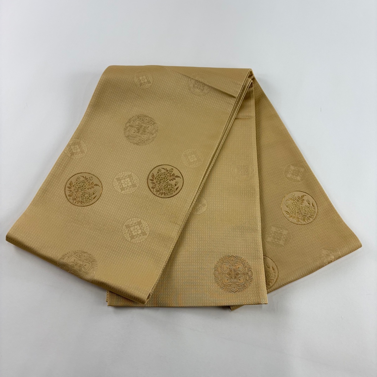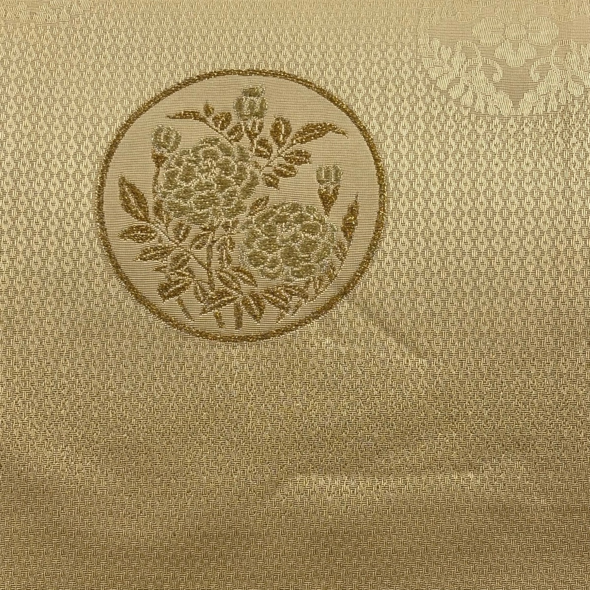 | 袋帯 秀品 丸文 草花 金糸 薄茶色 お太鼓柄 正絹 【中古】 |