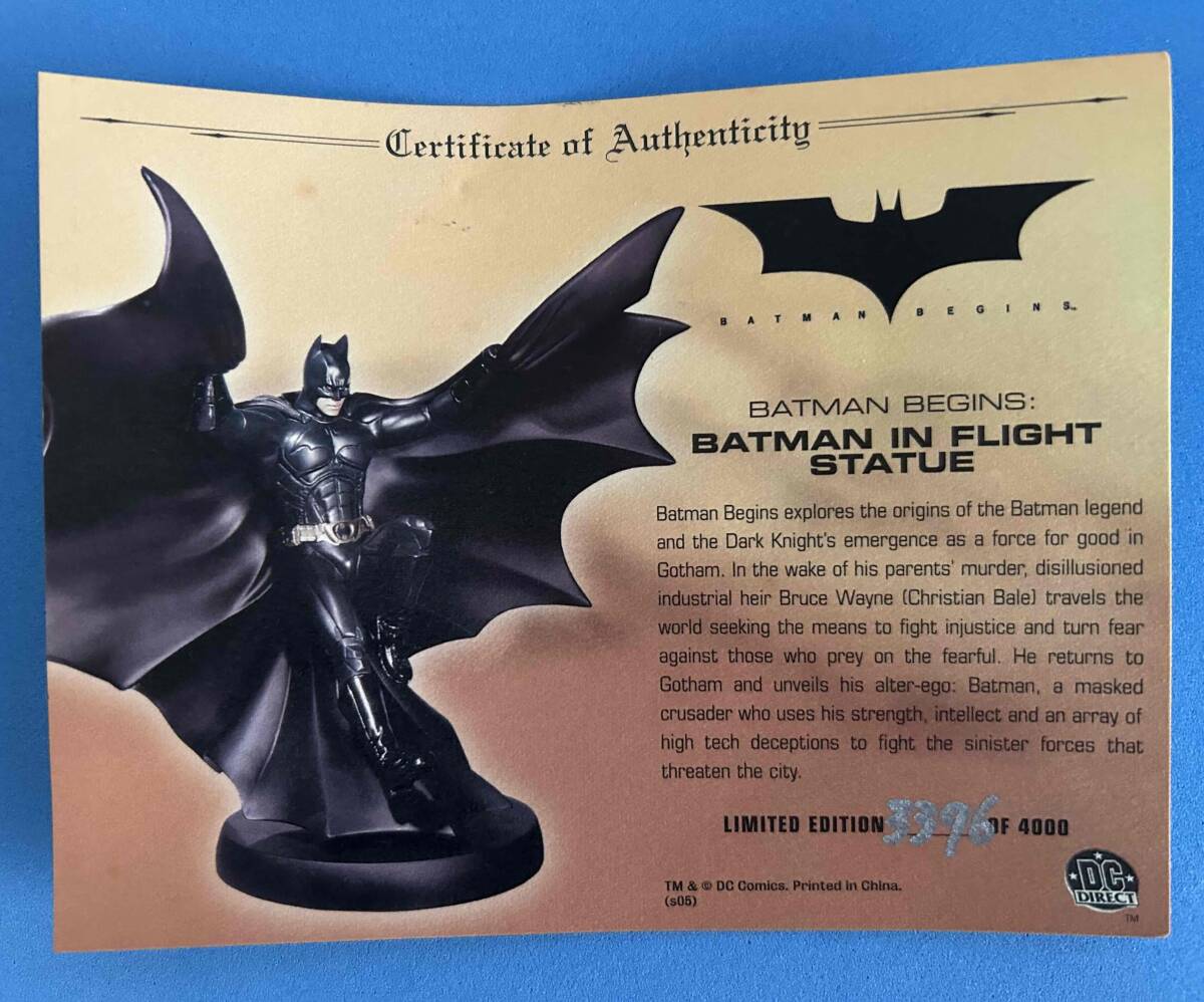 (※BATMAN BEGINS BATMAN IN FLIGHT STATUE) シリアルナンバーは3396/4000です(※商品カード、商品台座の裏面に表記)