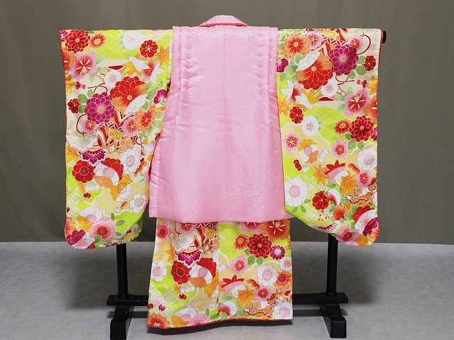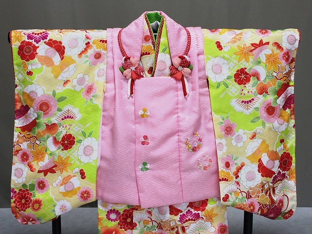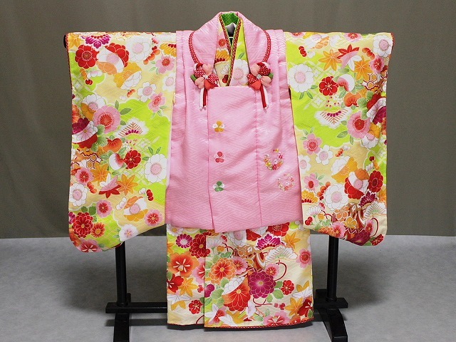 A0946-04 塚句資野 お子様用着物のトップブランド「式部浪漫」の高級被布セットです。 お着物は、さや型地紋の見えるクリーム色とグリーン色地に多色使いにて花柄があり さらに金色にて縁取り加工などが施されています。袖口や裾部分には赤色の鹿の子柄が付き ちらっと見える部分にさりげなくかわいさをアップさせています。 被布は、さや型地紋の見えるピンク色に 山吹色や白・グリーン・ローズなどの色系にて刺繍柄となっています。 巾着・草履・リボンは赤色です。 足袋は付いておりませんので お子様のサイズにてお求め下さい 当ショップにも足袋やへこ帯など多数ございますので お寄り下さい。◎ | ||||||||