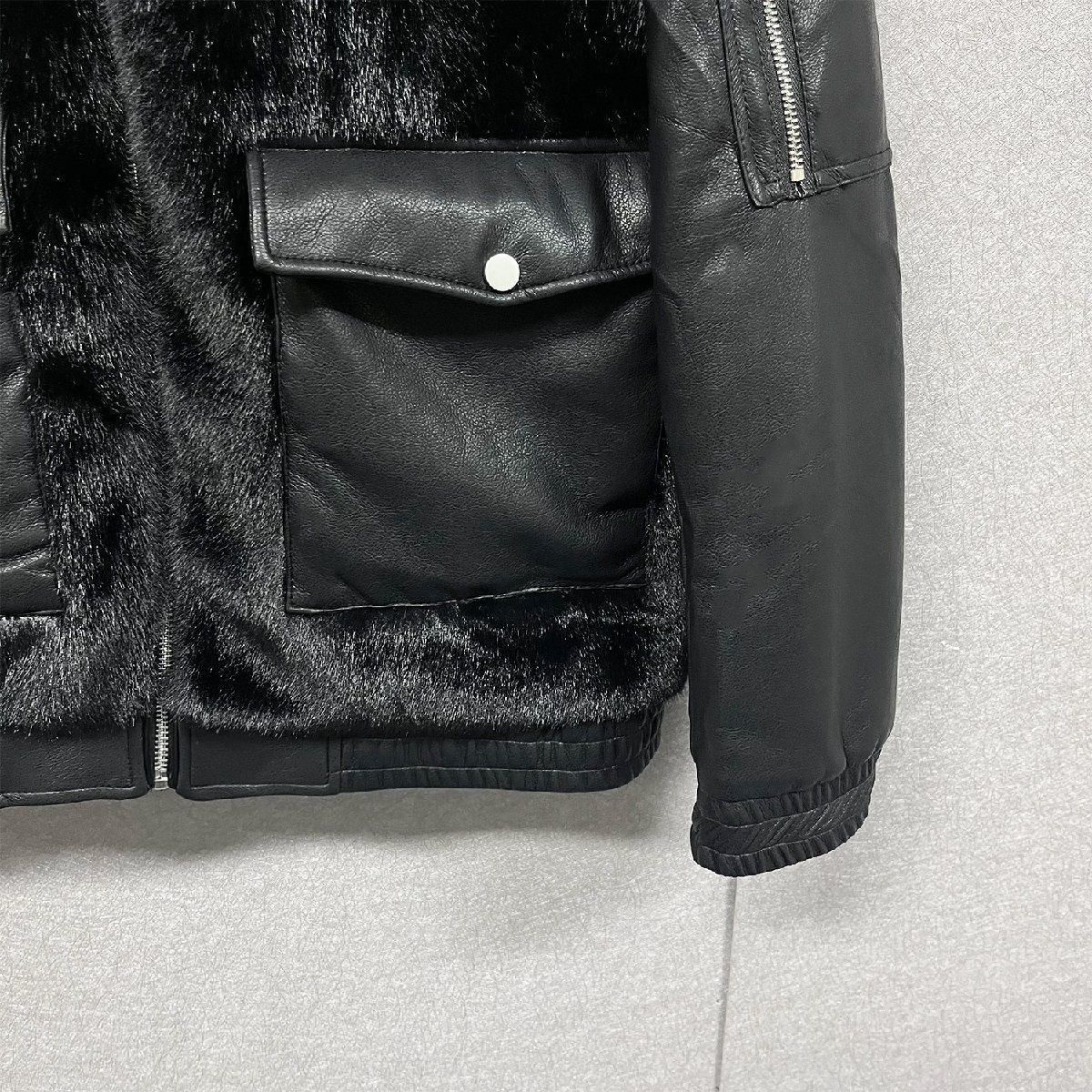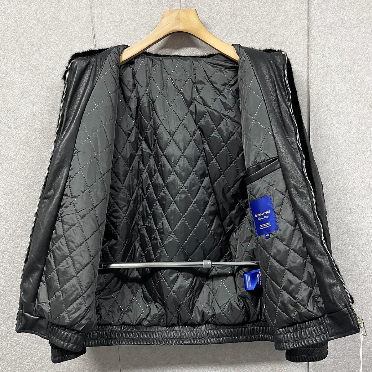 ミンクとレザーの異素材切替デザインを施したトレンド感のあるデザイン。折り襟仕様で、きちんと感がありながらも首元がすっきり見えます。両サイドのポケットはサイドポケットとフラップポケットの二重構造になっており、収納力と実用性も抜群です。