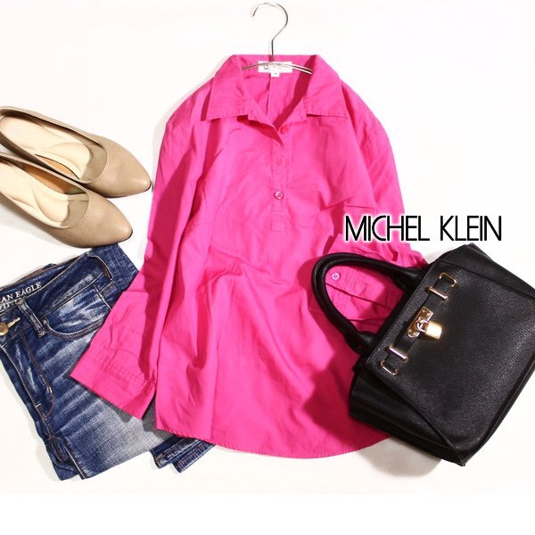 美品 MICHEL KLEIN ミッシェルクラン コットン100% 綺麗色 クォータースリーブシャツ 38号 M 春 夏 秋 25D09