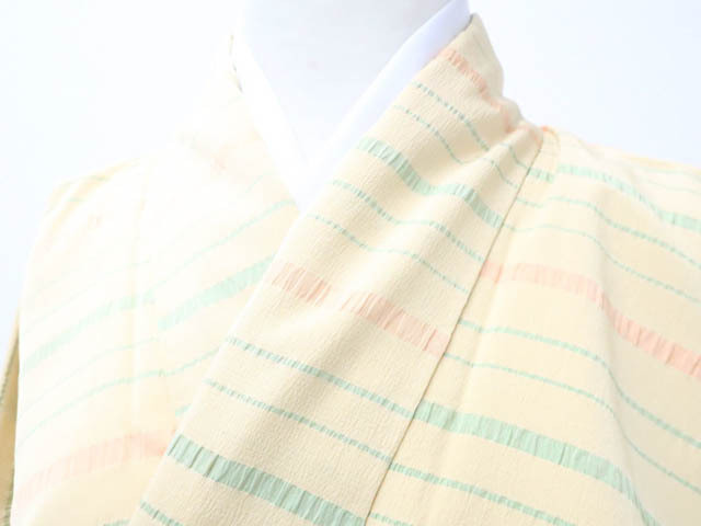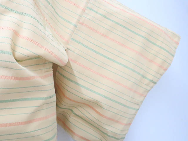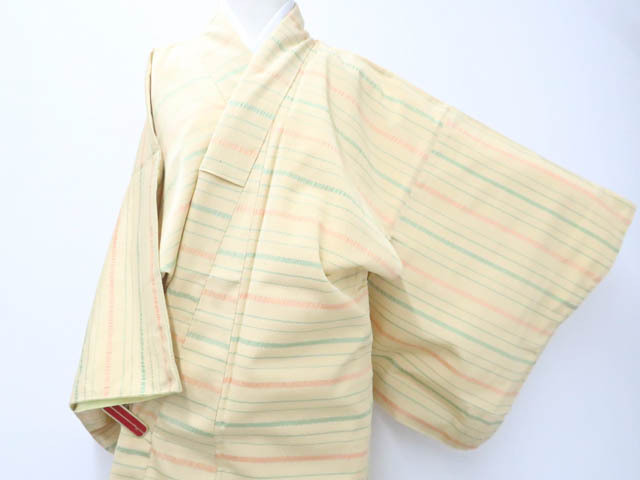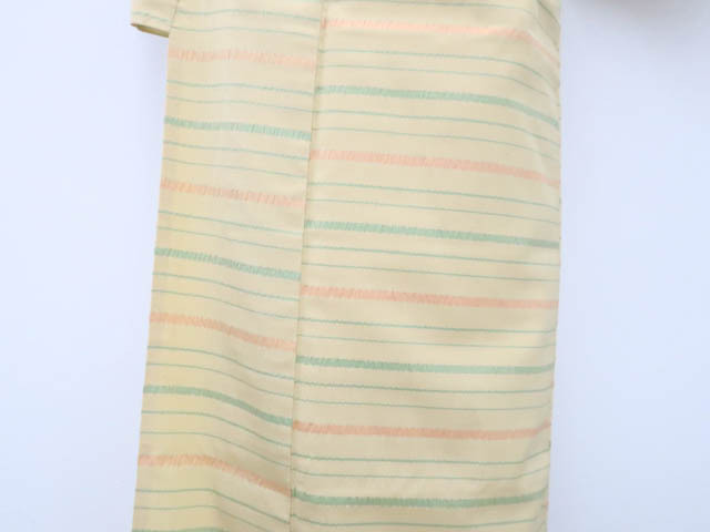 リサイクル商品のため、衿と衿裏に薄汚れがございます。 表所々と袖口に汚れがございますが着用可能なお品です。 地色はくすみ黄です。 1枚目の画像が近いお色かと思われます。 素材は正絹です。 |