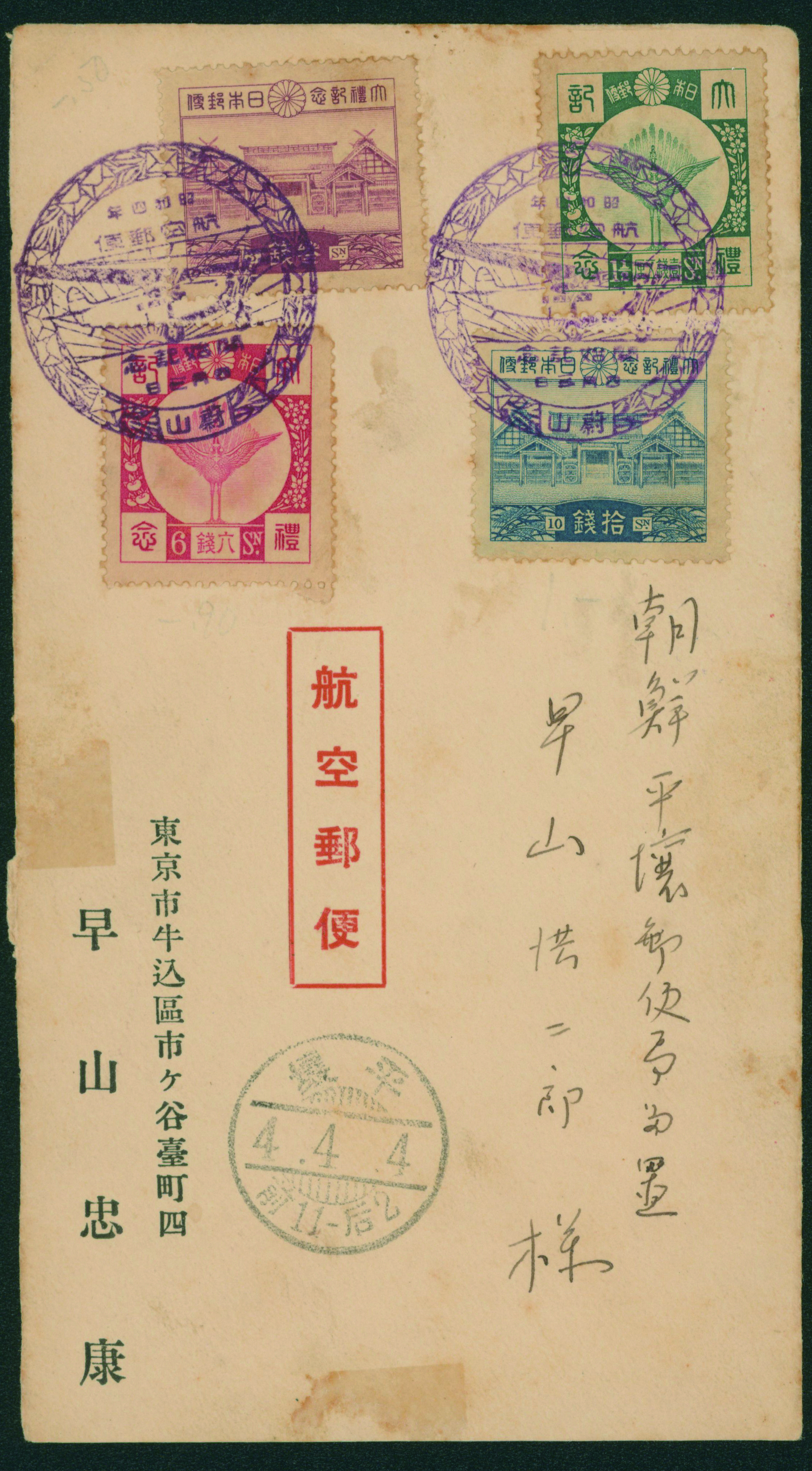 商品説明:昭和大礼4種貼 昭和大礼10銭, 6銭, 3銭, 1.5銭 4種完揃い貼り 特印(紫, 航空郵便開始記念) 昭和4 4 3 蔚山(朝鮮)→平壌 到着印:4/4 航空 カバー汚れ 表にヒンジ跡JPS C49,C48,C47,C46,