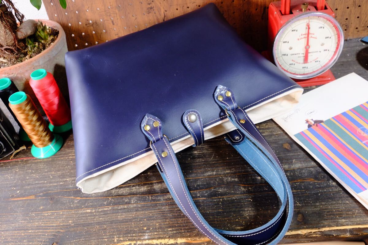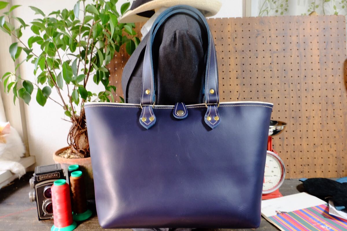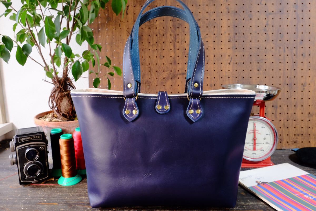 ◆ダークネイビー牛革スムースレザートートバッグ Lサイズ 作家一点物★日本製帆布鞄ハンドメイド紺色ブルーメンズレディース