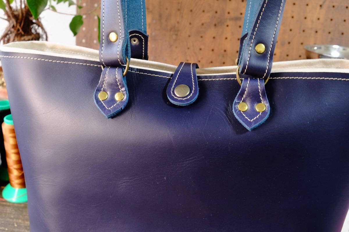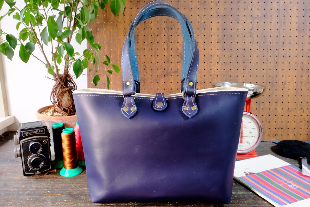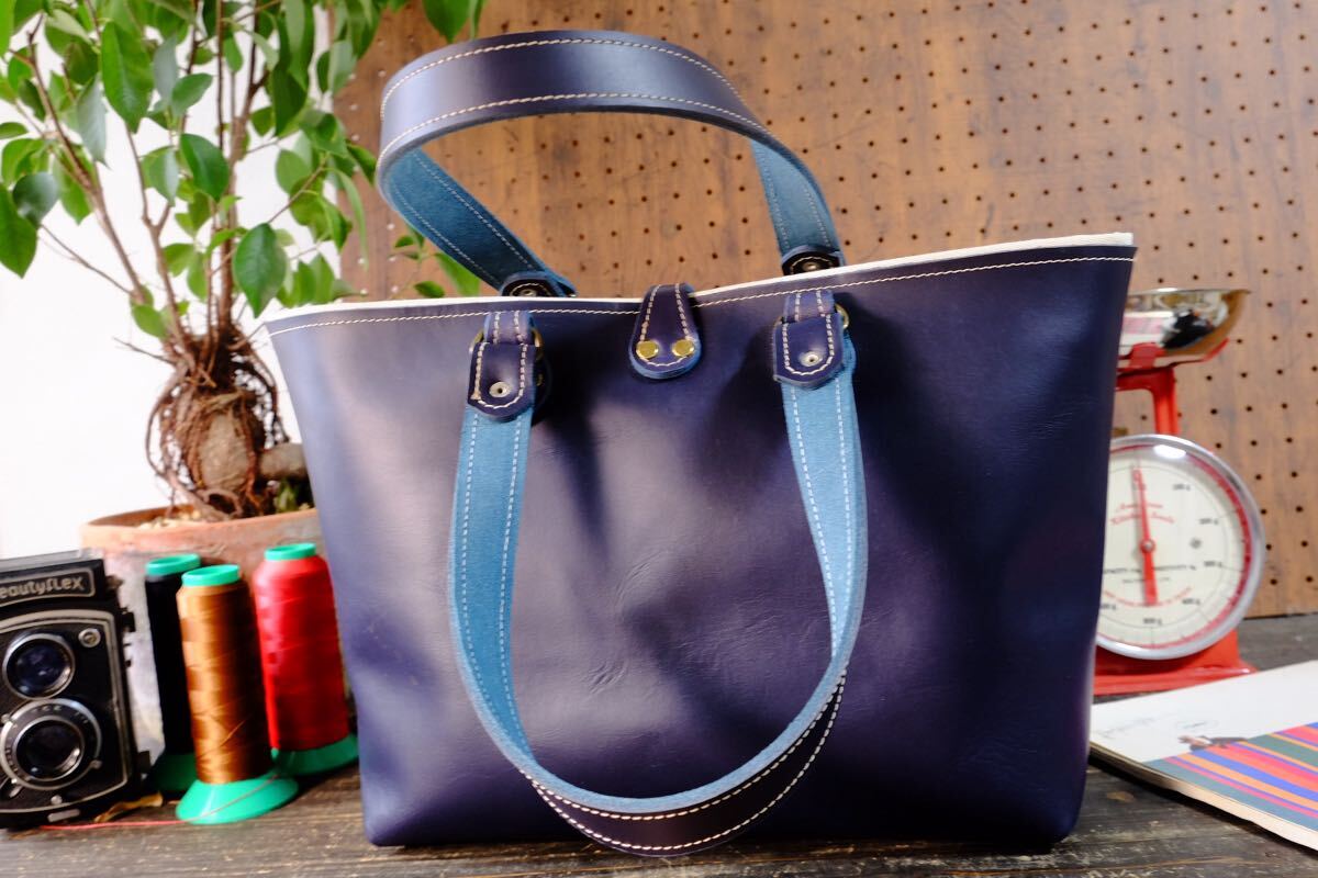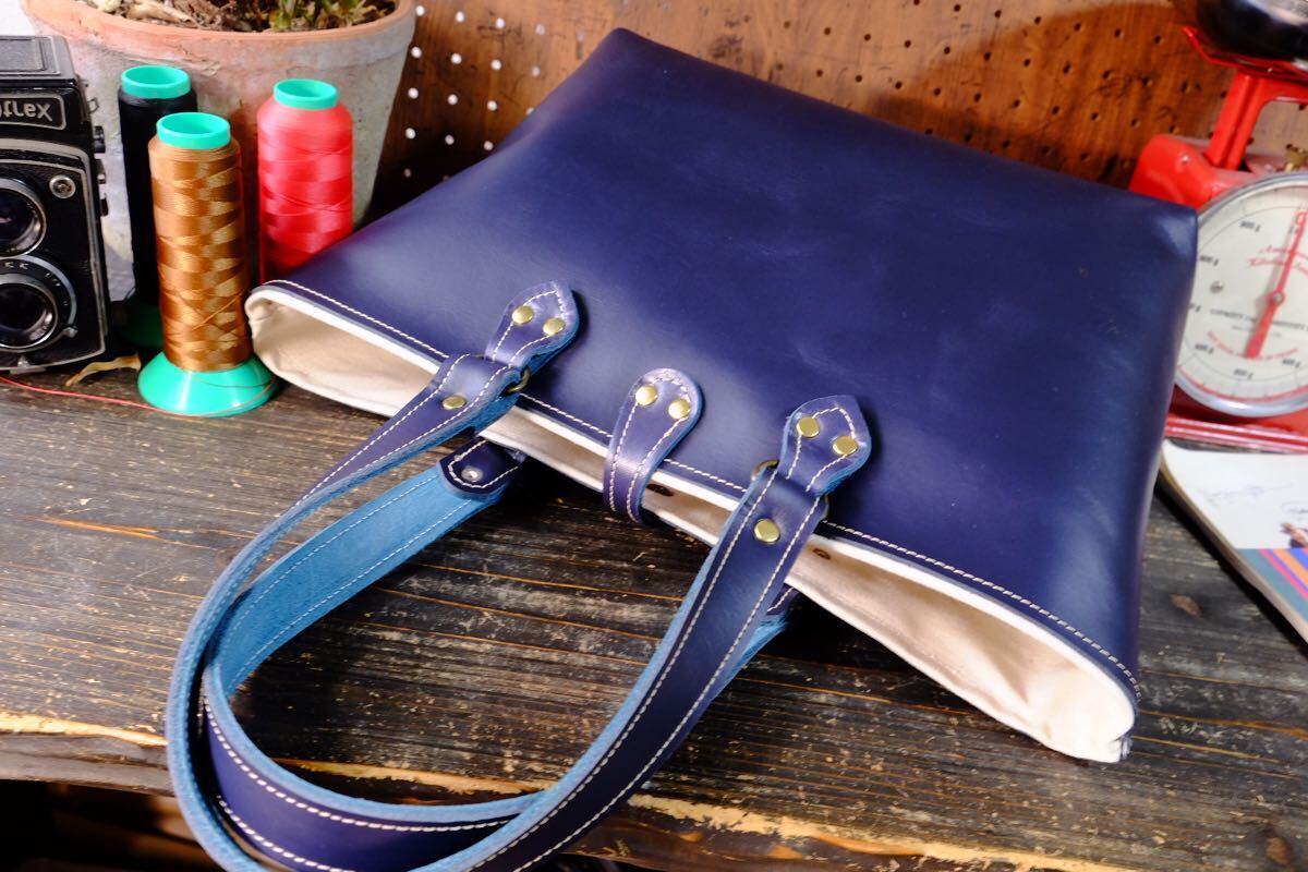 ◆ダークネイビー牛革スムースレザートートバッグ Lサイズ 作家一点物★日本製帆布鞄ハンドメイド紺色ブルーメンズレディース