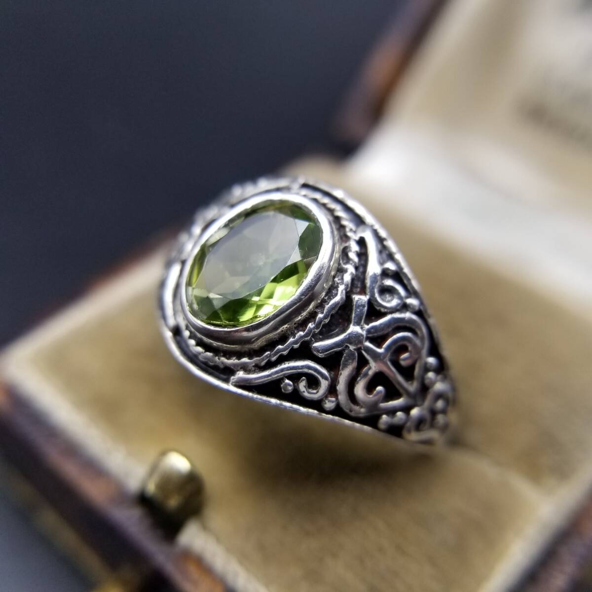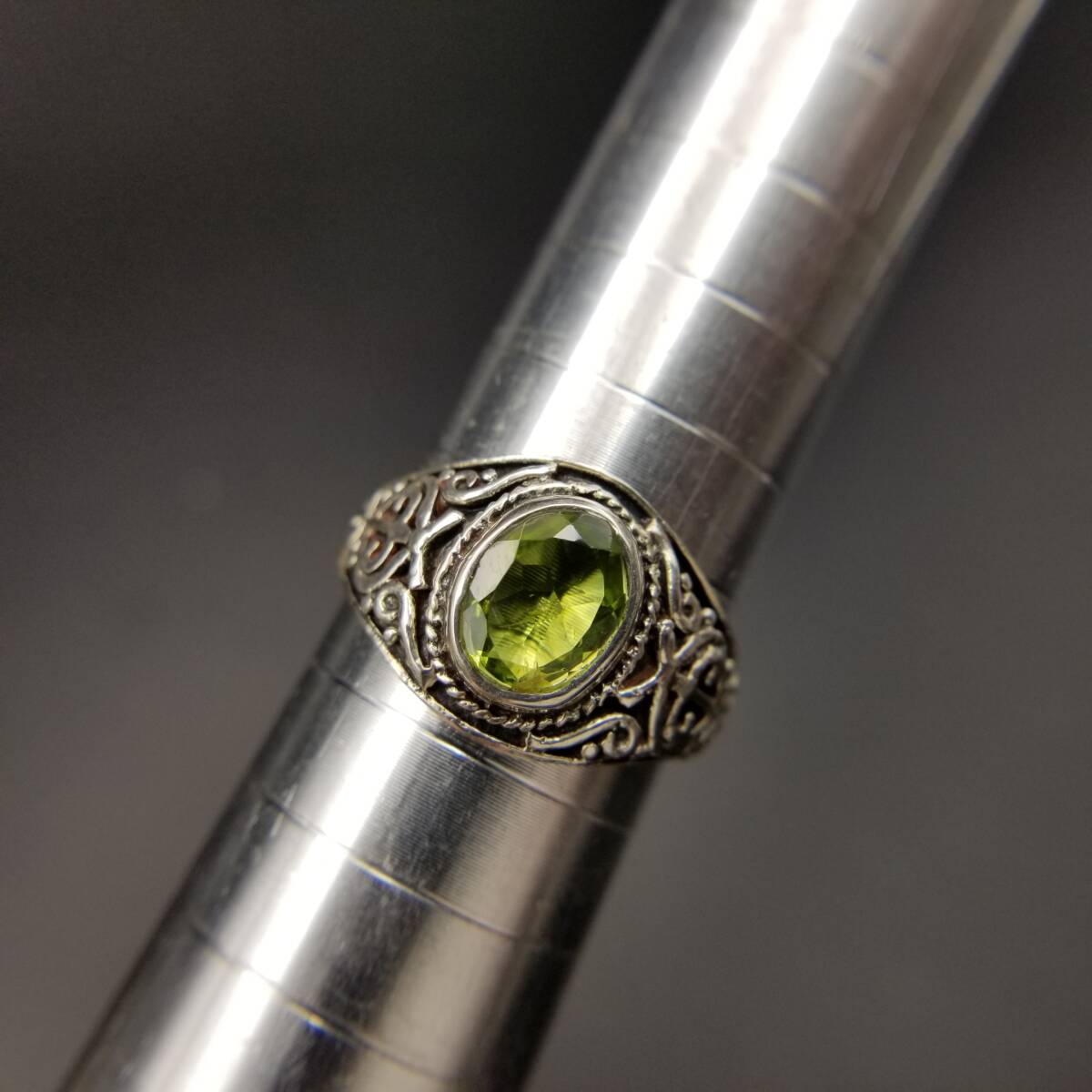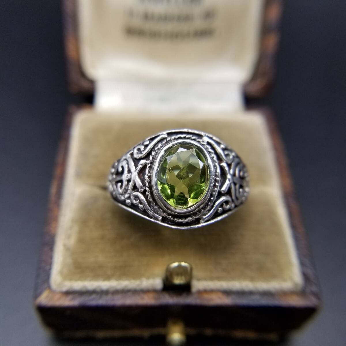 ペリドット オーバル ファセット ゴシック 925 シルバー ヴィンテージ シグネット リング 指輪 銀 サイド装飾 ユニセックス R16-T