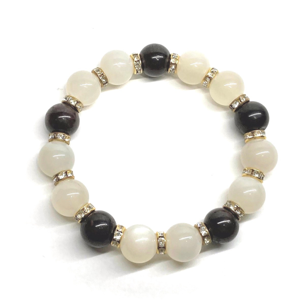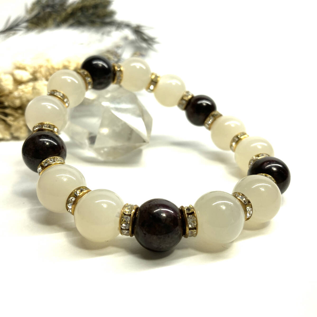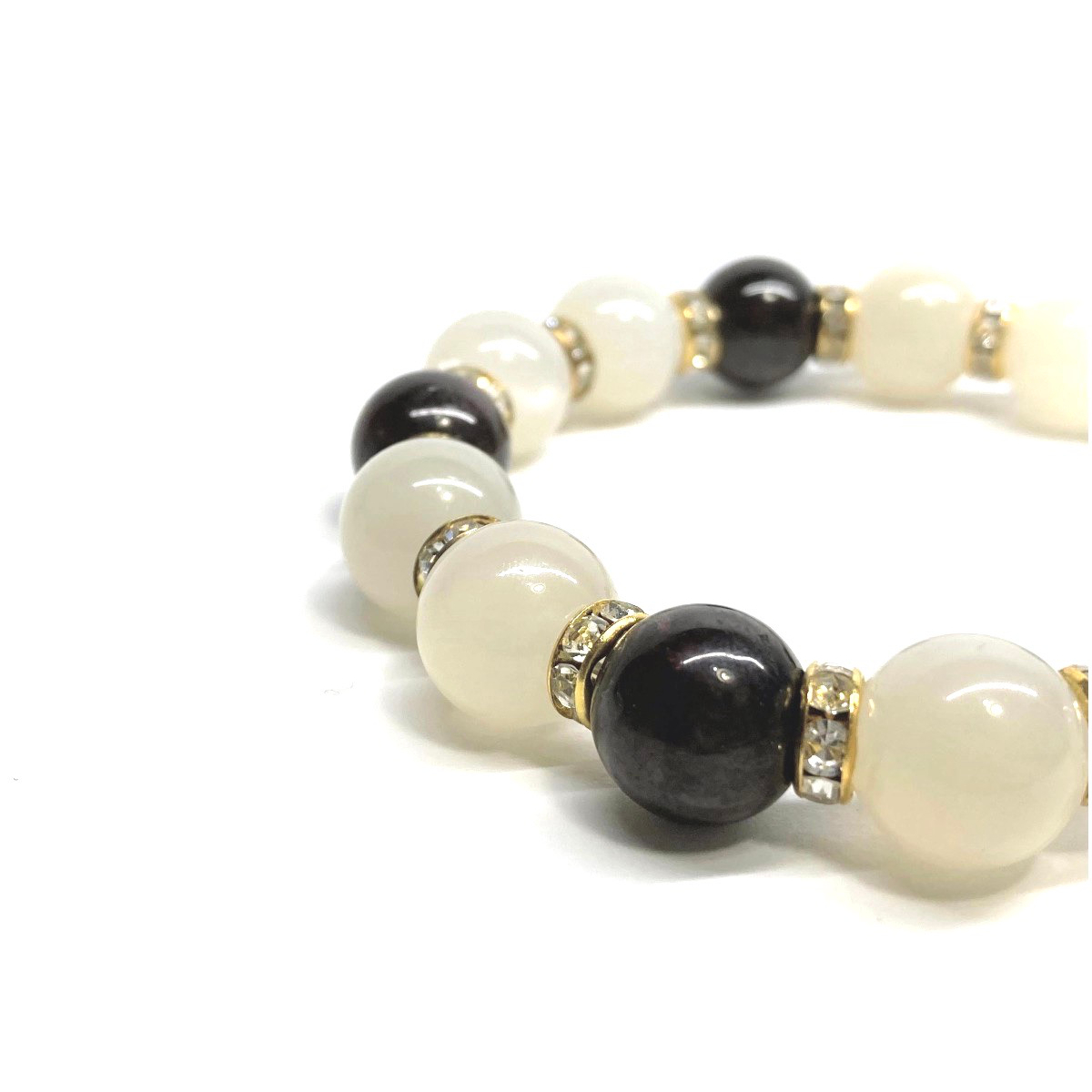 こちらは、ムーンストーンとガーネットを組み合わせたパワーストーンブレスレットです。間にはロンデルを挟み高級感あるデザインに仕上げております。程よくインパクトがある12mm玉を使用して内周約18cmです。(サイズ変更の場合は取引ナビにてご連絡をお願いします。) 数に限りがございますので気になる方はお早めにどうぞ。