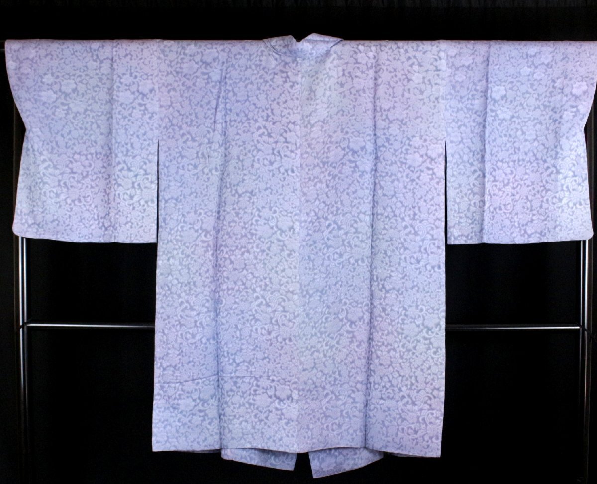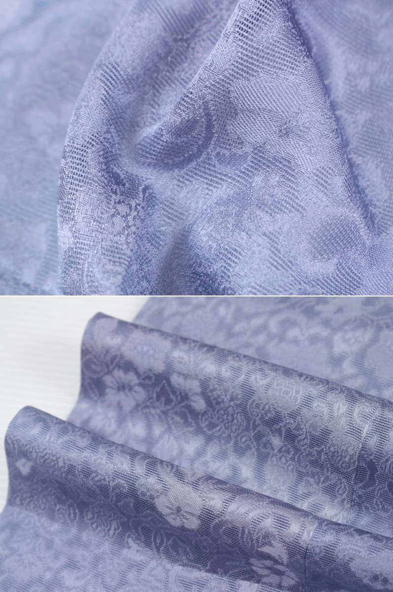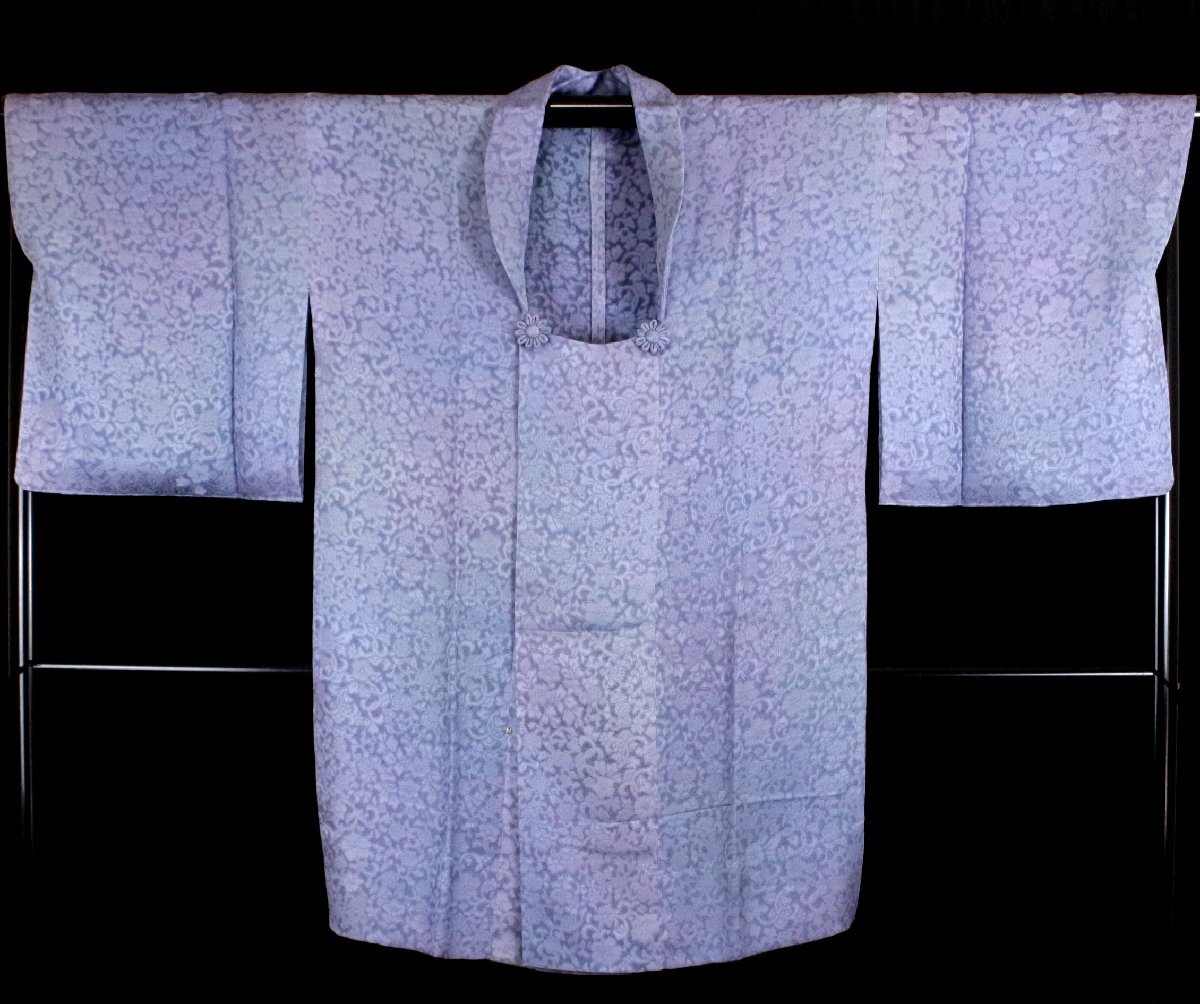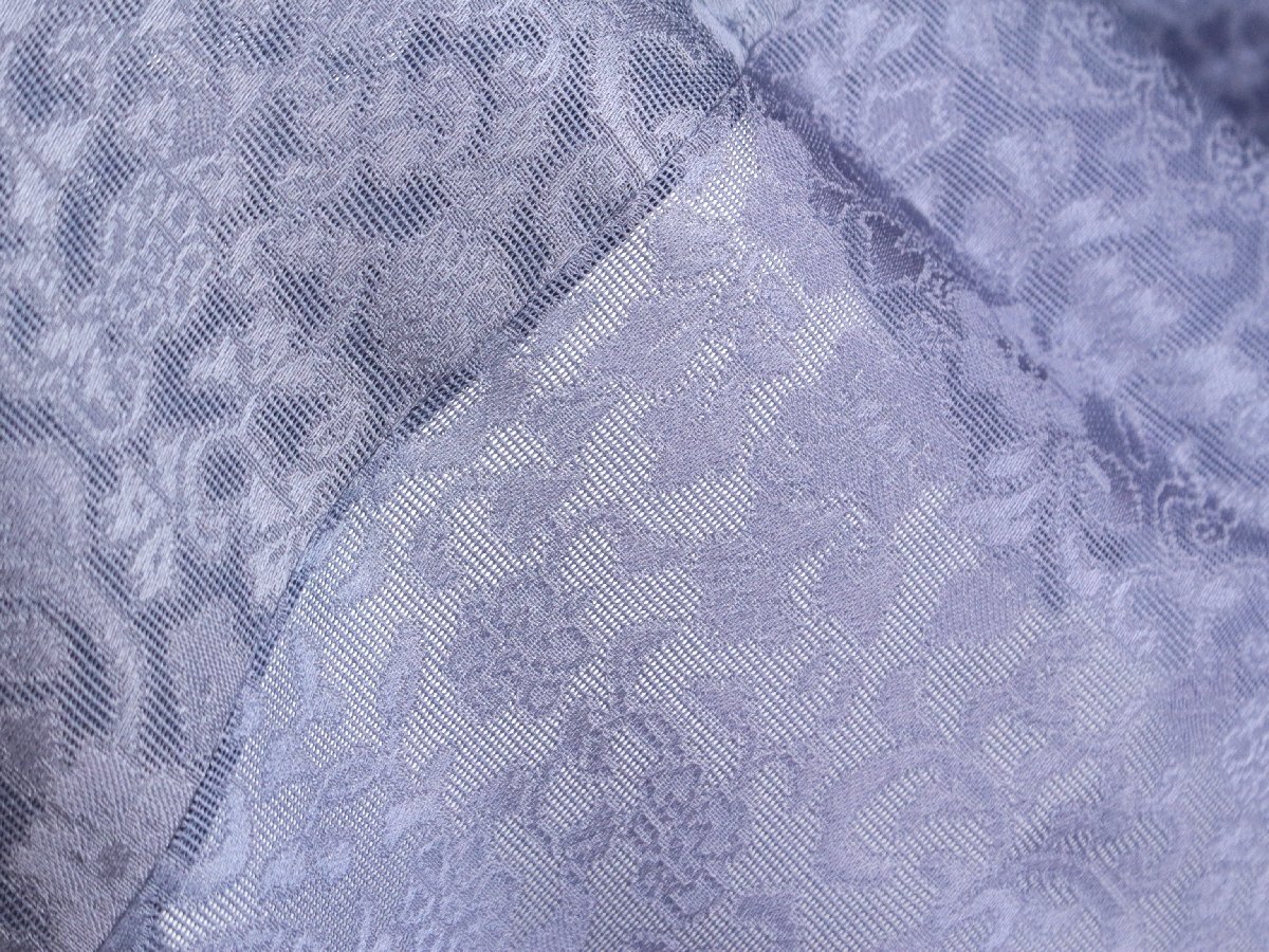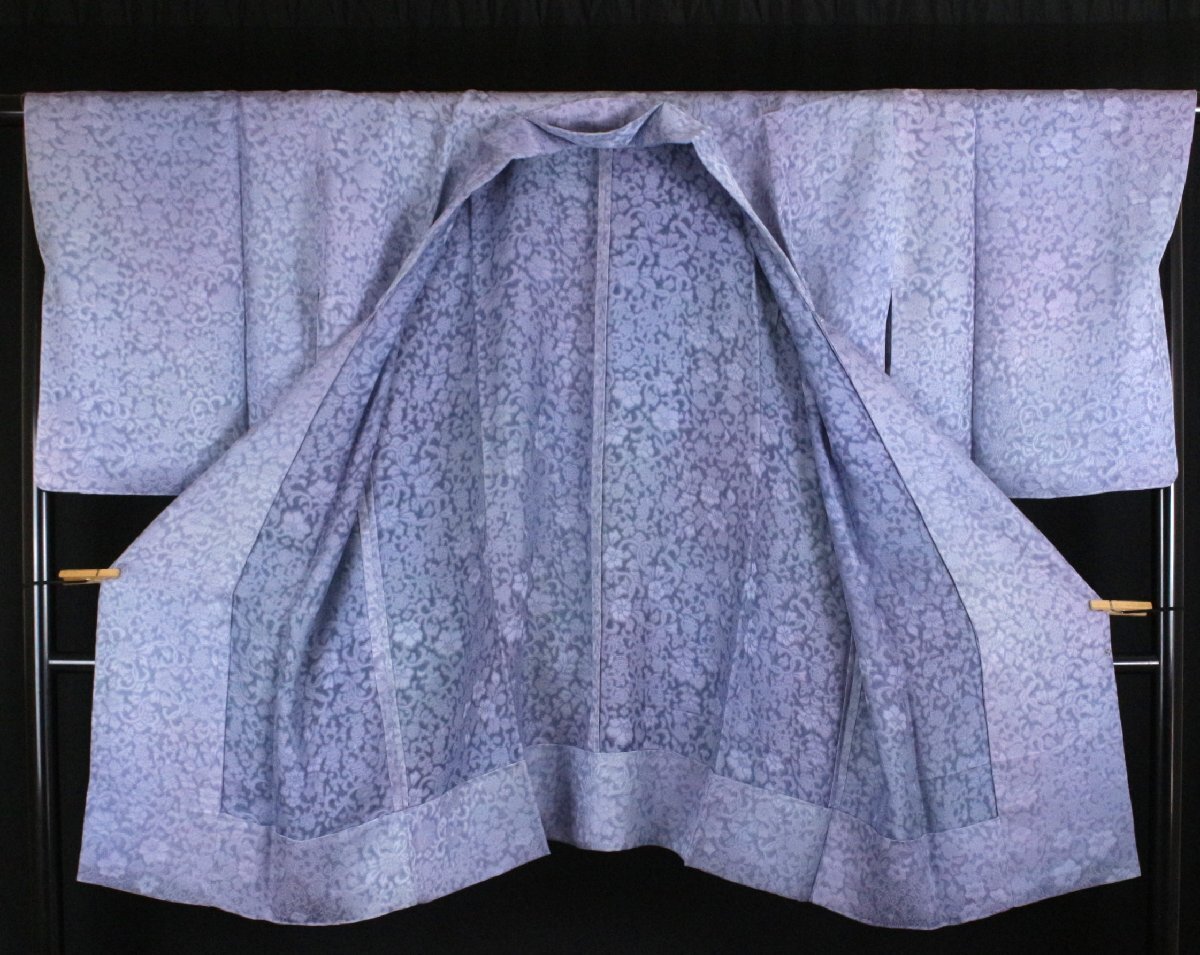 やわらかな色調と上品な地紋が魅力的な、唐草文様の道行コートのご紹介です。 淡い藤色を基調とした地に、繊細な唐草文様が全体に織り出され、奥行きのある優美な印象を与えます。 光の角度によって文様がほのかに浮かび上がり、装いにさりげない華やぎを添える意匠です。 衿元は柔らかなラインの被布衿仕立てで、首元を包み込むような優しい印象とともに、上品な雰囲気を演出。 季節を問わず羽織ることができ、晴れの日の外出やお茶席などにもふさわしい上質な道行コートです。 ※撮影時の部屋の照明によって画像の色に若干の差がございます。色味に差がございますことをご了承のうえご検討下さいませ。 …状態… 状態良好・仕付け糸あり ※全くの新品ではございませんので、記載のない変色やスレ、ヤケ、その他僅かな難がある場合がございます。そのような理由でのキャンセルはお受けできませんので、ご了承の上ご検討お願いいたします。 |