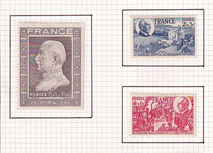 26 フランス【未使用】<「1944 SC#B175-B177 (付加金) フィリップ・ペタン元帥88歳記念」 3種完 on リーフ切取り >