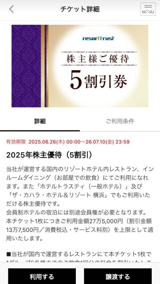 ■最新の「リゾートトラスト 株主優待 5割引券×2回分 」で1個セット60000円です。3個セット迄あります。