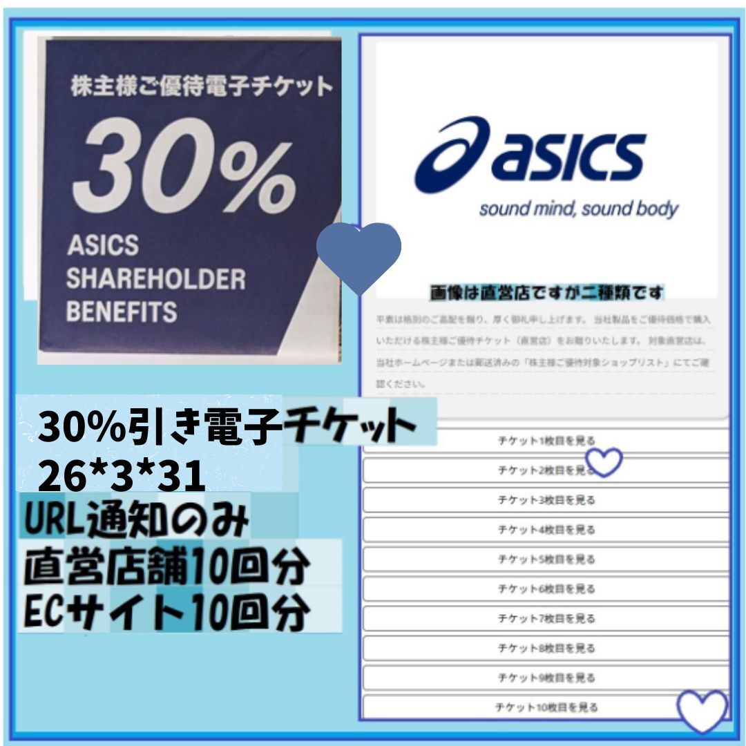20枚(直営店舗10枚+ECサイト10枚) アシックス asics 株主優待 30%割引 電子チケット 二つのURL通知 26*3*31 優待で頂き新品未使用安心