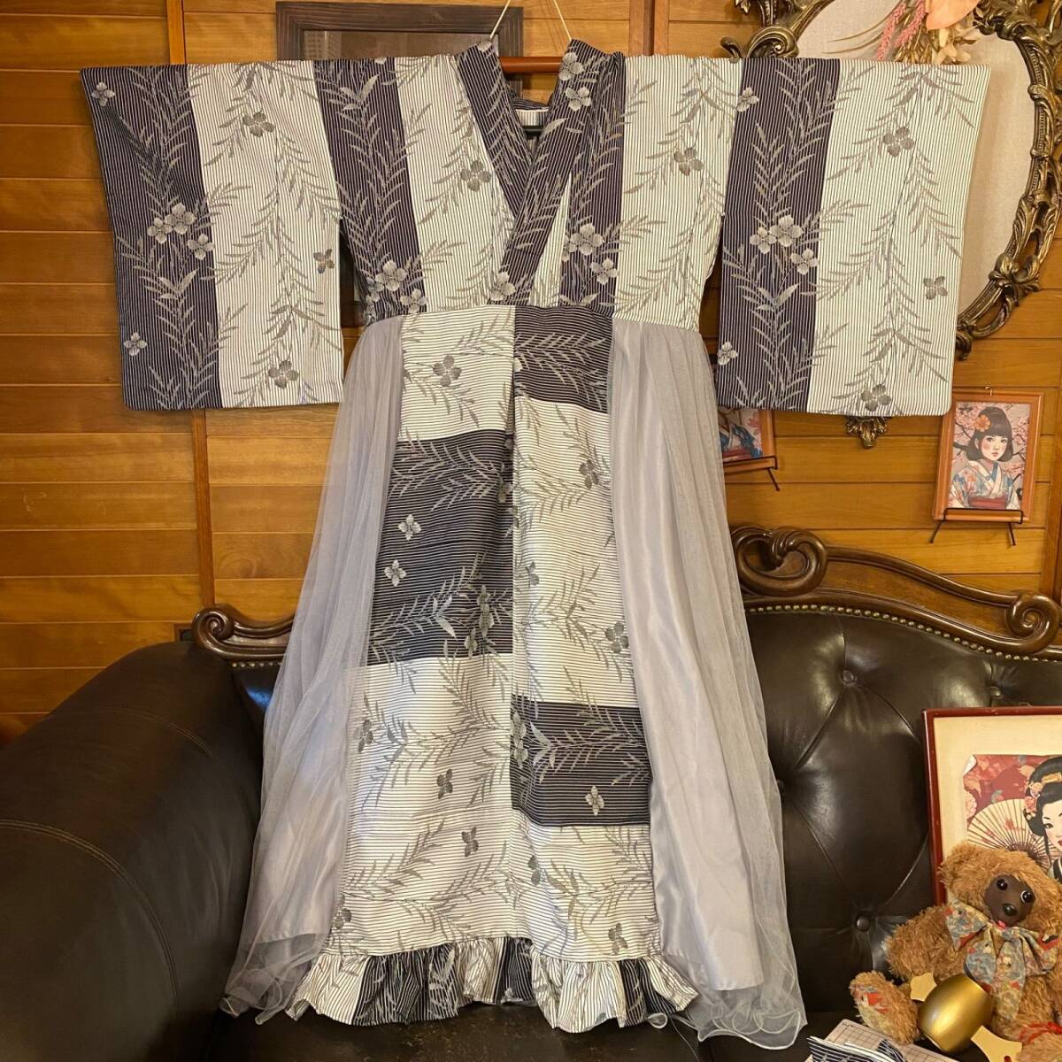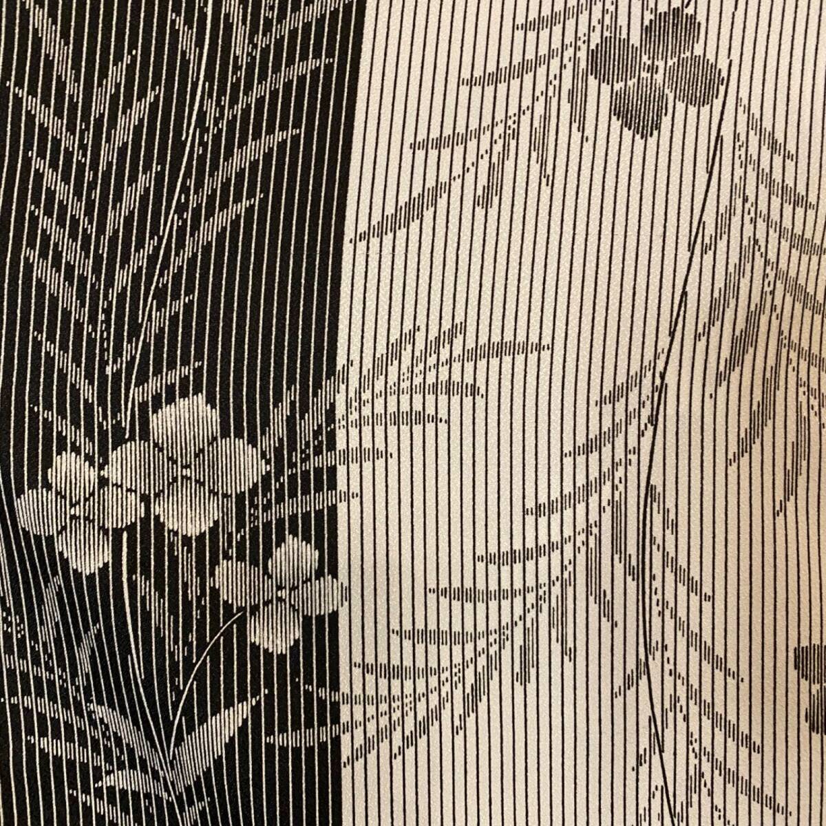 【 着物 ハンドメイド ワンピース ドレス 和洋折衷 コラージュ リメイク 切り替え レトロ 古着 墨黒に、薄墨色のボタニカル O-70 】
