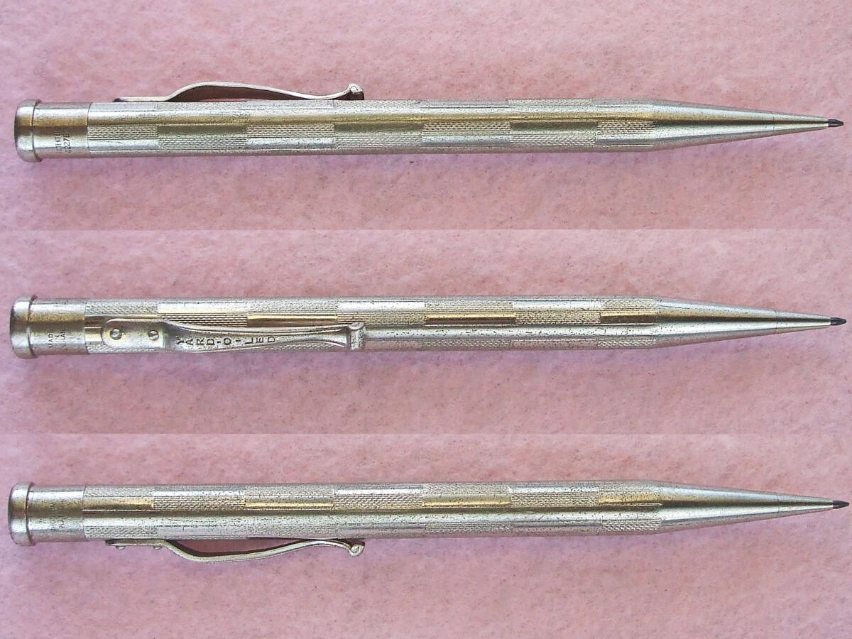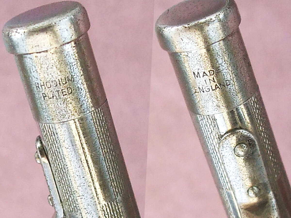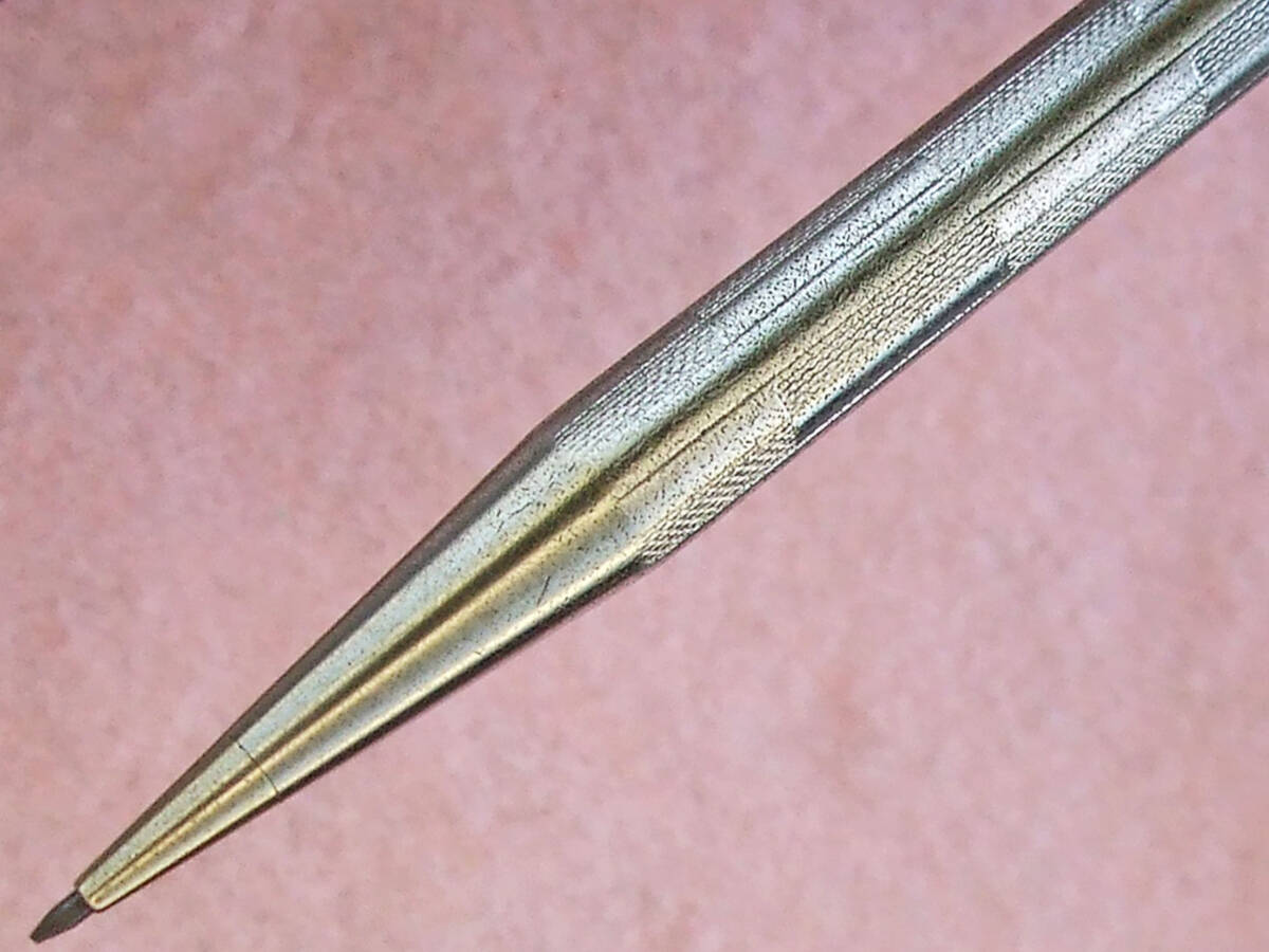 およそ70数年前のイギリス製 ヤード・オ・レッド ペンシル、ディプロマットモデルです。その時代を感じさせる美しいチェッカーパターン彫刻が施されたロディウムプレイテッドボディは独特な質感で手の中に収まります。全長約118mm。 1.18mm芯使用。替芯数本収納。繰り出し式機能確認済み。 猫足クリップに YARD O LED、キャップに RHODIUM PLATED、MADE IN ENGLAND、パテントナンバー PATENT .No.422767 の刻印が残ってます。細かいスレキズ、メッキ剥げ等使用感が強く見られますが実用筆記に問題ございません。以上ご了承いただける方の入札をお待ちしいます。150年間オリジナルデザインを守りすべて手造りにより製造されてきたヴィンテージ・ブリティッシュペンシル。日々の実用に、ヤードオレッドコレクターの方いかがでしょうか。発送はレターパックライト430円を予定しています。