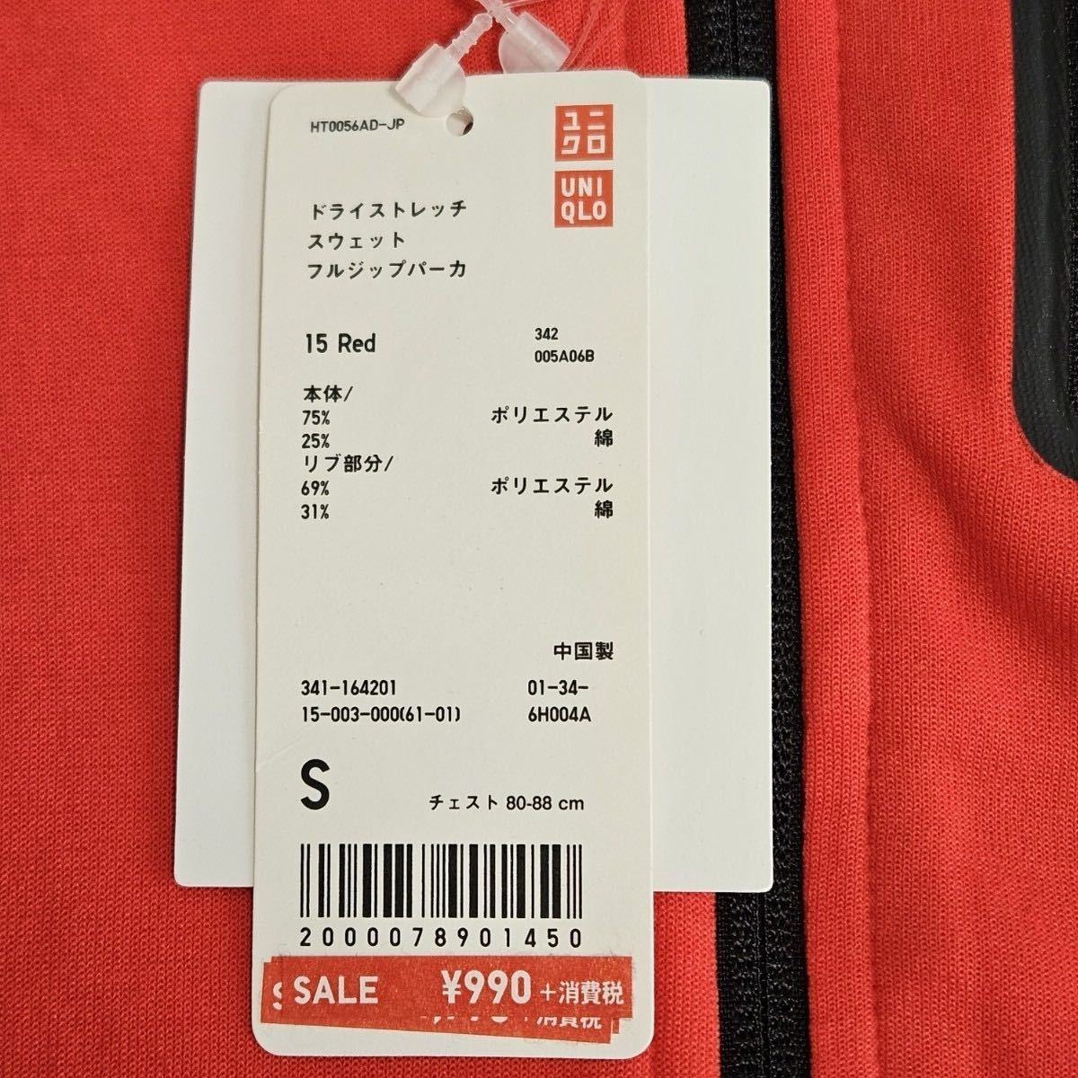 未使用品☆UNIQLO☆ユニクロ☆ドライストレッチスウェットフルジップパーカー☆パーカー☆スウェット☆メンズ☆サイズS☆15/Red
