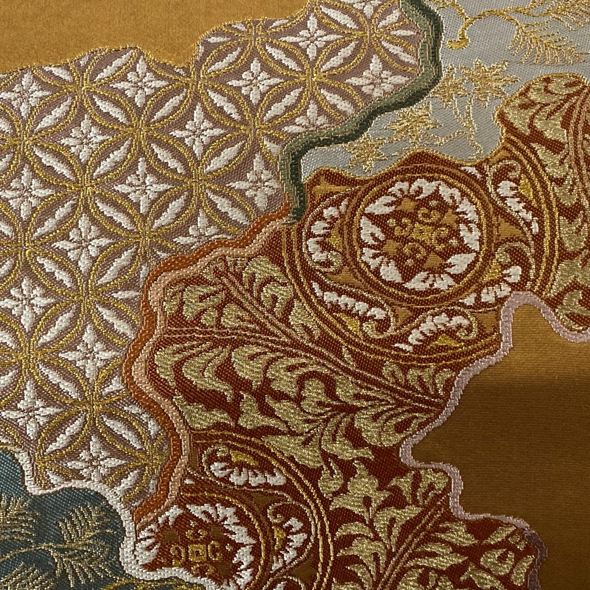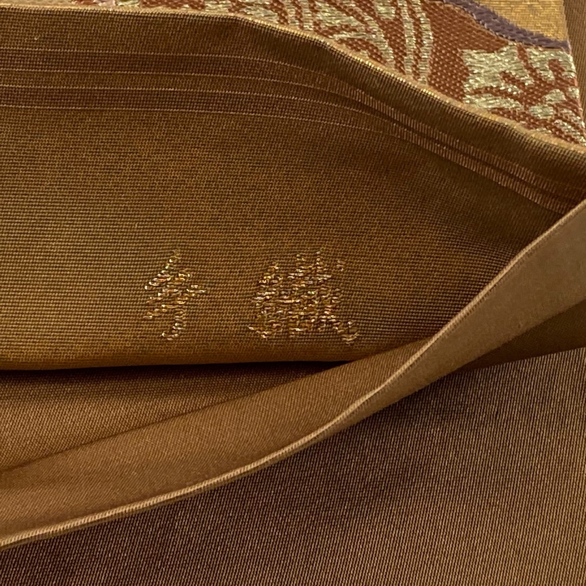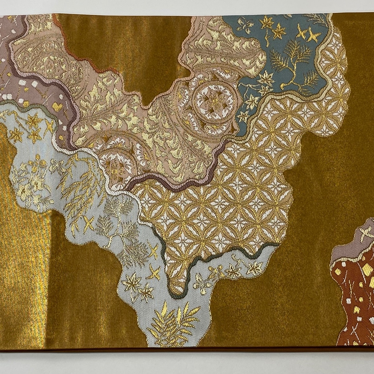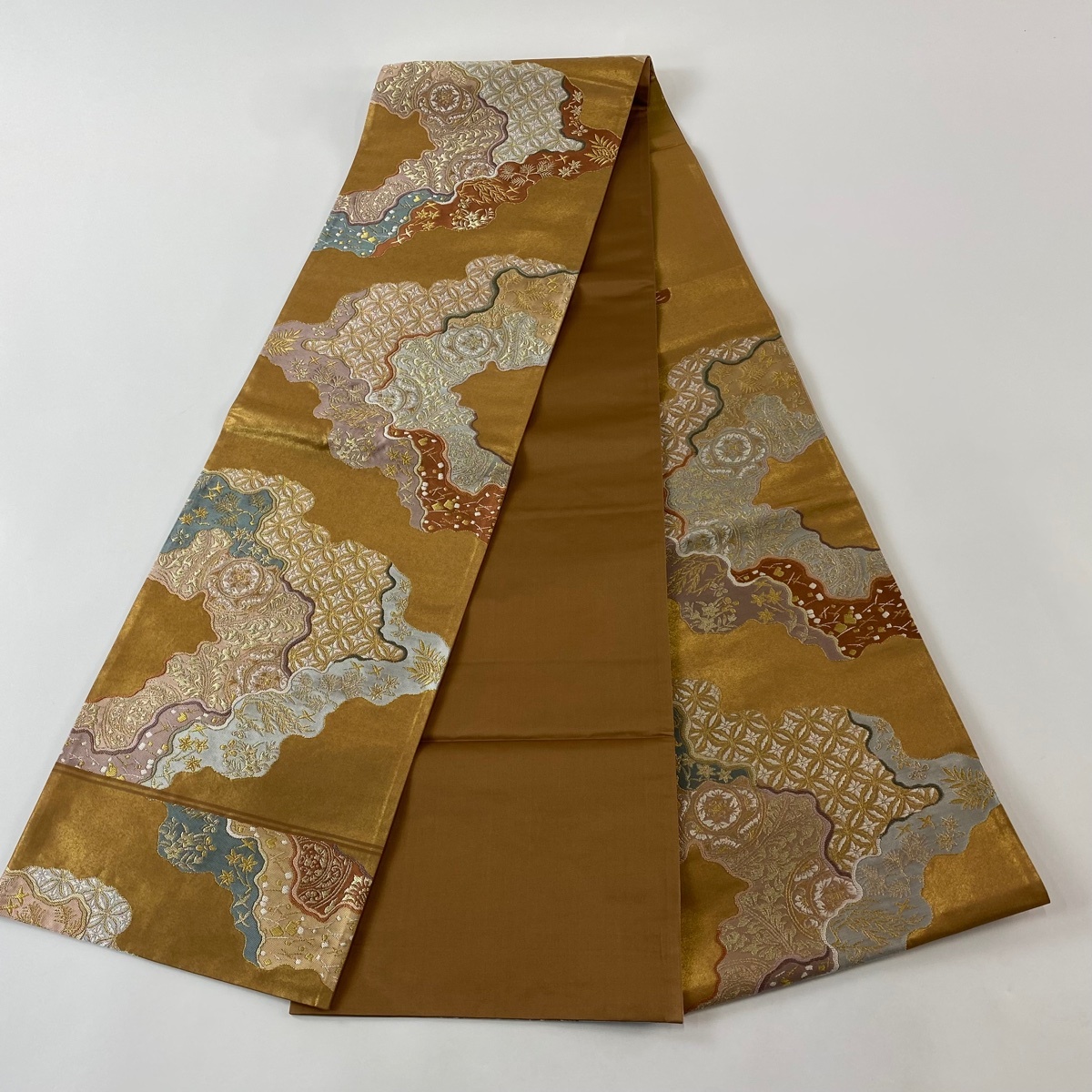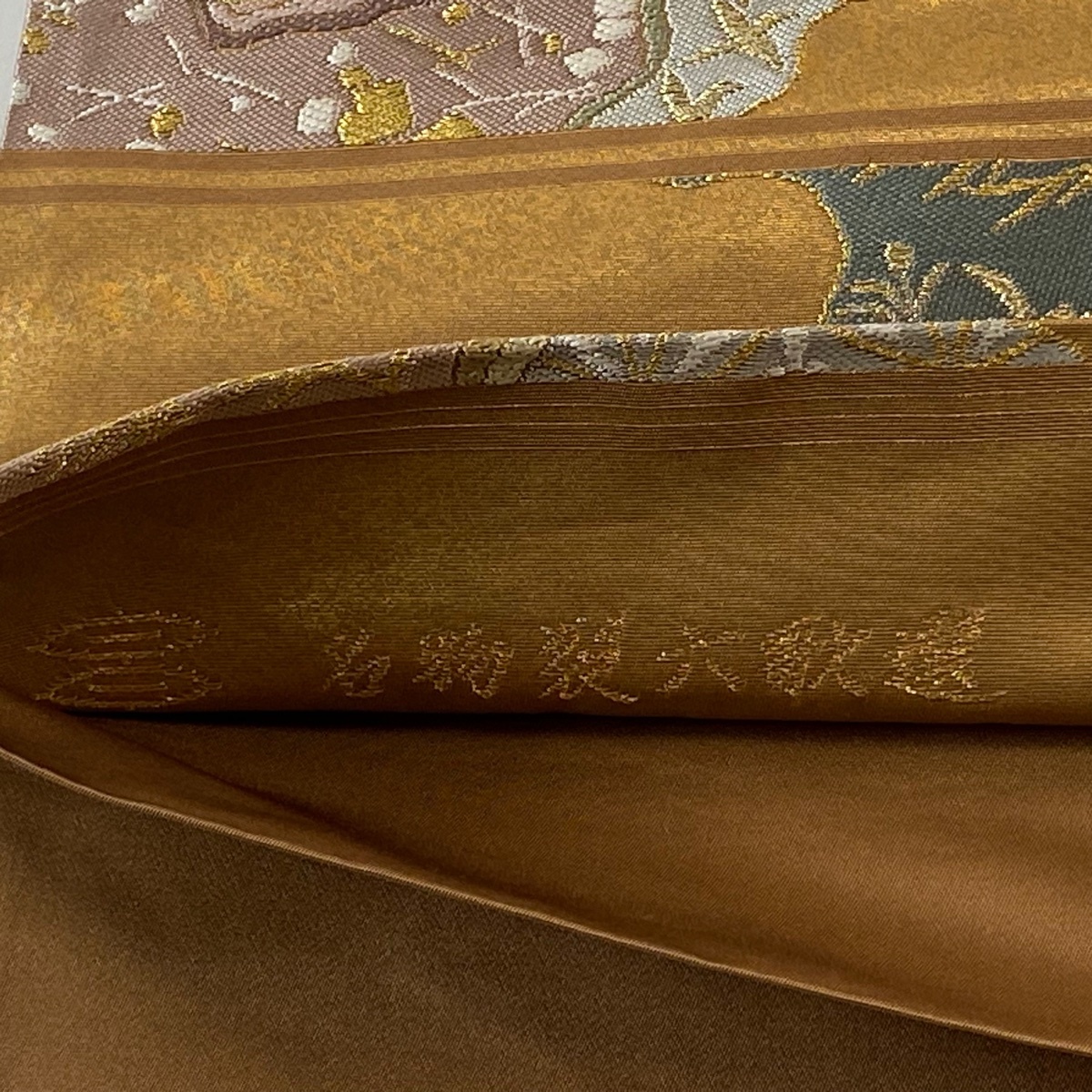 | 袋帯 美品 逸品 河村織物 落款 道長取 名物裂六歌選 金糸 箔 金茶 六通 正絹 【中古】 |