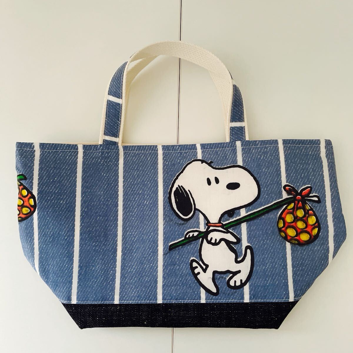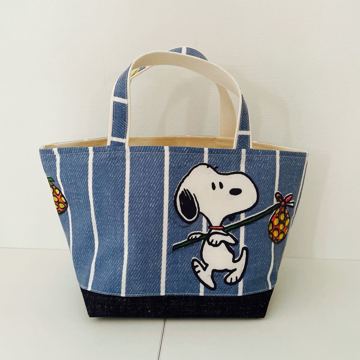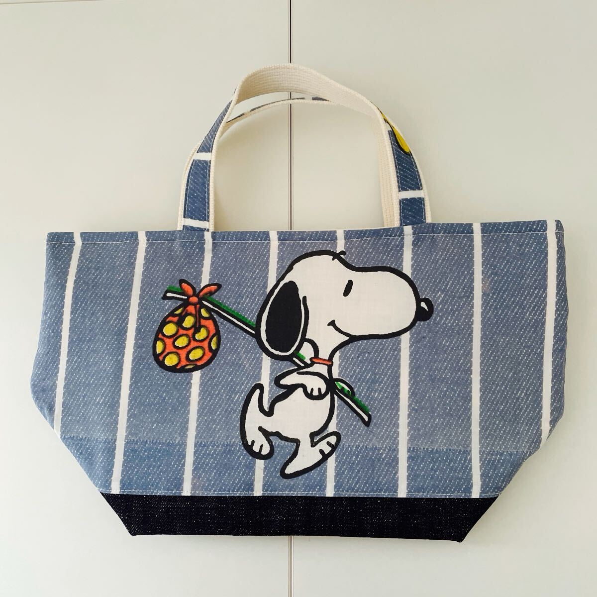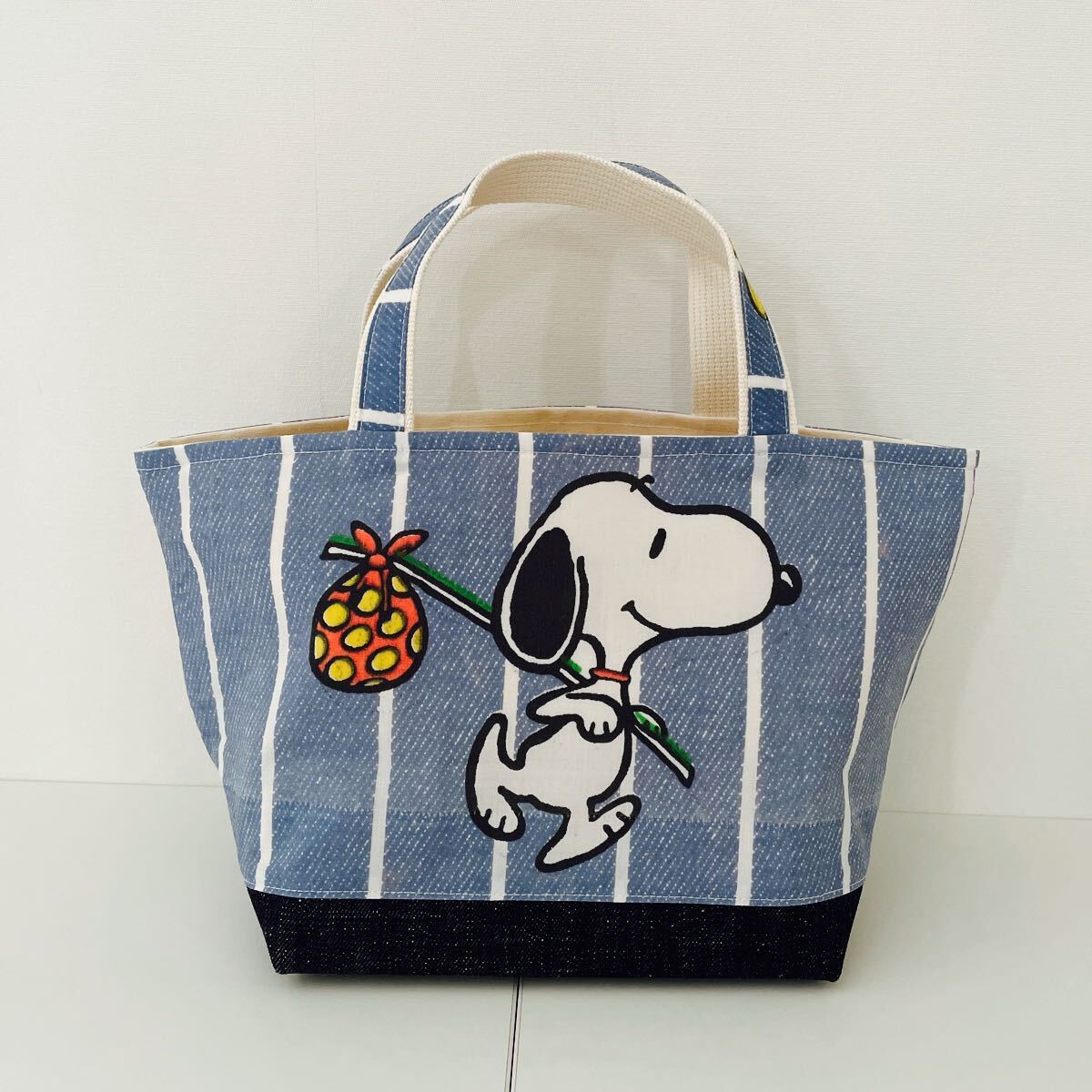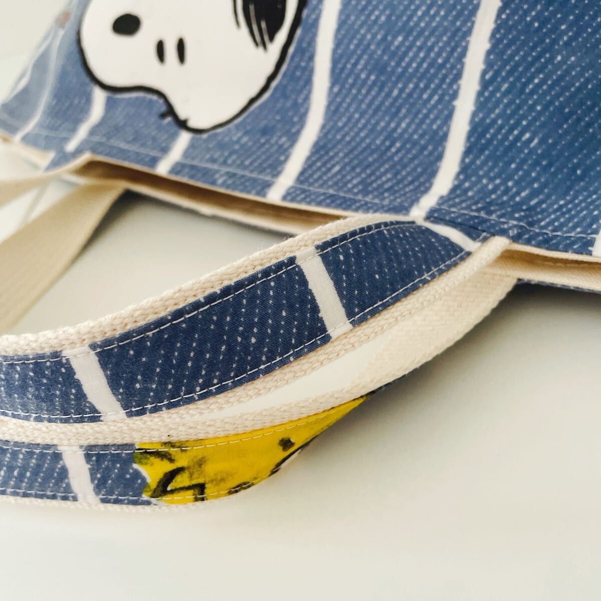 スヌーピーのユーズドシーツをリメイクしたマチの大きいトートバッグです。