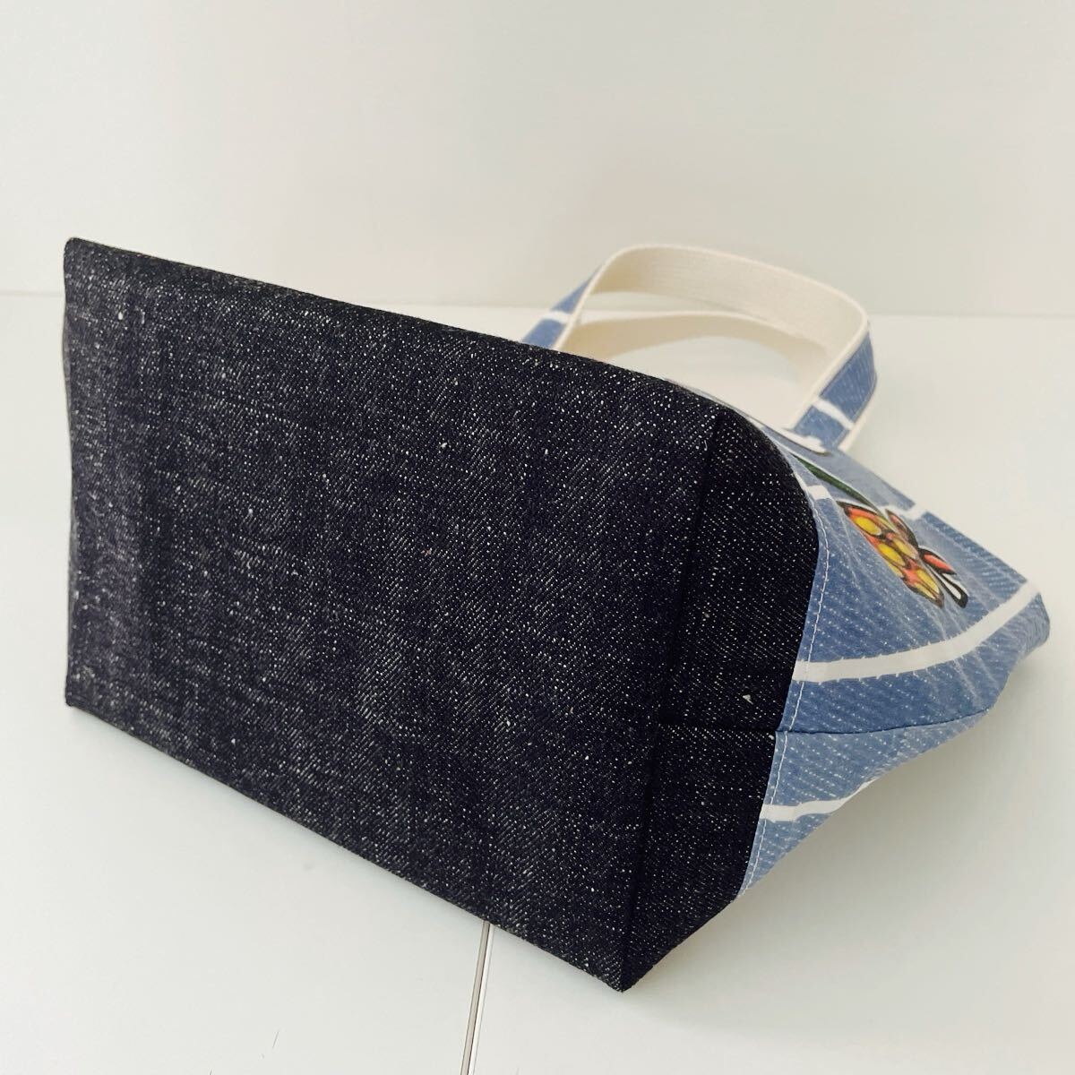 底の部分には厚手のデニムを使用し、裏地は帆布(キャンパス生地)を使用しています。