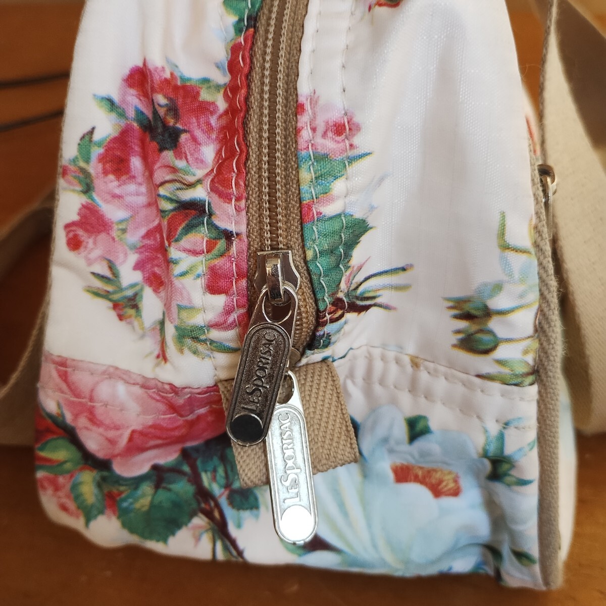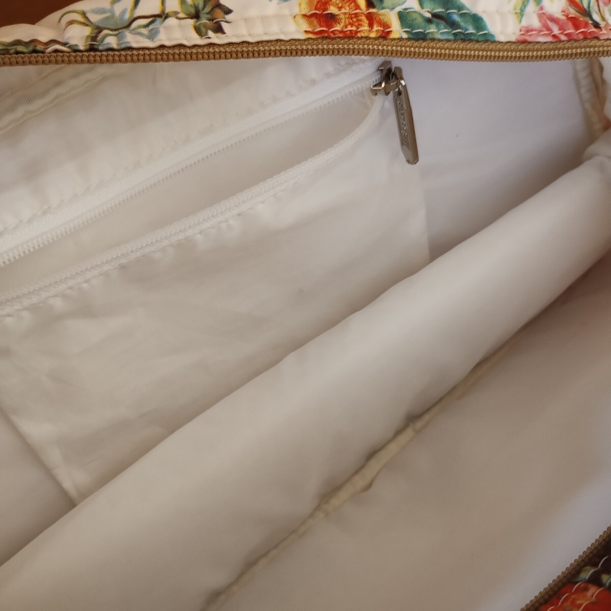 外ファスナーの下のロゴプリントが薄くなっていますが、汚れや剥げ、内側のベタ付きはありません。