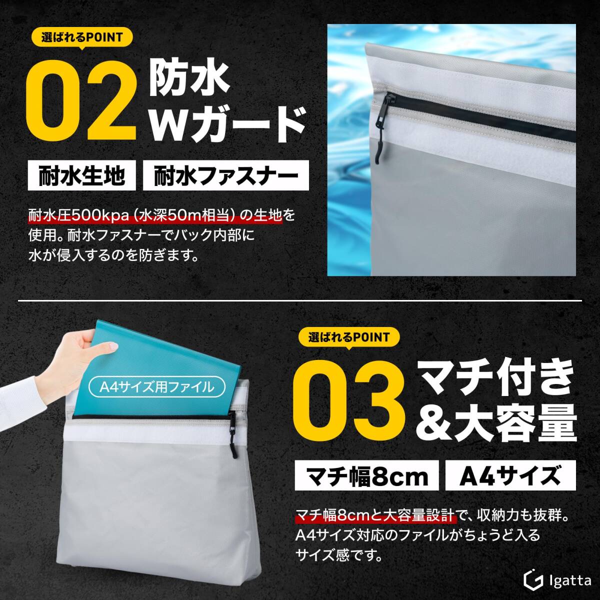 ?【防水Wガード】水深50m以上対応の、耐水圧500kpaの生地を使用。耐水ファスナーで、水害時にバック内部に水が侵入するのをしっかりと防ぎます。