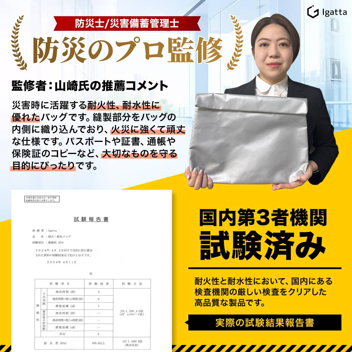 ?【もしもの時の対策に】火災や水害から大切な貴重品を守る、防災士/災害備蓄管理士監修のセーフティバックです。耐火性と耐水性において、国内にある検査機関の厳しい検査をクリア済み。