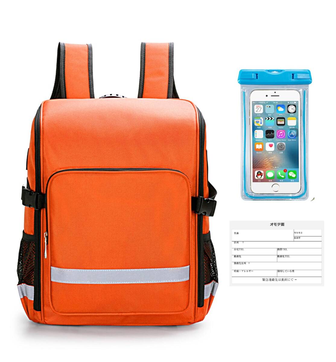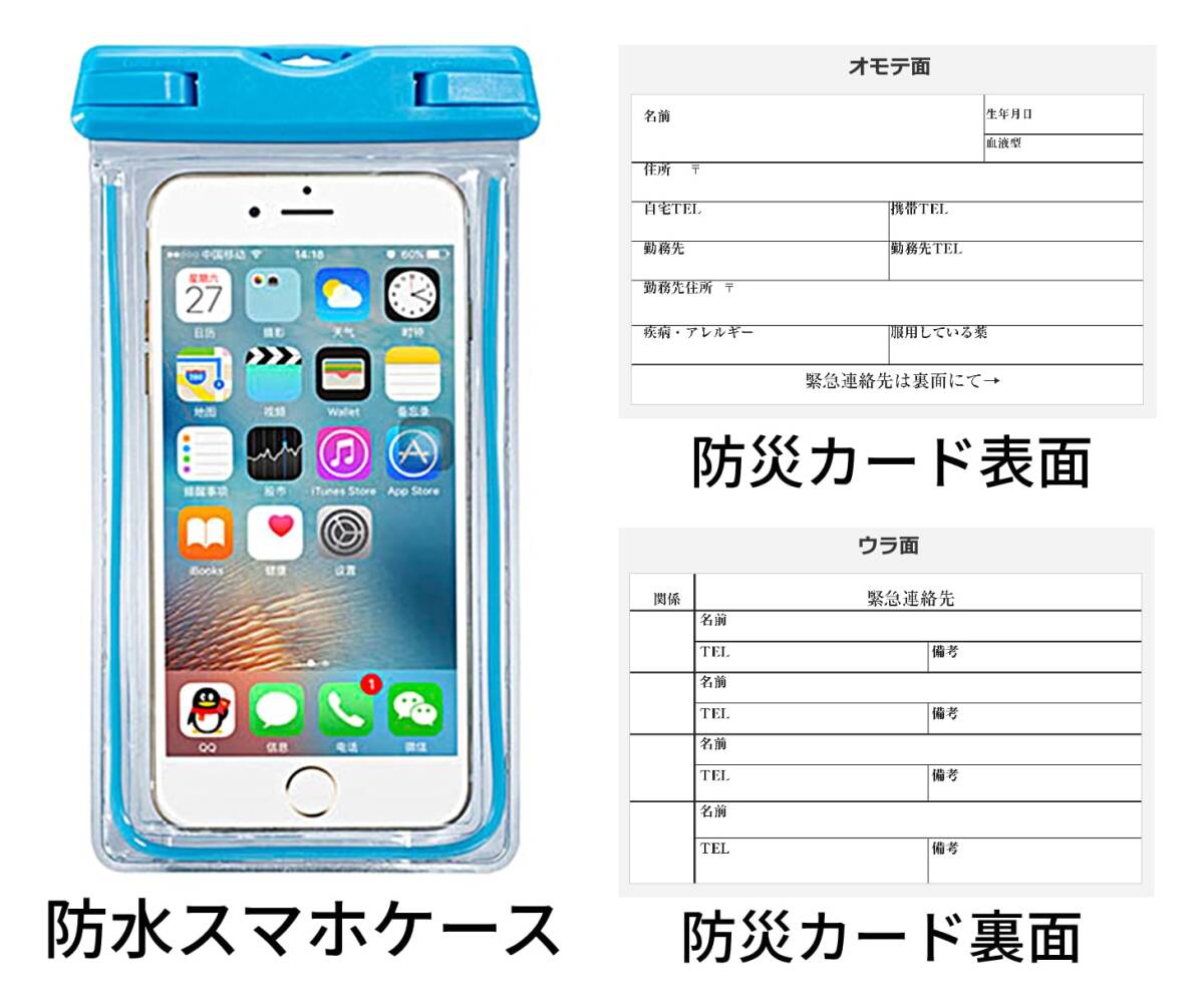 付属品として、防災カードと防水スマホケースの2種類をセットとして販売します。防水スマホケースはカラーはランダムになります。