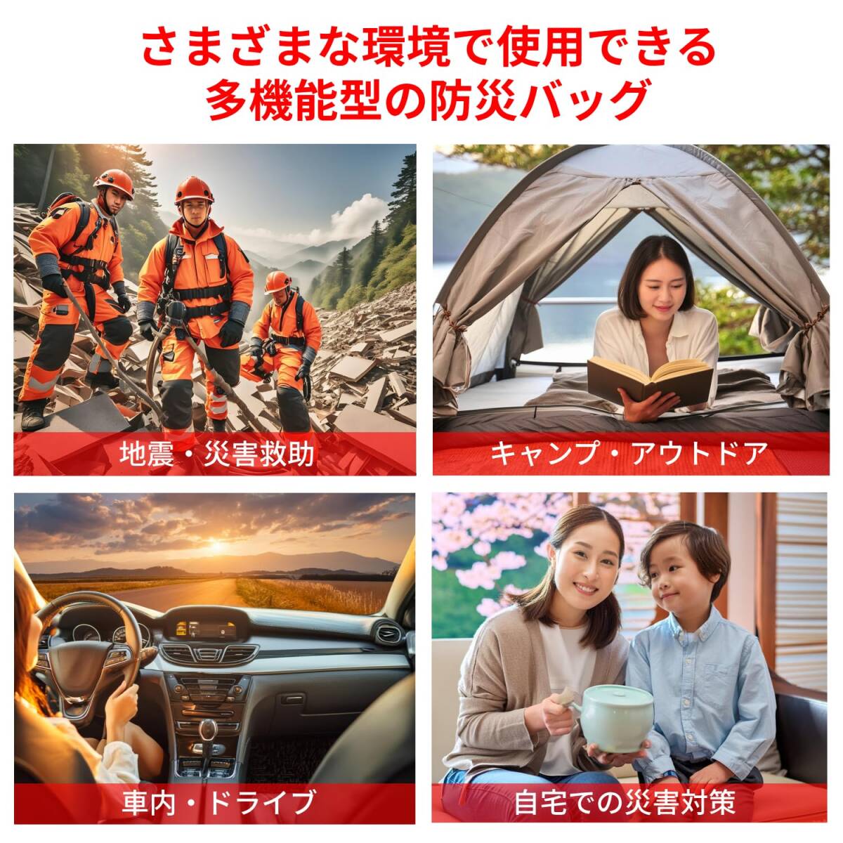 災害用、避難所生活、キャンプ、アウトドア、ドライブ、介護、医療、通勤通学、子供用、と幅広い場面で使用できる多機能のバッグとなります。