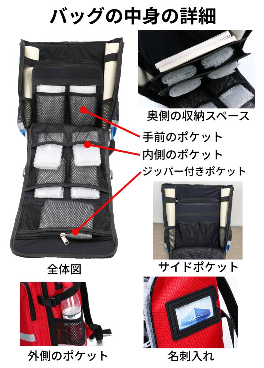 バッグの内部は多数のポケットがあり、着替え、化粧品、貴重品、医療道具、デバイスなどを入れることが出来ます。災害時の救助や支援の道具や食料を入れる事が出来ます。ポケットの外側は衣類なども入れられます。