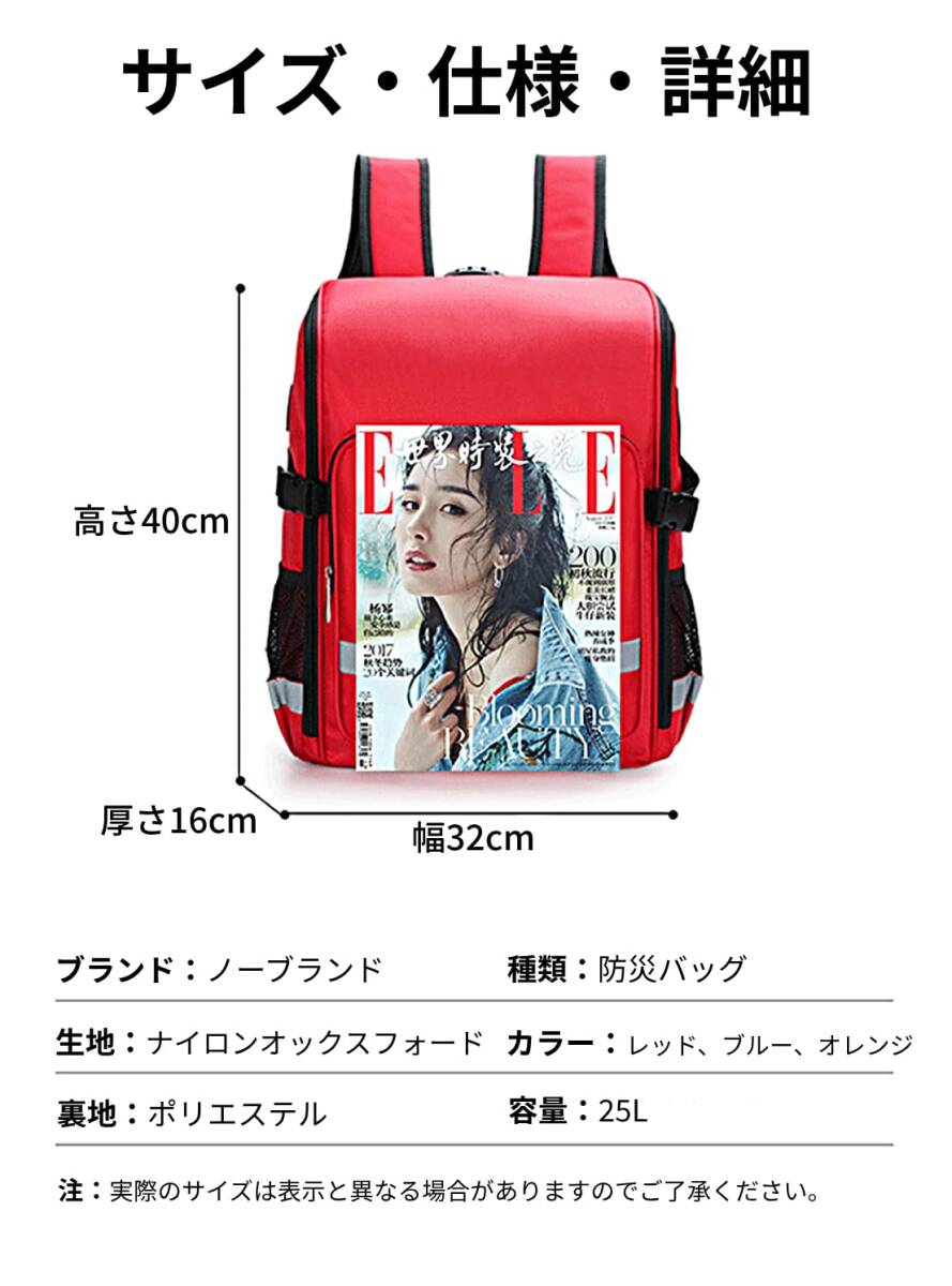 防水性、耐火性ともに備えたバッグであり、災害時に火災や水害からバッグの中身を守る事が出来ます。 バッグの内部は多数のポケットがあり、着替え、化粧品、貴重品、医療道具、デバイスなどを入れることが出来ます。災害時の救助や支援の道具や食料を入れる事が出来ます。ポケットの外側は衣類なども入れられます。