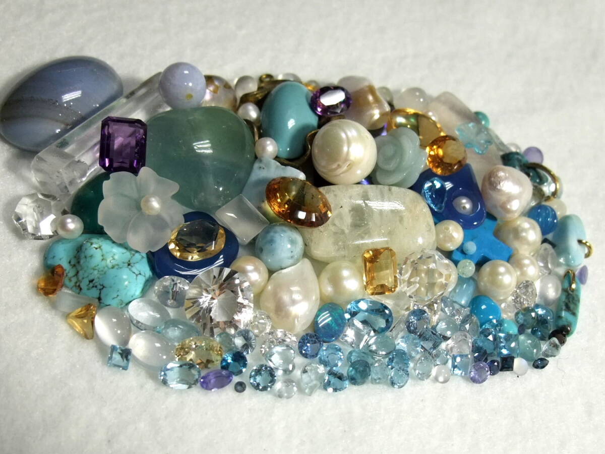 宝飾用カットルースやカボッション色々pearl淡水真珠アコヤ真珠水晶ムーンストーンmoonstoneアクアマリンaquamarineブルートパーズbluetopazアマゾナイトioliteアイオライトシトリンクォーツ水晶系ターコイズアゲートカルセドニー系、ターコイズラリマーその他色々と、極小のメレ等少しですがサファイアsapphireもあり♪水色系~クリア色系メイン☆その他等も色々たくさん☆様々色々大量まとめてカラーパワーストーンお守り製作や魔除け厄除け開運グッズにも☆