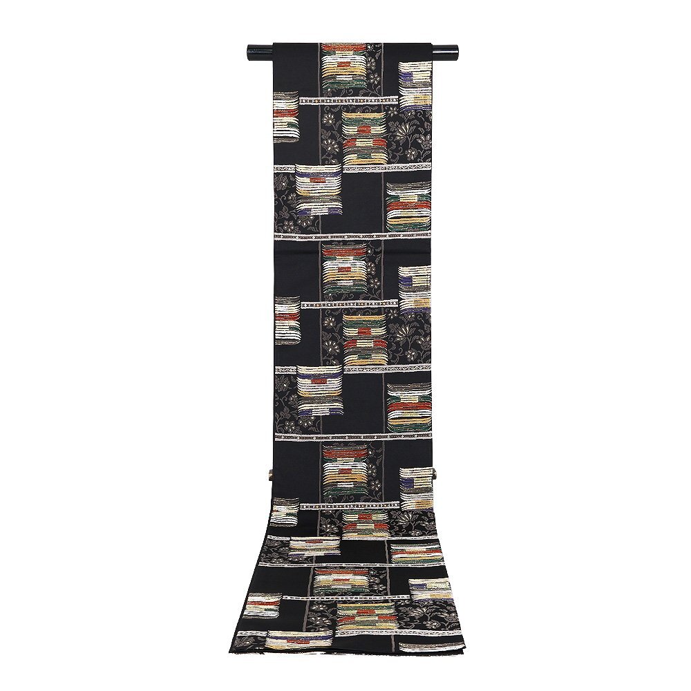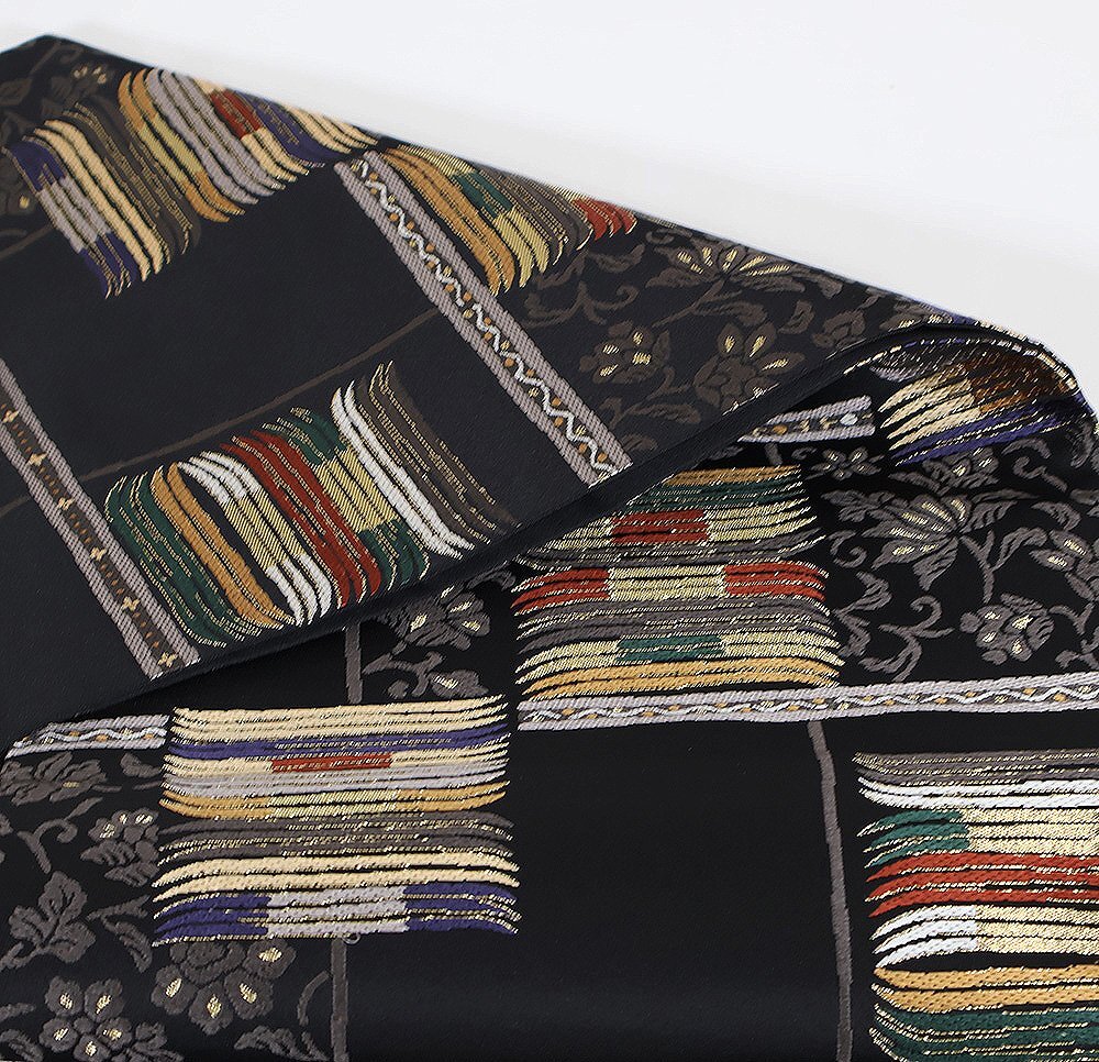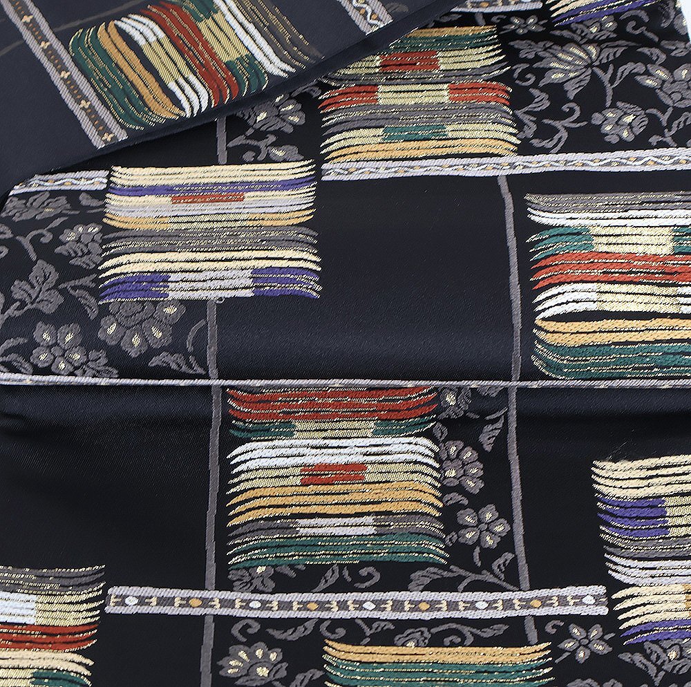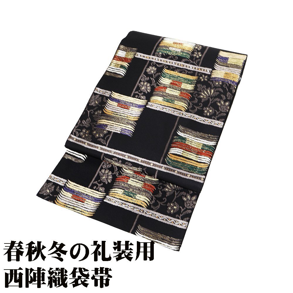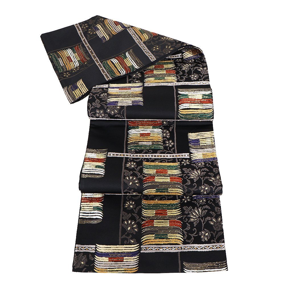 | 西陣織袋帯 黒地 鎧文・唐花 未使用品 仕立て上がり |